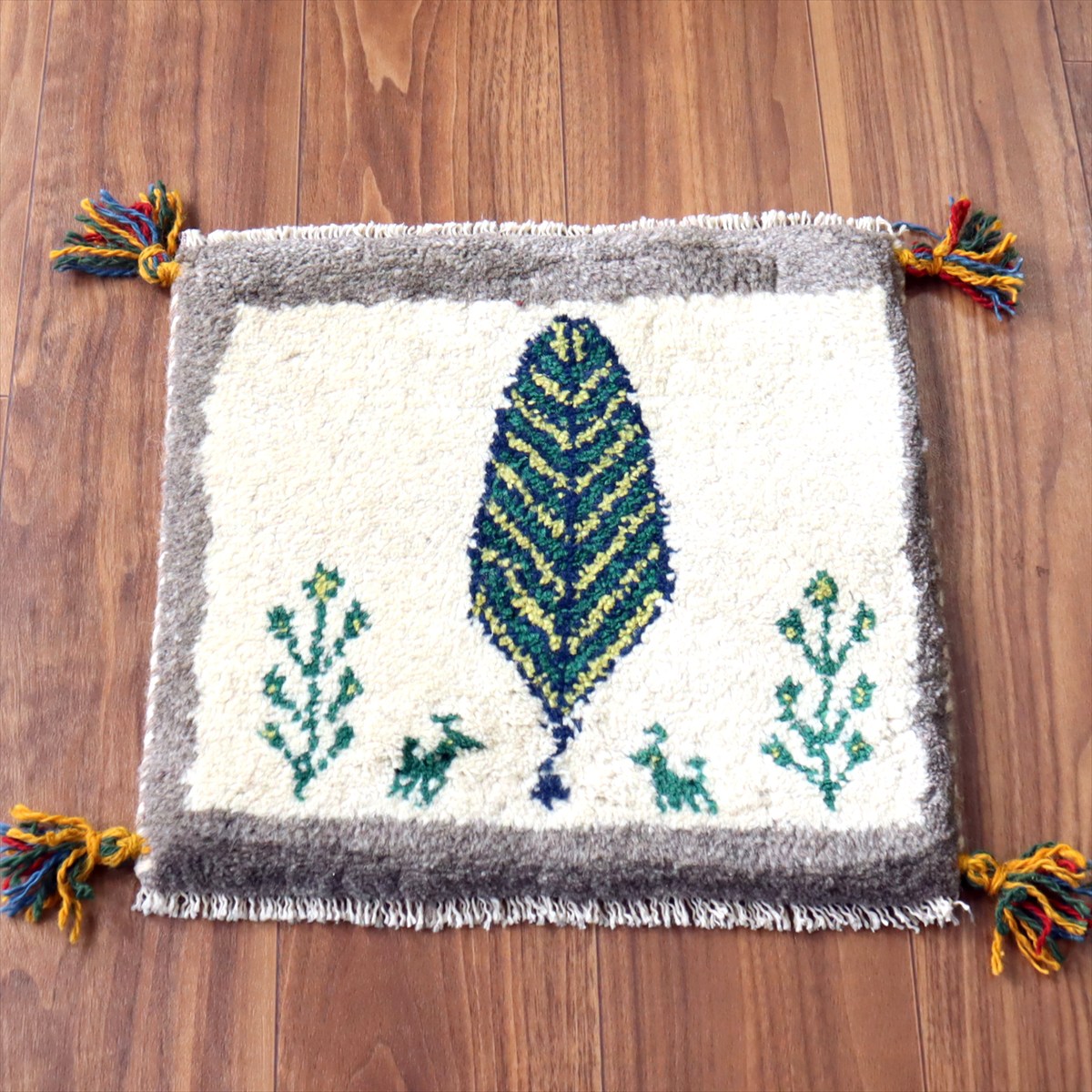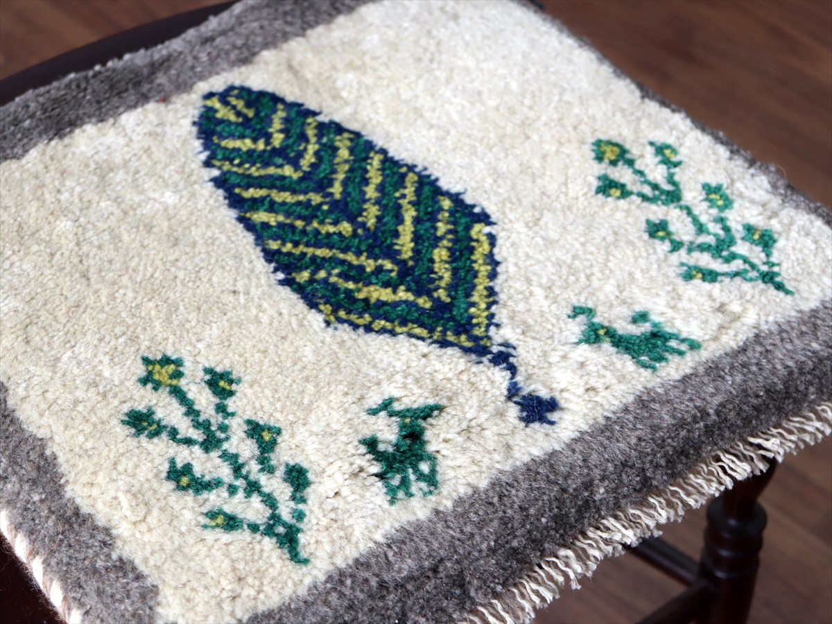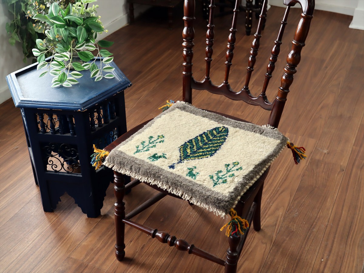 何枚も集めたくなる、40cm角の座布団サイズギャベ。四隅に大きなポンポンのついた、伝統的なスタイルで織られています。フローリングに並べて座布団がわりに使ったり、ベンチやダイニングチェアの座面など、使い方はいろいろ。壁にタペストリーのように飾るのもおすすめです。