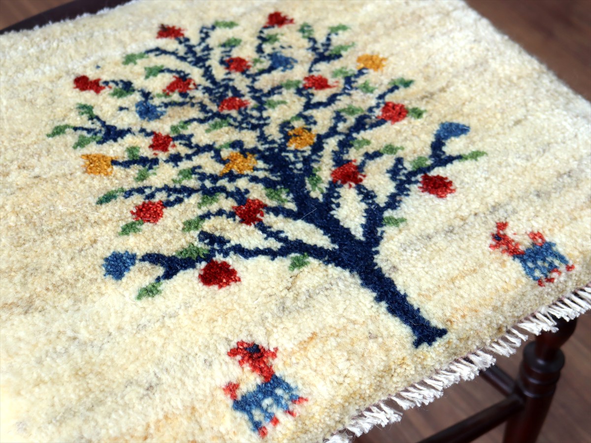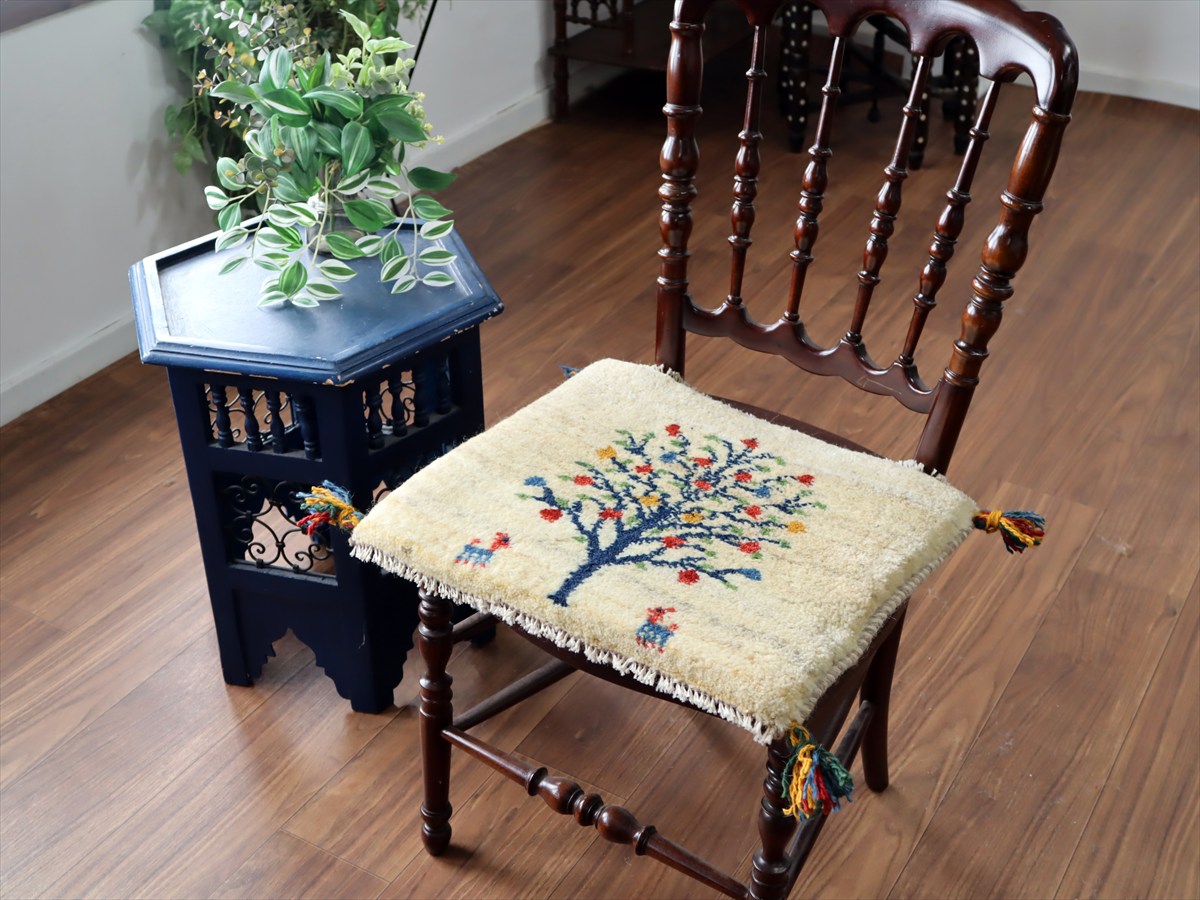 何枚も集めたくなる、40cm角の座布団サイズギャベ。四隅に大きなポンポンのついた、伝統的なスタイルで織られています。フローリングに並べて座布団がわりに使ったり、ベンチやダイニングチェアの座面など、使い方はいろいろ。壁にタペストリーのように飾るのもおすすめです。