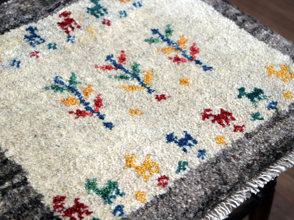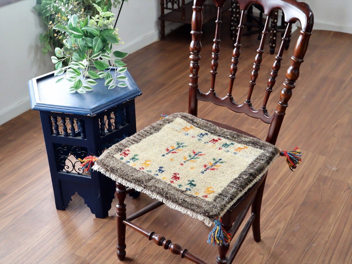 何枚も集めたくなる、40cm角の座布団サイズギャベ。四隅に大きなポンポンのついた、伝統的なスタイルで織られています。フローリングに並べて座布団がわりに使ったり、ベンチやダイニングチェアの座面など、使い方はいろいろ。壁にタペストリーのように飾るのもおすすめです。