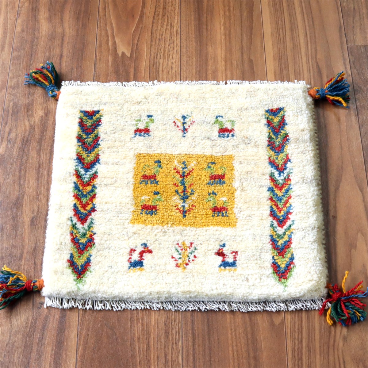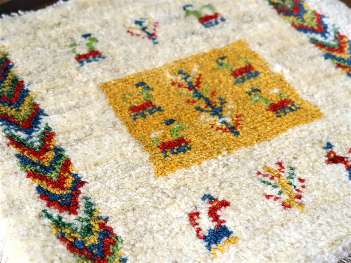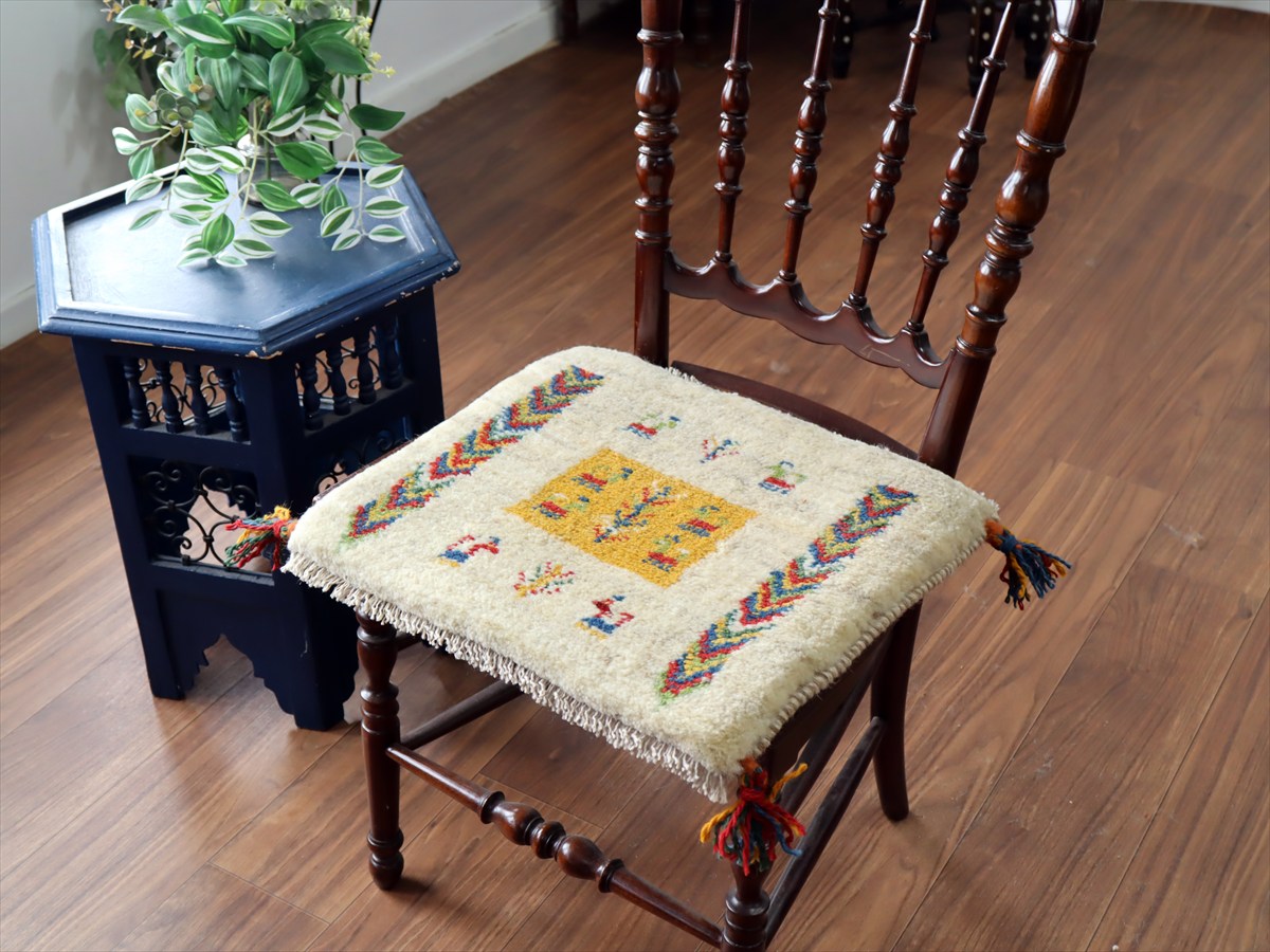 何枚も集めたくなる、40cm角の座布団サイズギャベ。四隅に大きなポンポンのついた、伝統的なスタイルで織られています。フローリングに並べて座布団がわりに使ったり、ベンチやダイニングチェアの座面など、使い方はいろいろ。壁にタペストリーのように飾るのもおすすめです。
