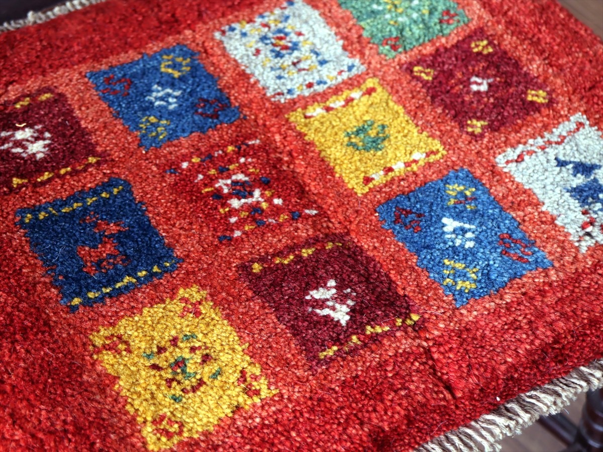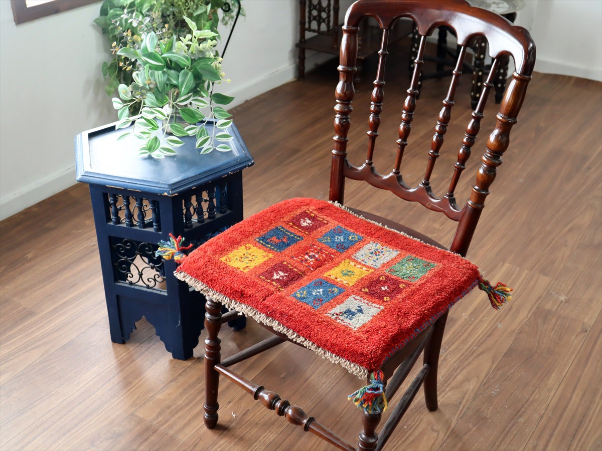 何枚も集めたくなる、40cm角の座布団サイズギャベ。四隅に大きなポンポンのついた、伝統的なスタイルで織られています。フローリングに並べて座布団がわりに使ったり、ベンチやダイニングチェアの座面など、使い方はいろいろ。壁にタペストリーのように飾るのもおすすめです。
