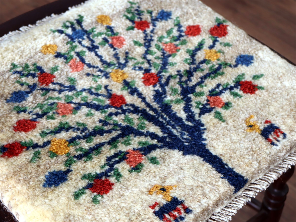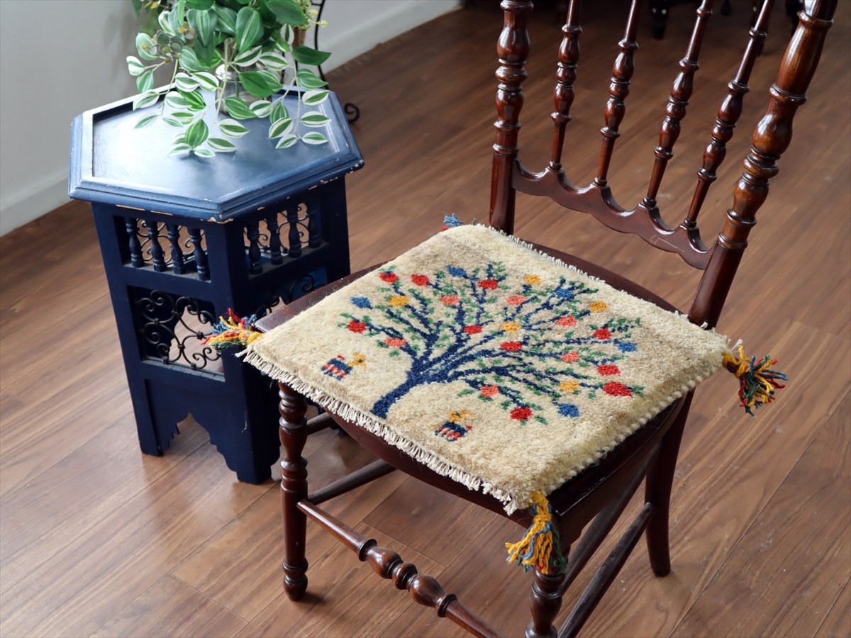 何枚も集めたくなる、40cm角の座布団サイズギャベ。四隅に大きなポンポンのついた、伝統的なスタイルで織られています。フローリングに並べて座布団がわりに使ったり、ベンチやダイニングチェアの座面など、使い方はいろいろ。壁にタペストリーのように飾るのもおすすめです。
