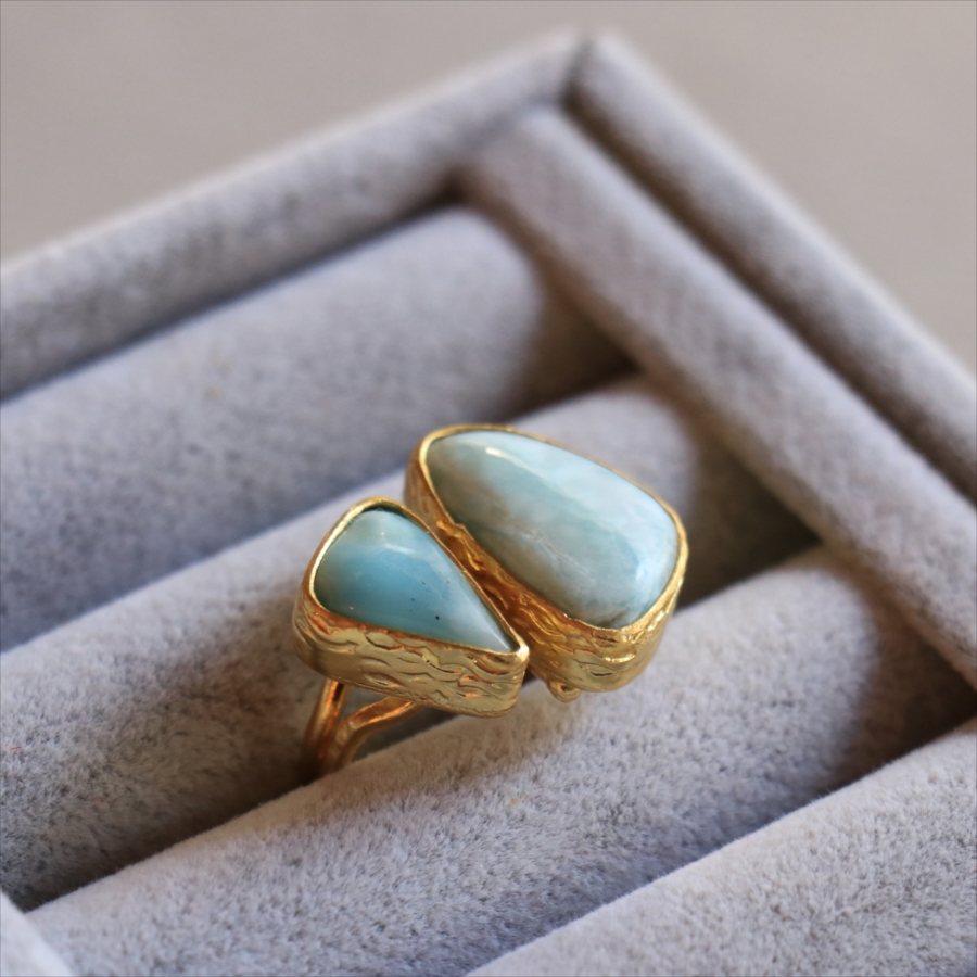 海に映る雲のような模様が広がる、優しいブルーが美しいラリマーダブルリングです。、大粒のラリマーに寄り添うような小さなラリマー。その絶妙なバランスは、シンプルでいて印象的に手元を美しくみせてくれます。