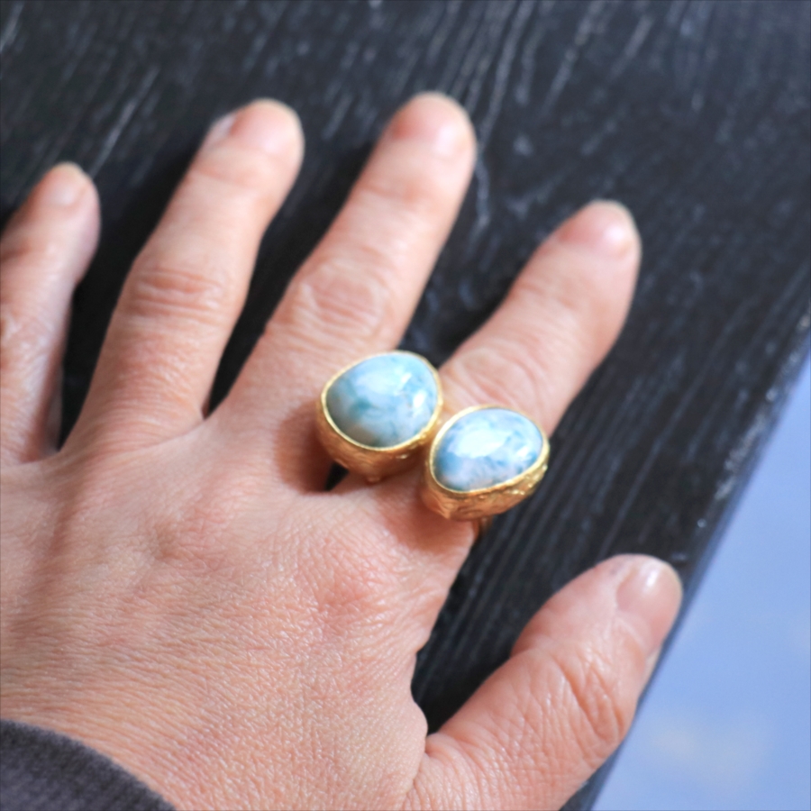 海に映る雲のような模様が広がる、優しいブルーが美しいラリマーダブルリングです。形の違うふたつの石が寄り添うように並ぶデザイン。大粒で立体感があり、シンプルながらも個性的が光る一点ものジュエリーです。