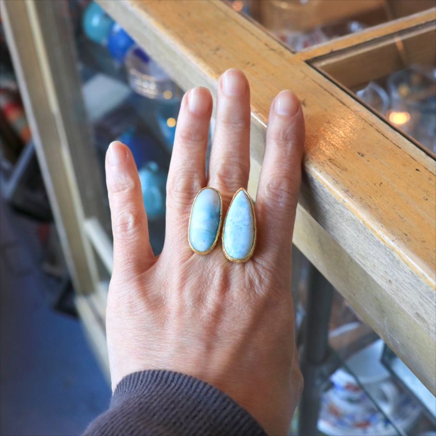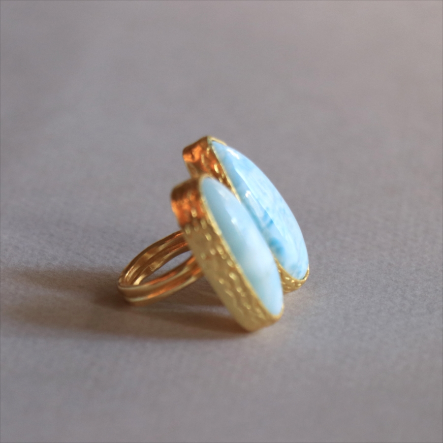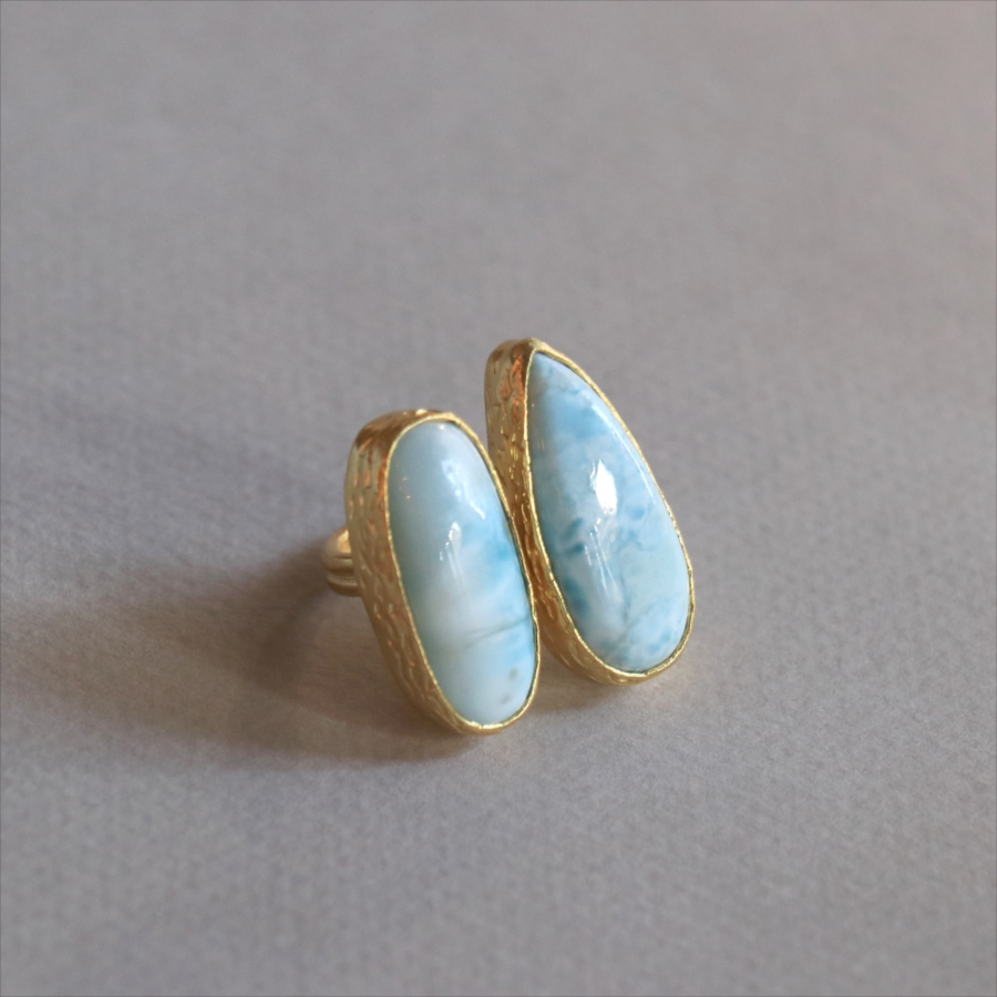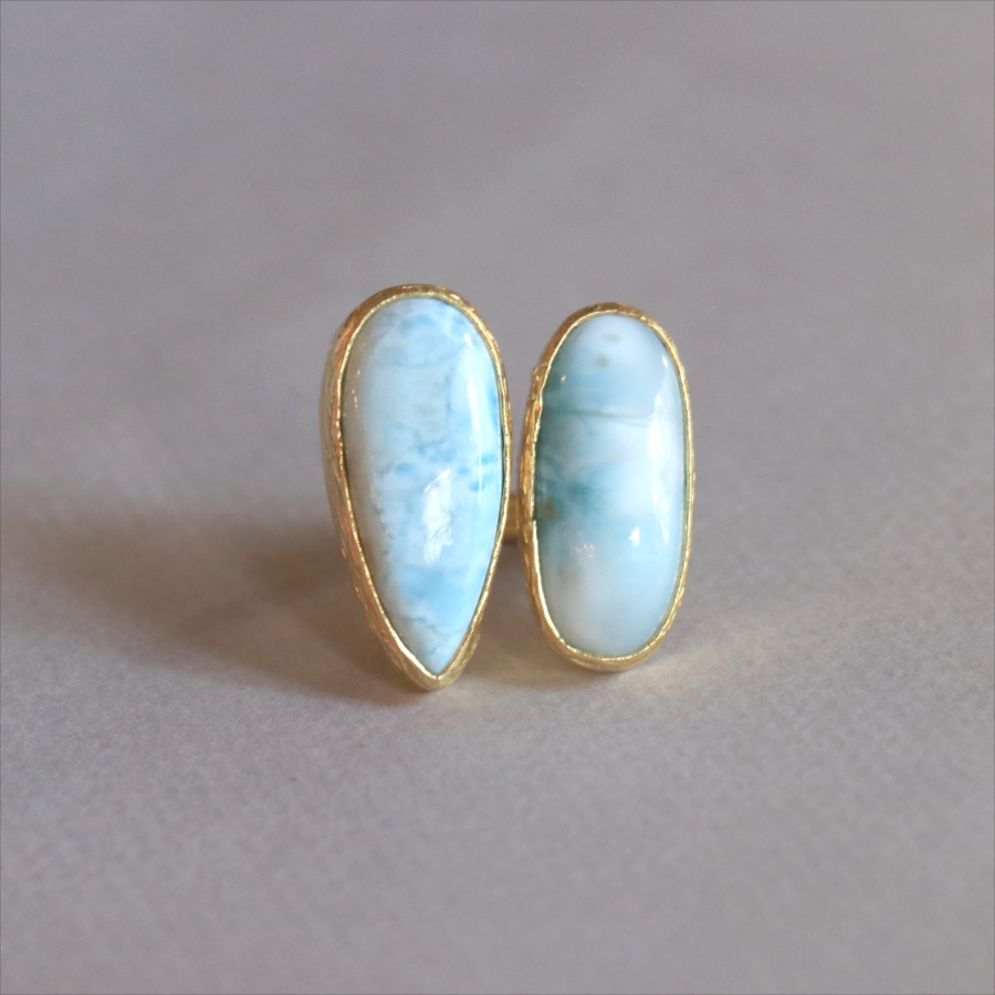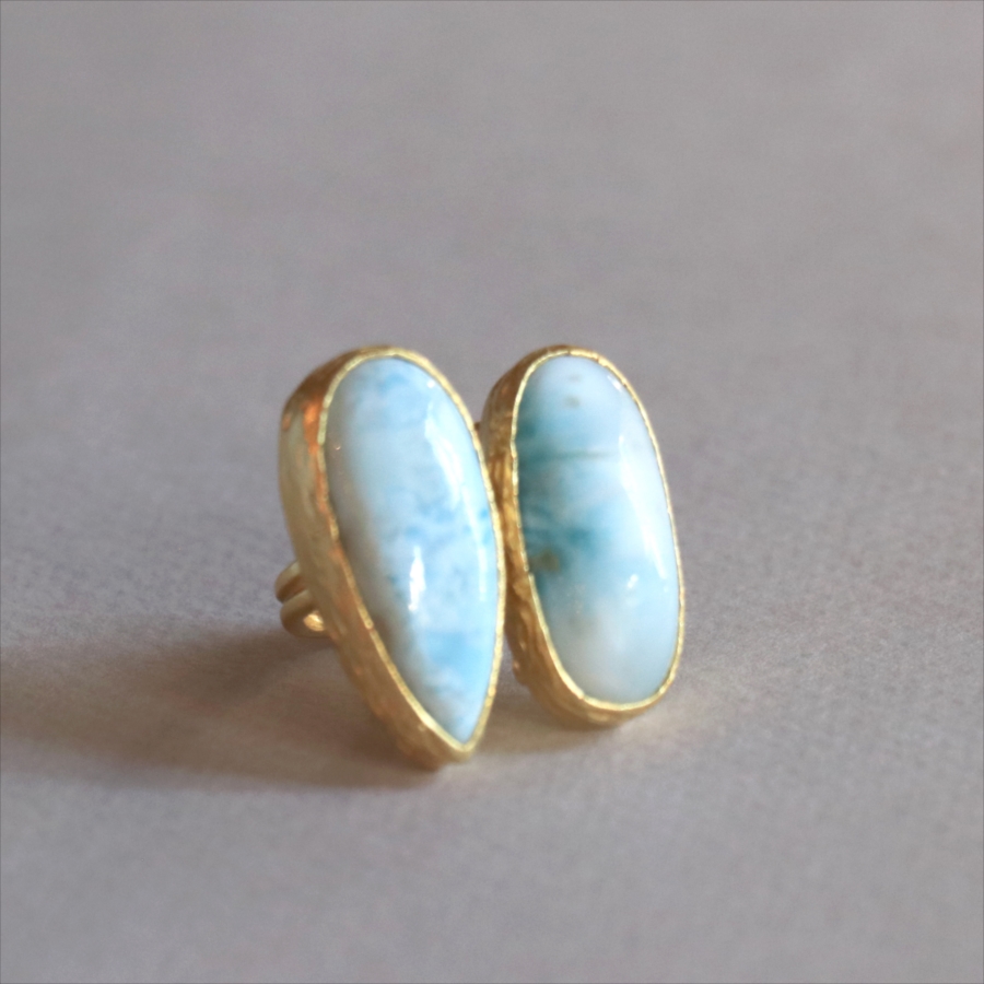 海に映る雲のような模様が広がる、優しいブルーが美しいラリマーダブルリングです。形の違うふたつの石が寄り添うように並ぶデザイン。大粒で立体感があり、シンプルながらも個性的が光る一点ものジュエリーです。