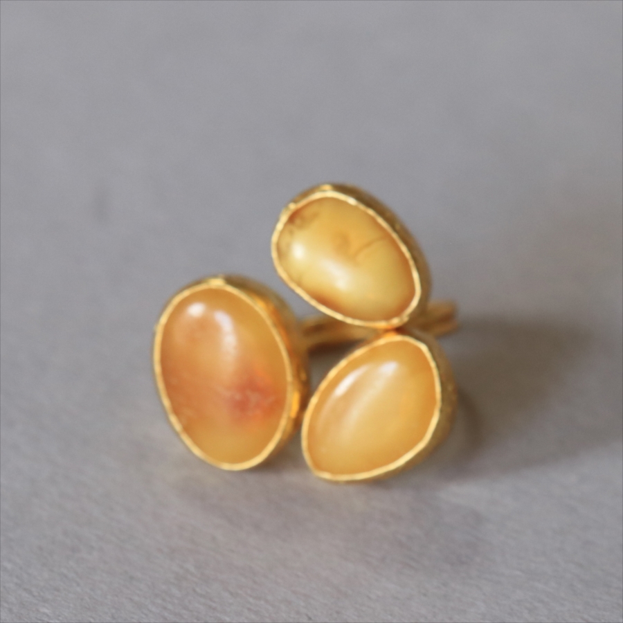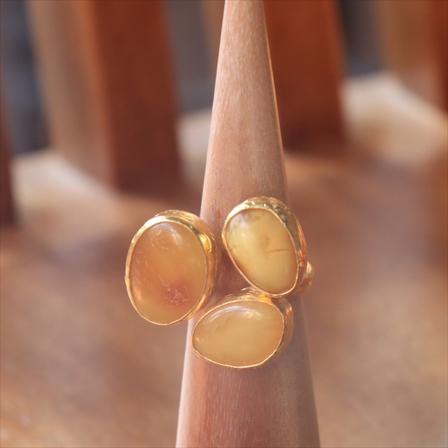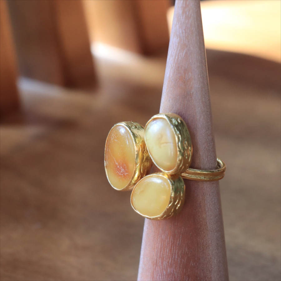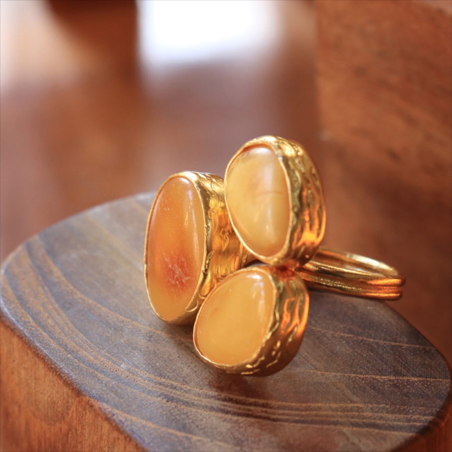 それぞれ質感の異なる三つの琥珀が並んだ、アンバー3ストーンリング。こっくりとしたバタースコッチのようなミルキーカラーのマーブル模様が魅力の琥珀。マットな質感のキャラメルブラウンカラーが美しい琥珀。光沢のあるゴールデンブラウンカラーの中に浮かぶ内包物が魅力の琥珀。個性的なデザインに見えますが、肌なじみの良いカラーは違和感なく、おすすめです。
