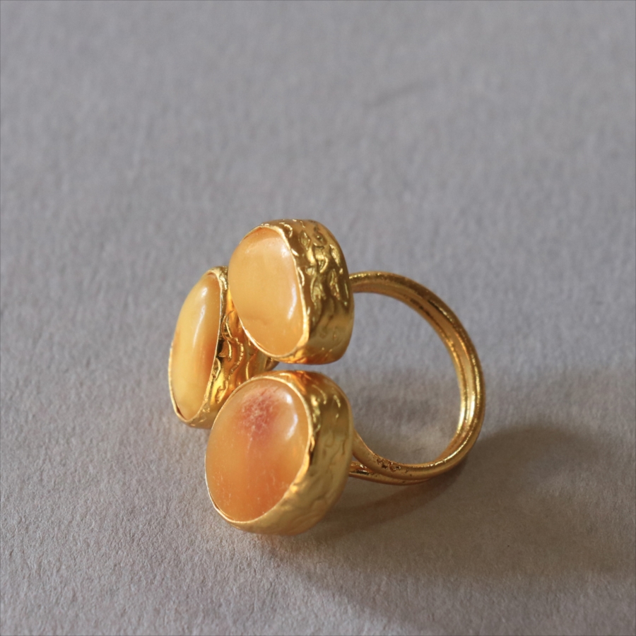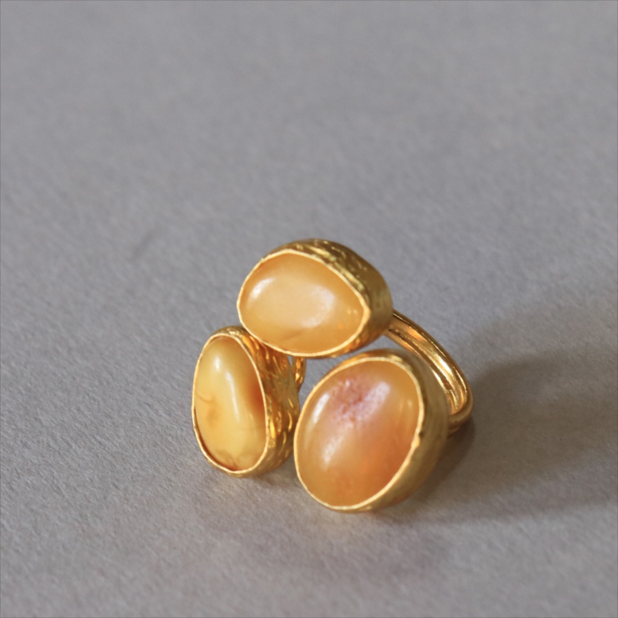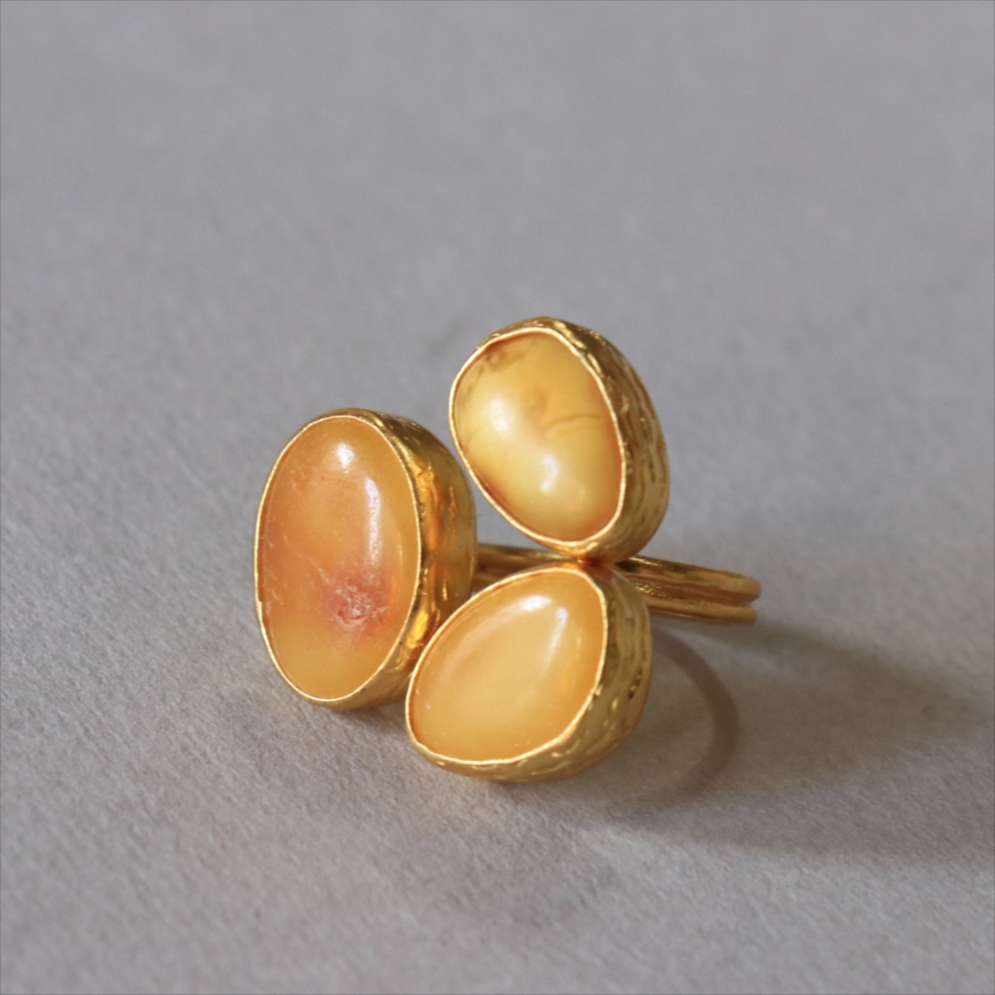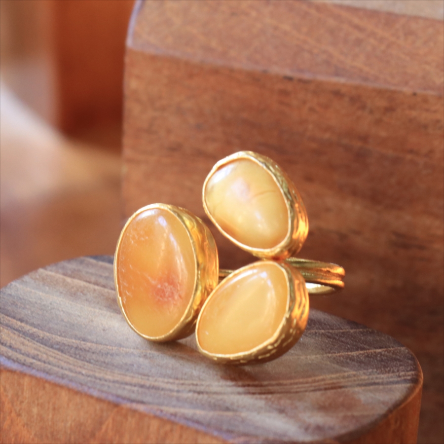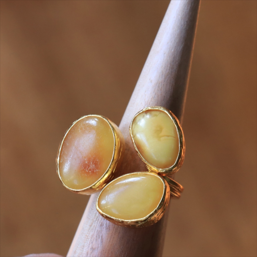 それぞれ質感の異なる三つの琥珀が並んだ、アンバー3ストーンリング。こっくりとしたバタースコッチのようなミルキーカラーのマーブル模様が魅力の琥珀。マットな質感のキャラメルブラウンカラーが美しい琥珀。光沢のあるゴールデンブラウンカラーの中に浮かぶ内包物が魅力の琥珀。個性的なデザインに見えますが、肌なじみの良いカラーは違和感なく、おすすめです。