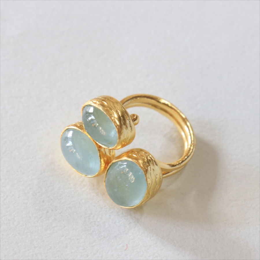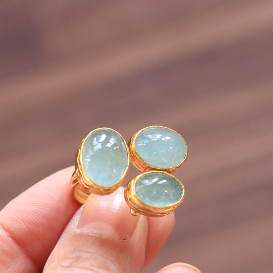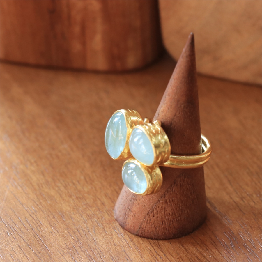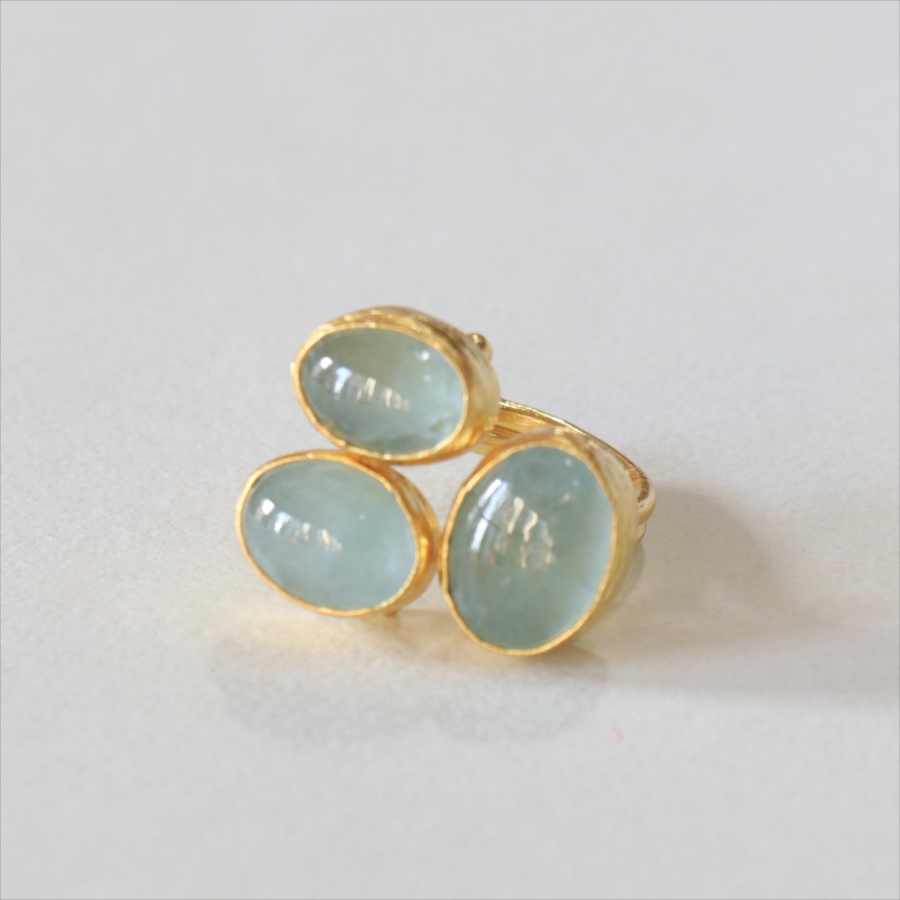 ペールブルーのパステルカラーがさわやかな印象のアクアマリンのリングです。カボションカットのストーンに厚みを持たせてあるため、光をあてて中を覗き込むと、奥行きが感じられて神秘的です。