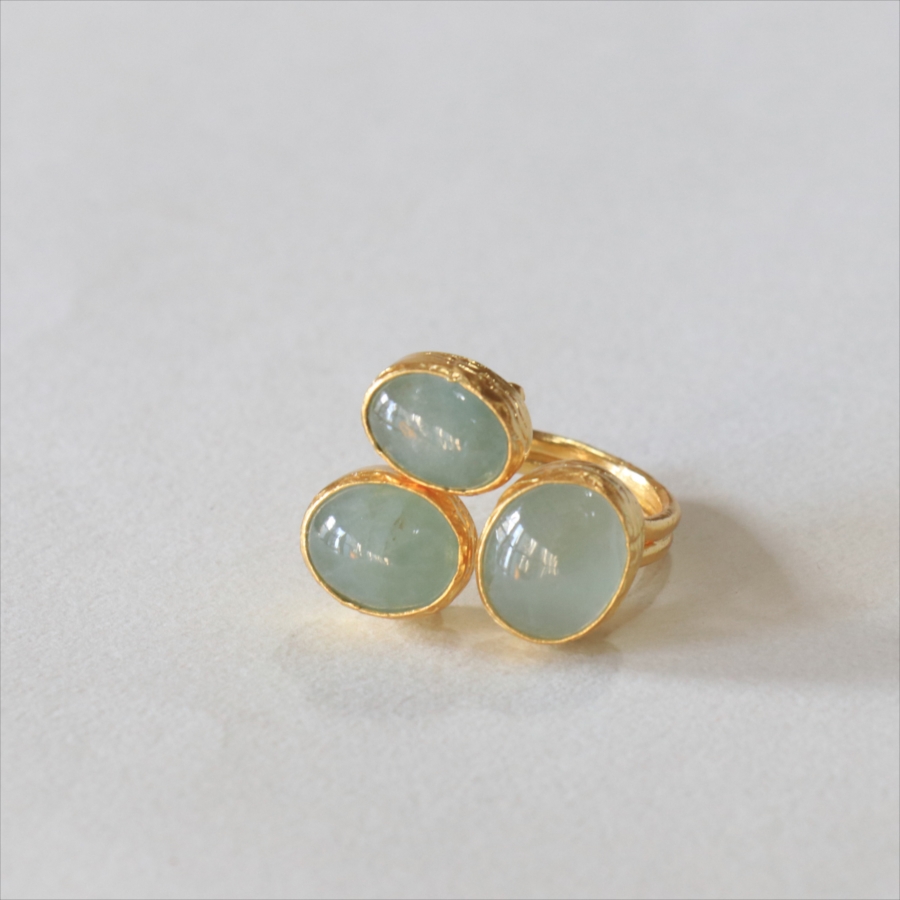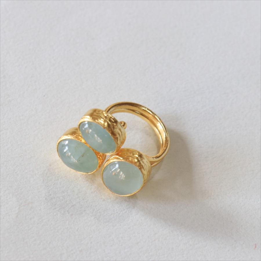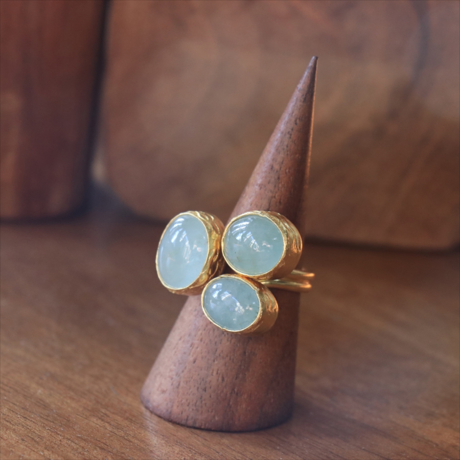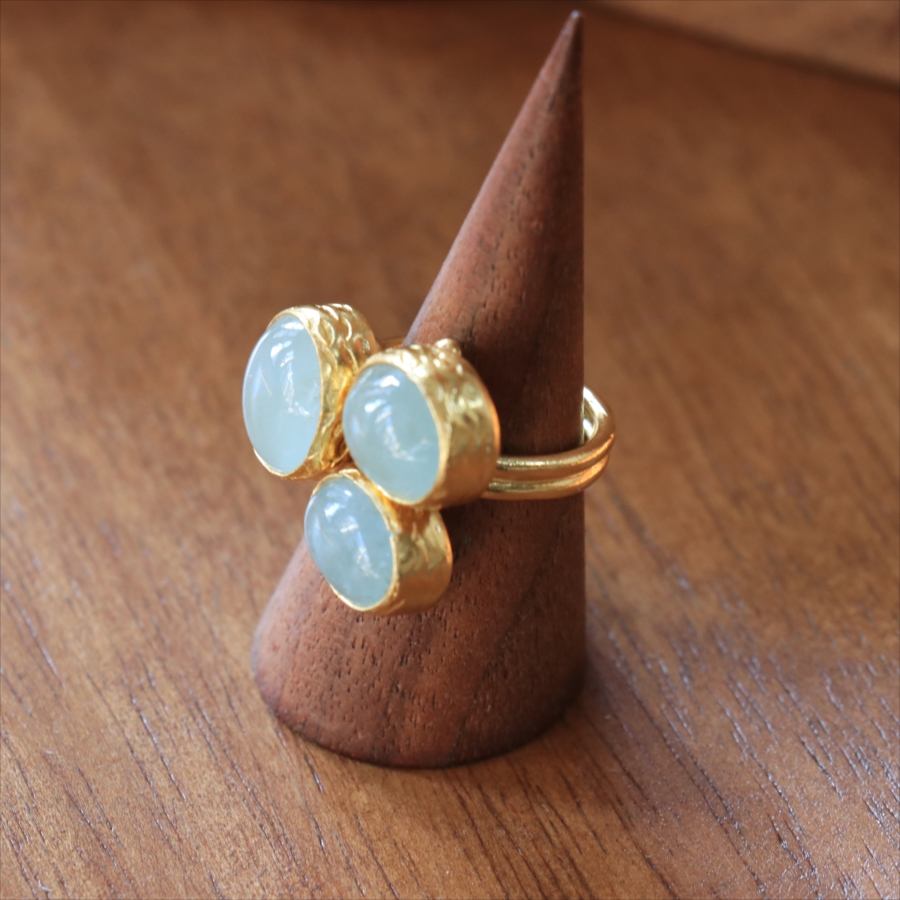 ペールブルーのパステルカラーがさわやかな印象のアクアマリンのリングです。カボションカットのストーンに厚みを持たせてあるため、光をあてて中を覗き込むと、奥行きが感じられて神秘的です。