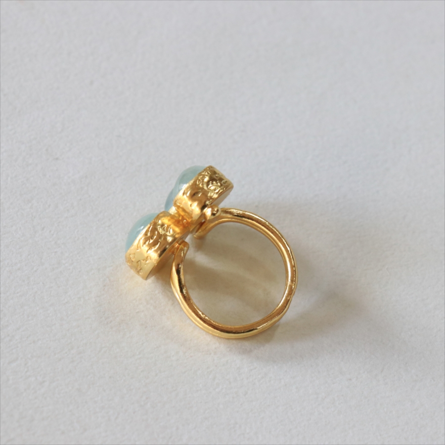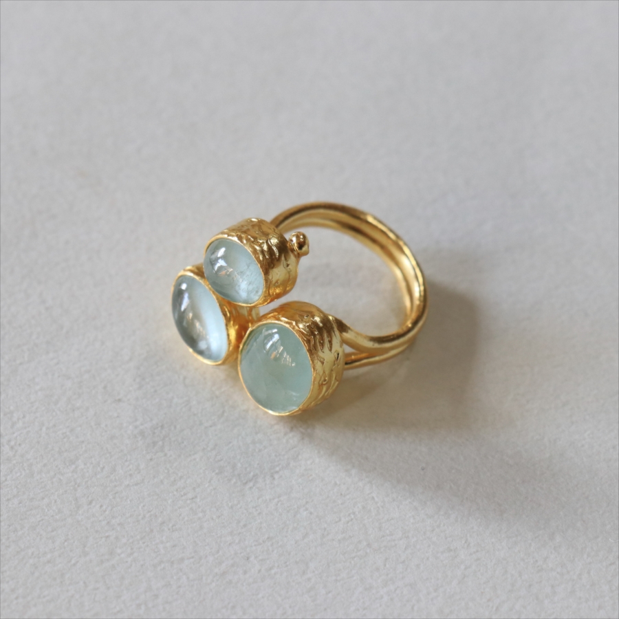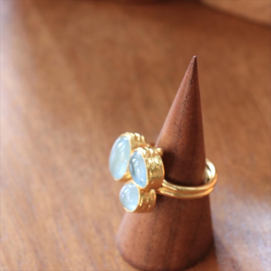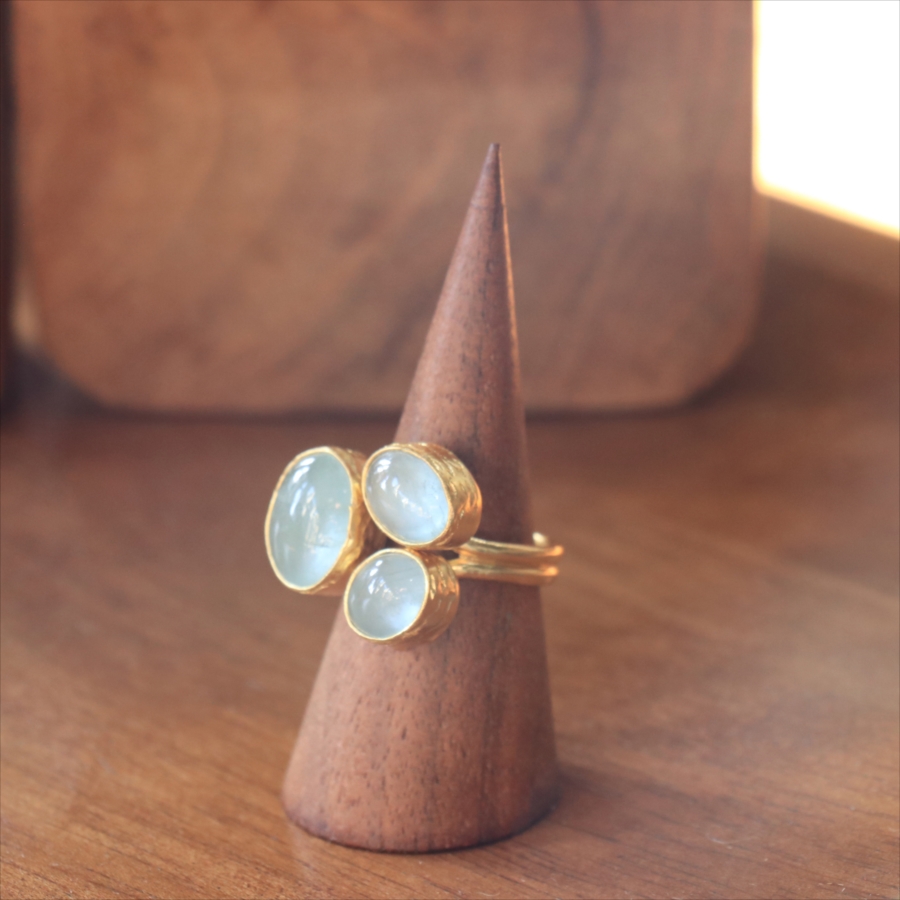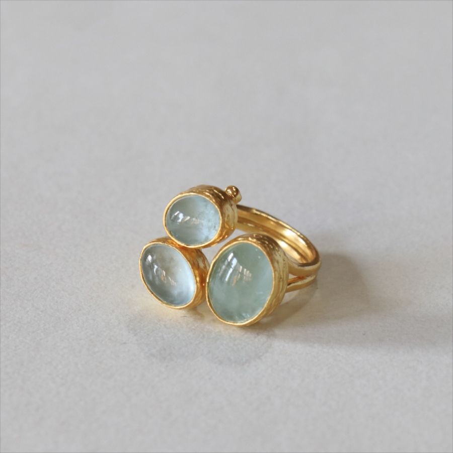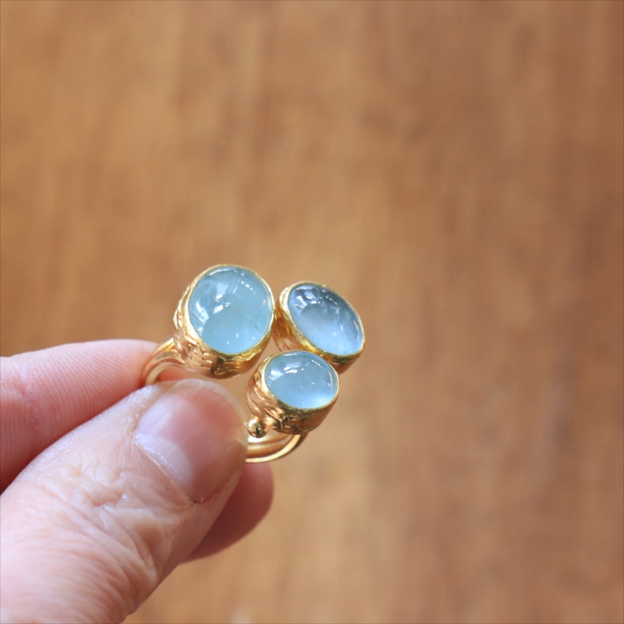 ペールブルーのパステルカラーがさわやかな印象のアクアマリンのリングです。カボションカットのストーンに厚みを持たせてあるため、光をあてて中を覗き込むと、奥行きが感じられて神秘的です。