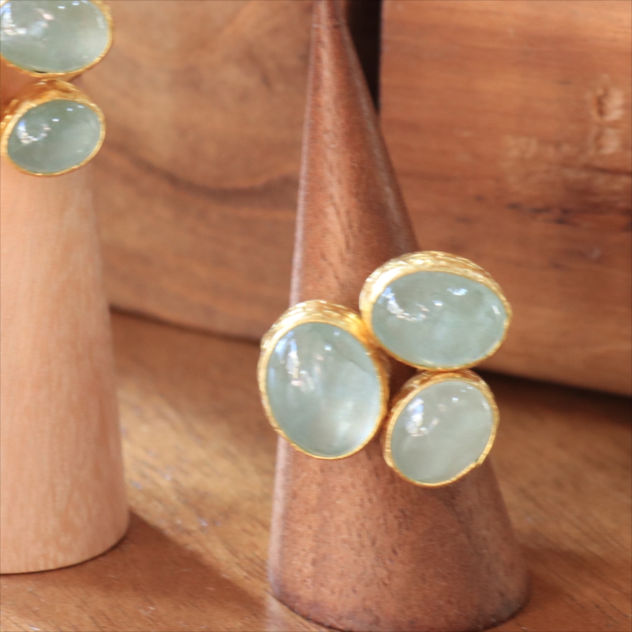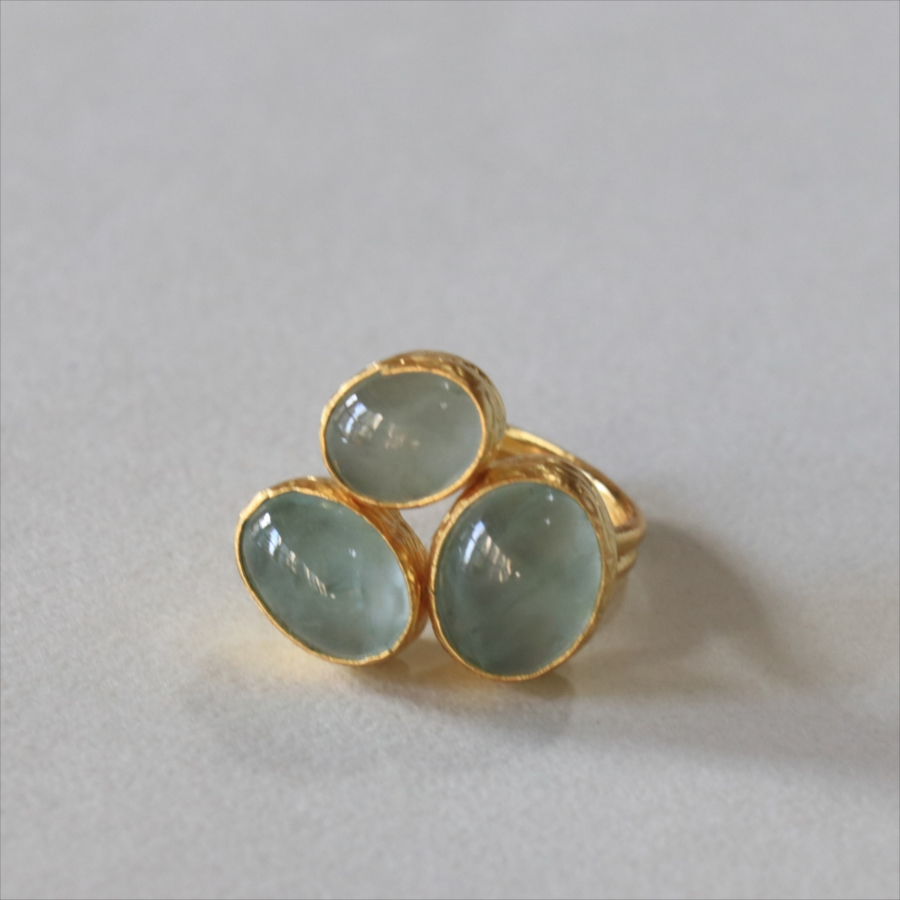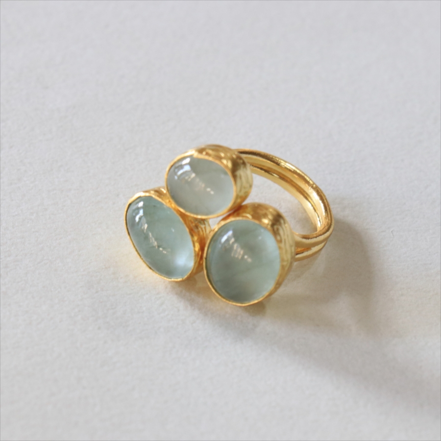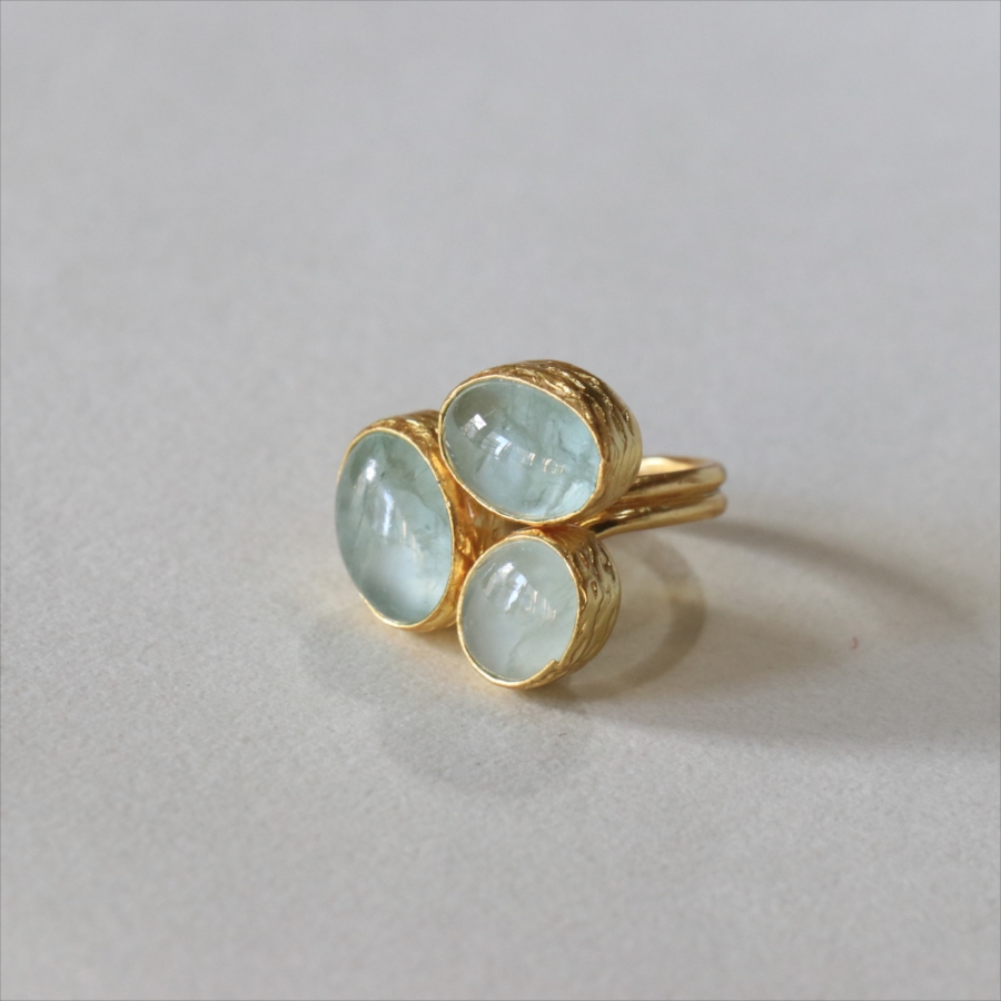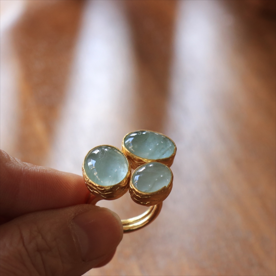 ペールブルーのパステルカラーがさわやかな印象のアクアマリンのリングです。カボションカットのストーンに厚みを持たせてあるため、光をあてて中を覗き込むと、奥行きが感じられて神秘的です。