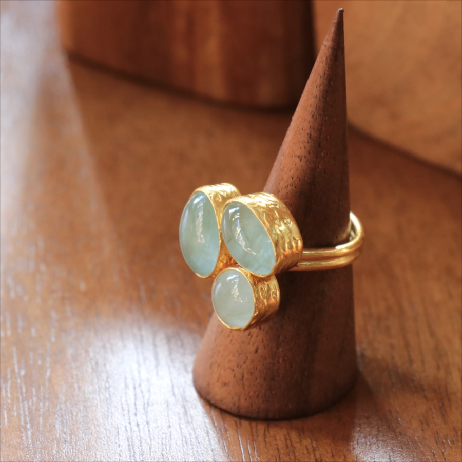 リングサイズについてフリーサイズとしていますが、納品時の大きさより小さくすることはデザイン上できません。アクアマリンは完全な透明ではなく、内側にインクルージョンが見られます。天然石ならではの石の個性としてご理解くださいませ。