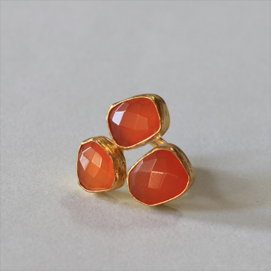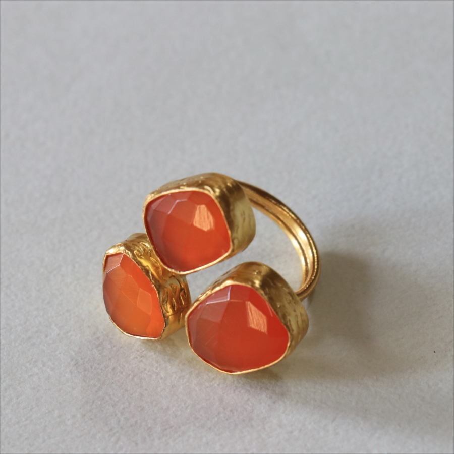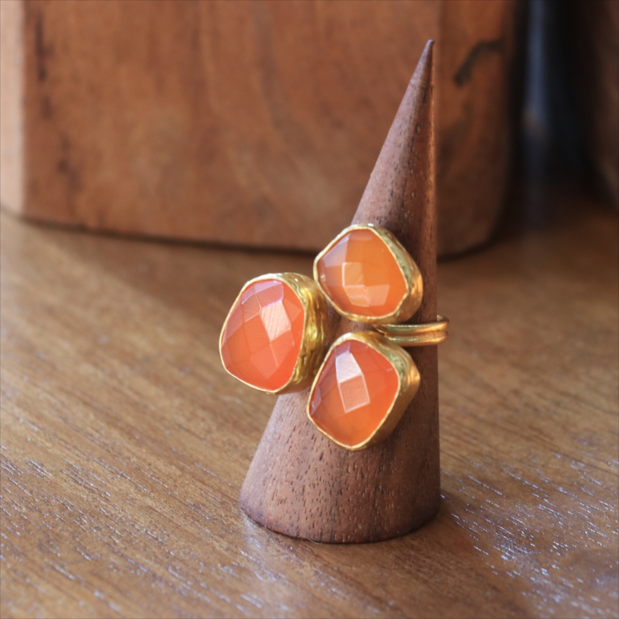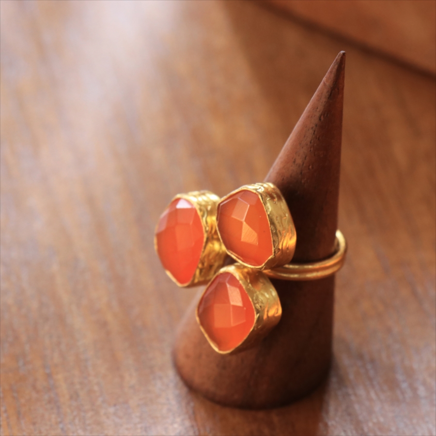 半透明のオレンジ色がきれいなカーネリアン3粒のリングです。カーネリアンは不純物もほとんどなく均一な色で、それだけに3つの石の形がひとつひとつ際立って見えます。それぞれの石にぴったりの枠を作る職人さんの丁寧な仕事が光る逸品です。