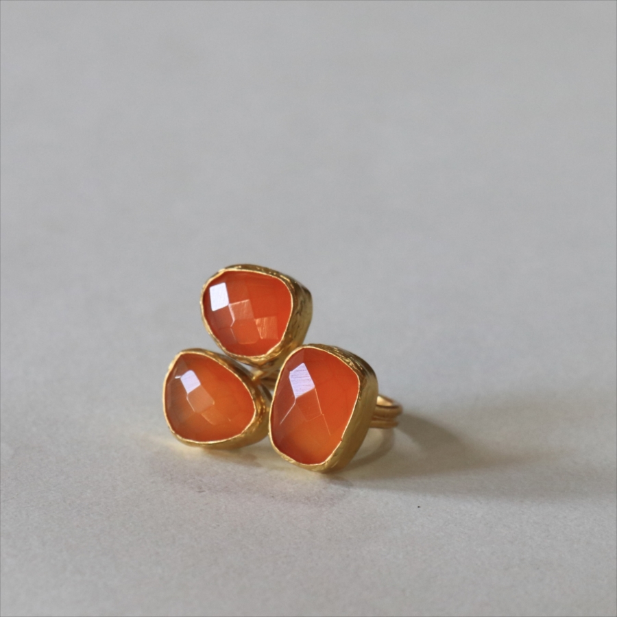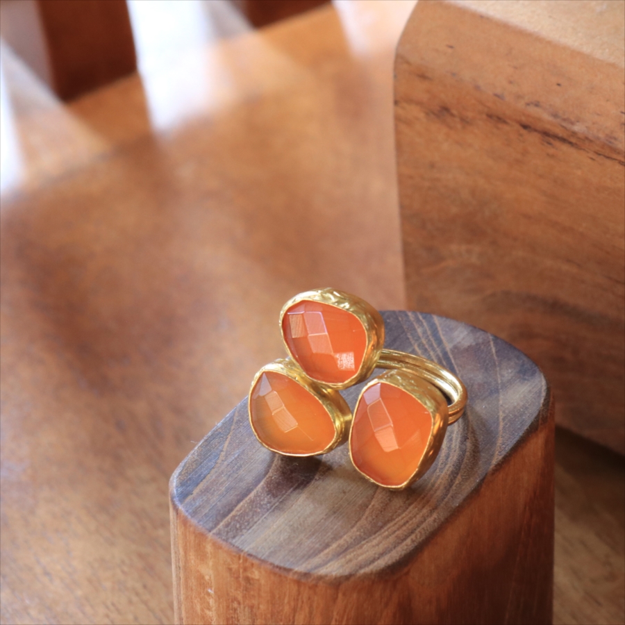 半透明のオレンジ色がきれいなカーネリアン3粒のリングです。カーネリアンは不純物もほとんどなく均一な色で、それだけに3つの石の形がひとつひとつ際立って見えます。それぞれの石にぴったりの枠を作る職人さんの丁寧な仕事が光る逸品です。