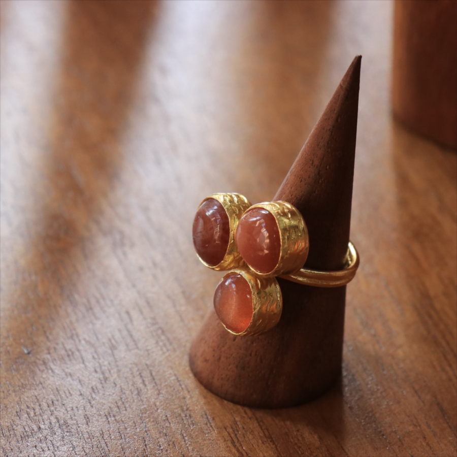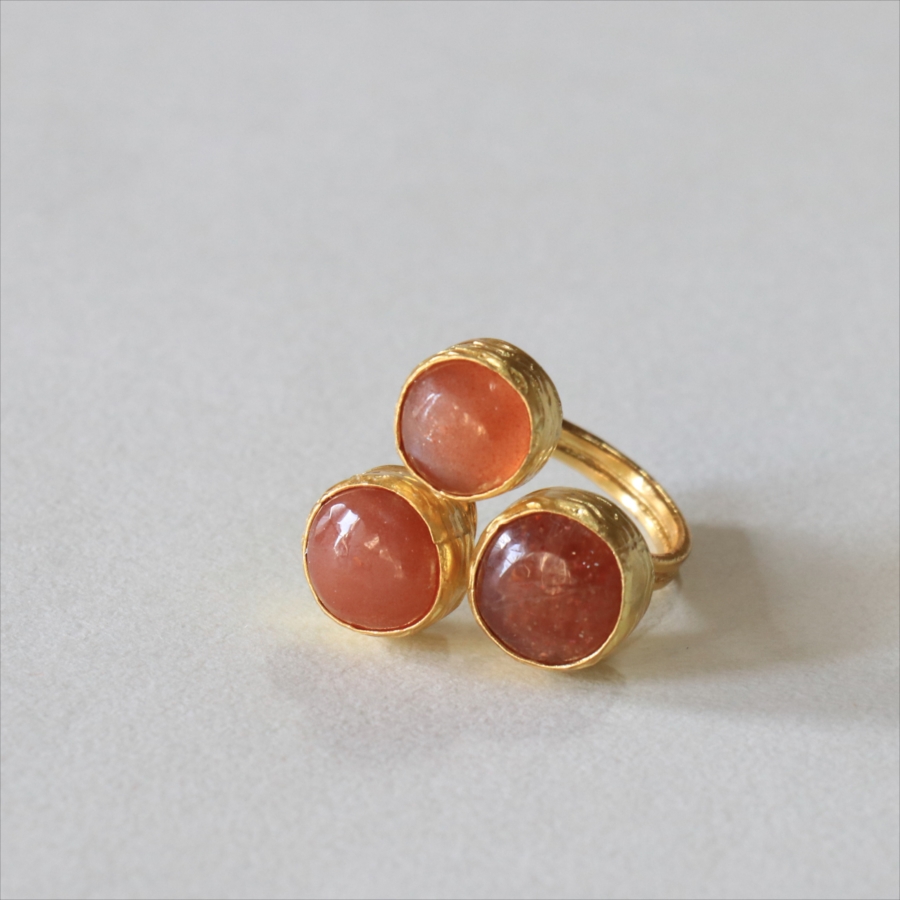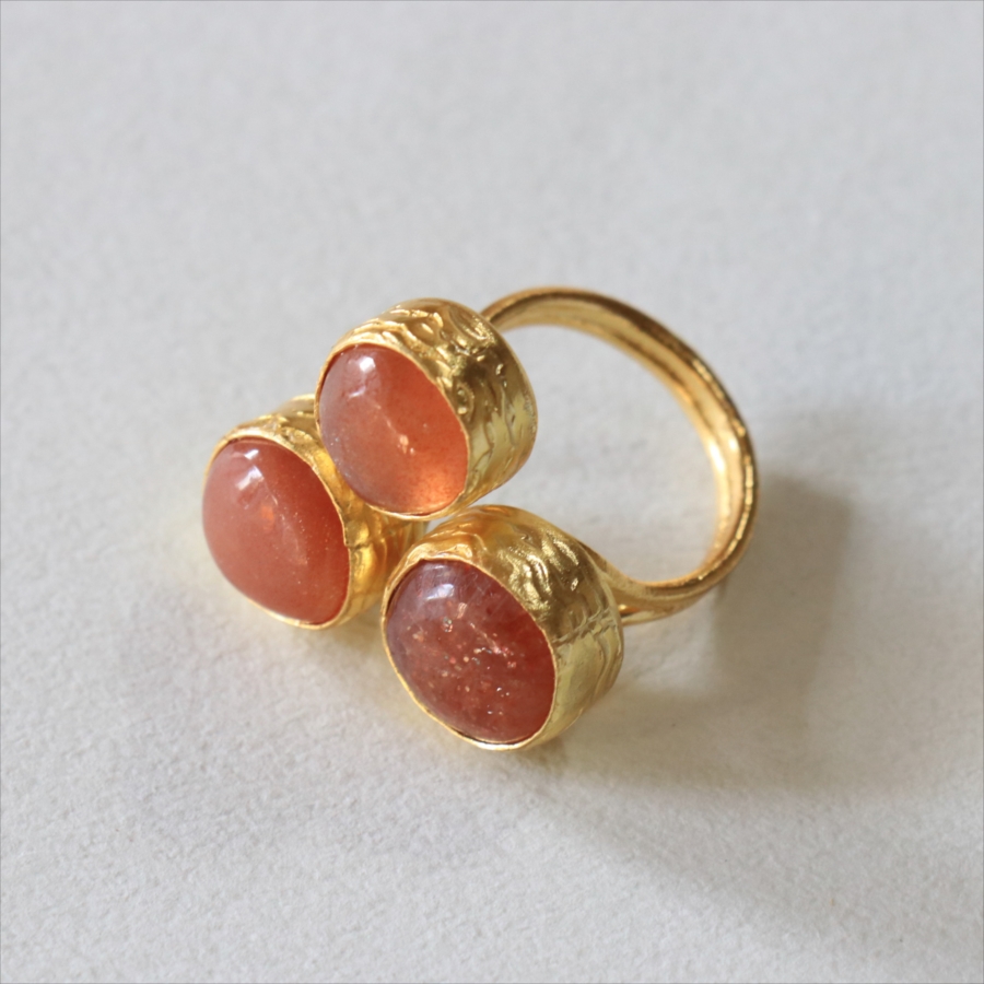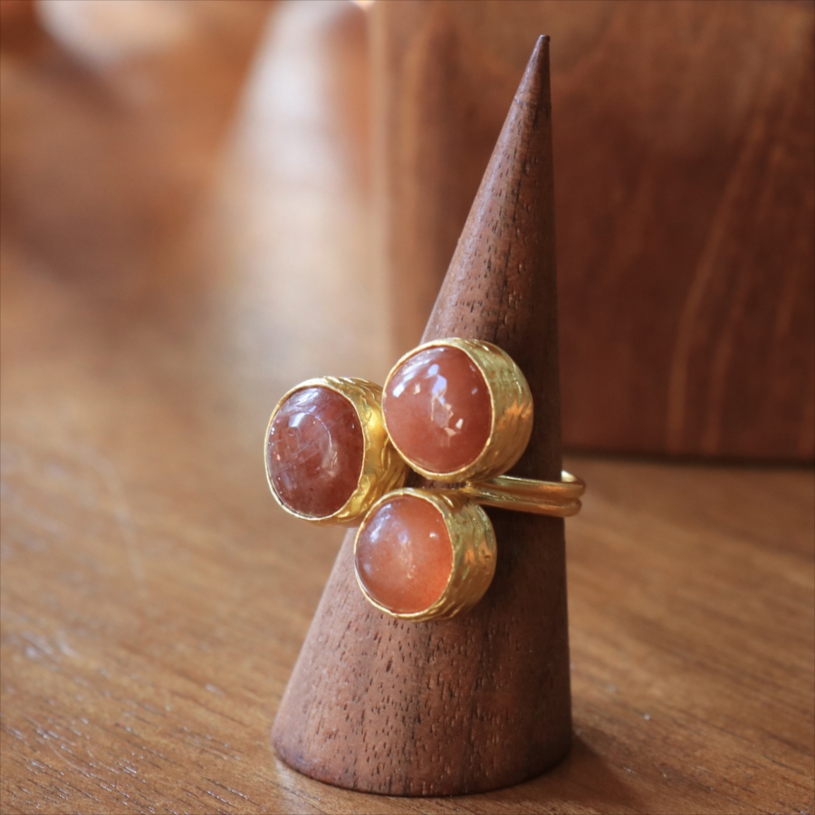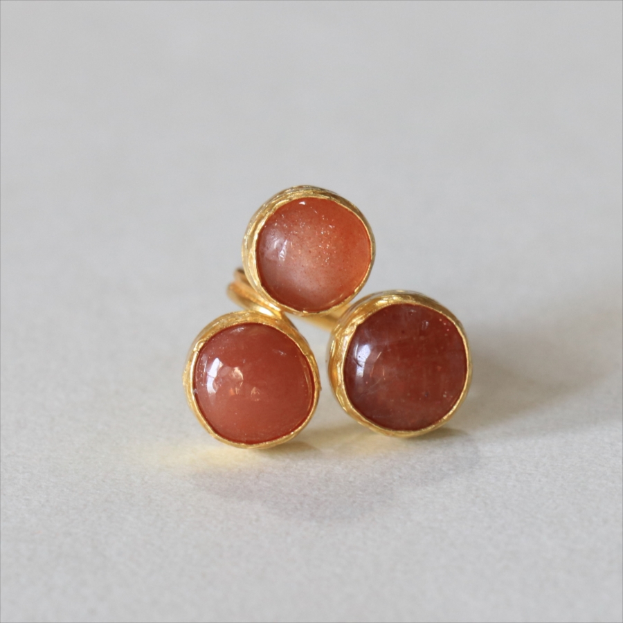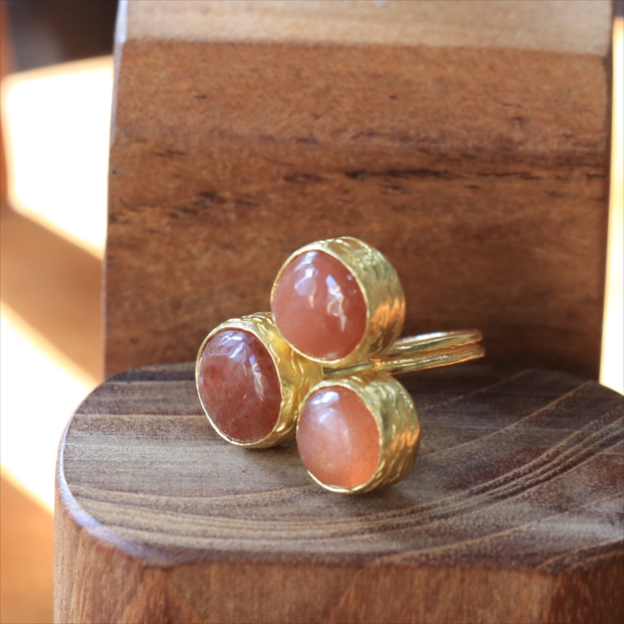 ほんのりブラウンがかったレンガの石の中に、よく見るときらきらと輝くインクルージョンがちりばめられたサンストーンが三つ並んだリング。コロンと丸形の3つの石はそれぞれ個性があり、ラメの様な輝きが光の射す角度によってきらめきます。