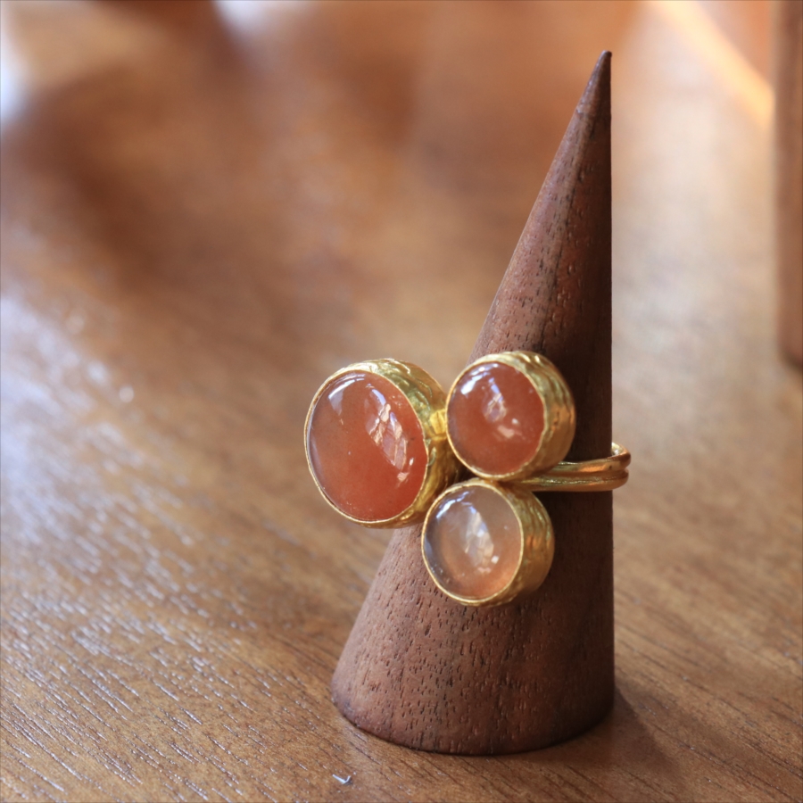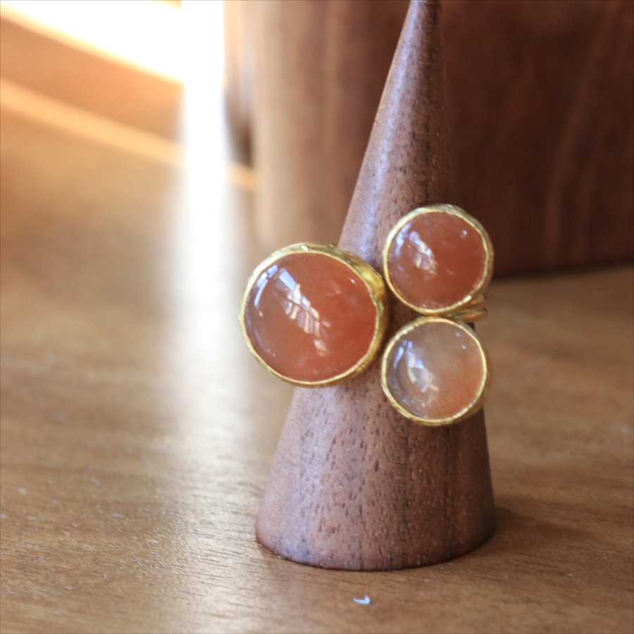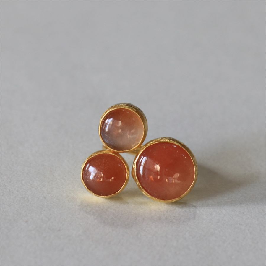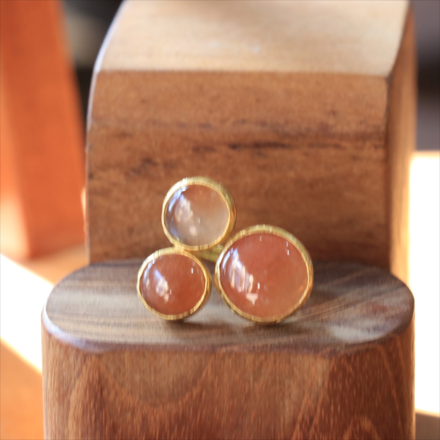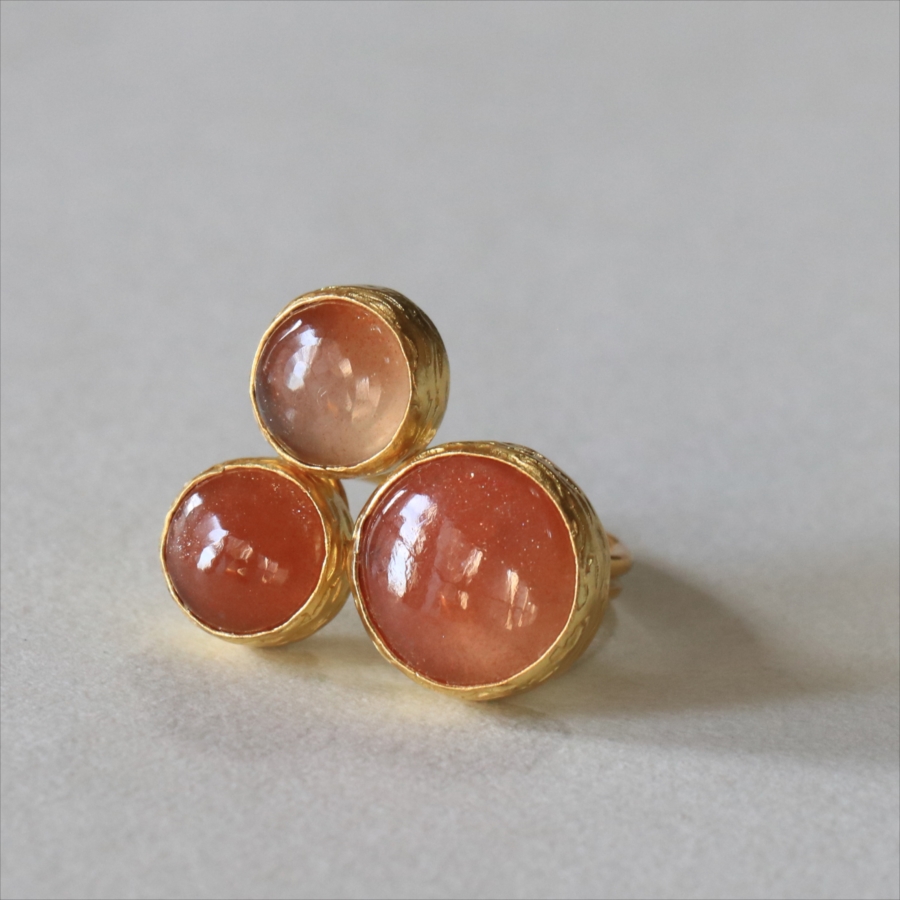 ほんのりブラウンがかったレンガの石の中に、よく見るときらきらと輝くインクルージョンがちりばめられたサンストーンが三つ並んだリング。コロンと丸形の3つの石はそれぞれ個性があり、ラメの様な輝きが光の射す角度によってきらめきます。