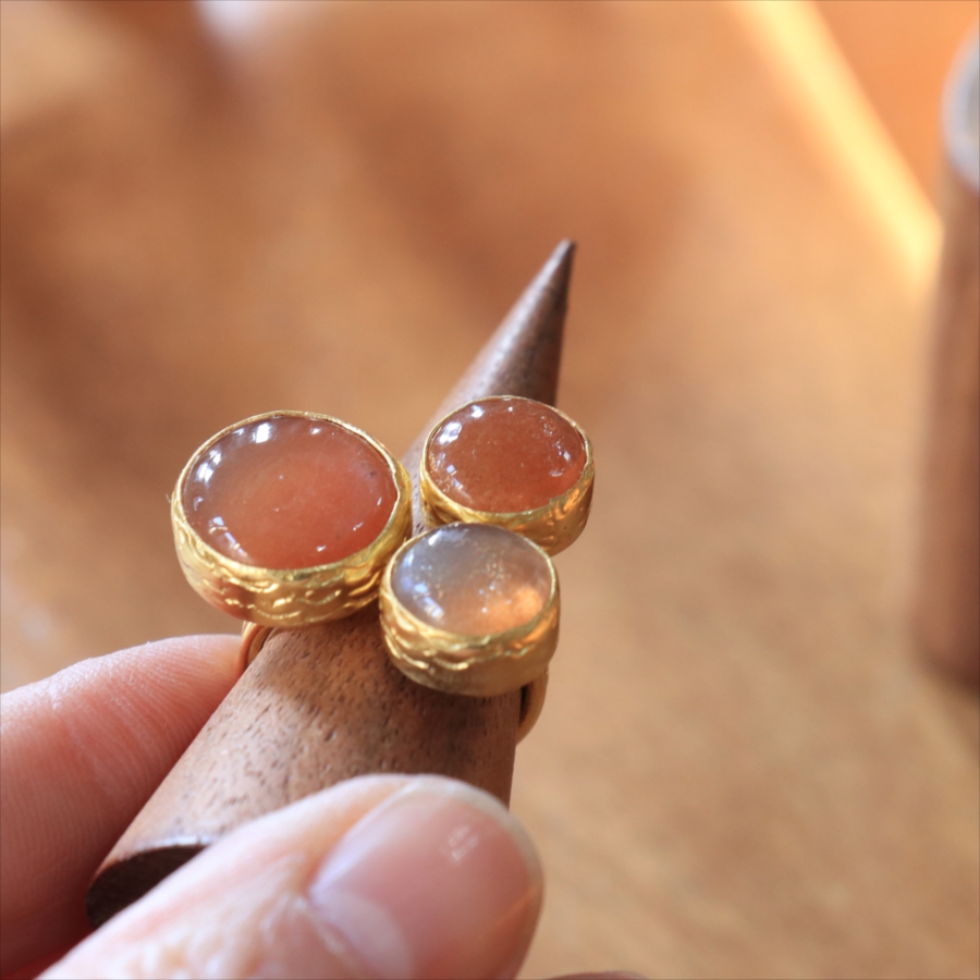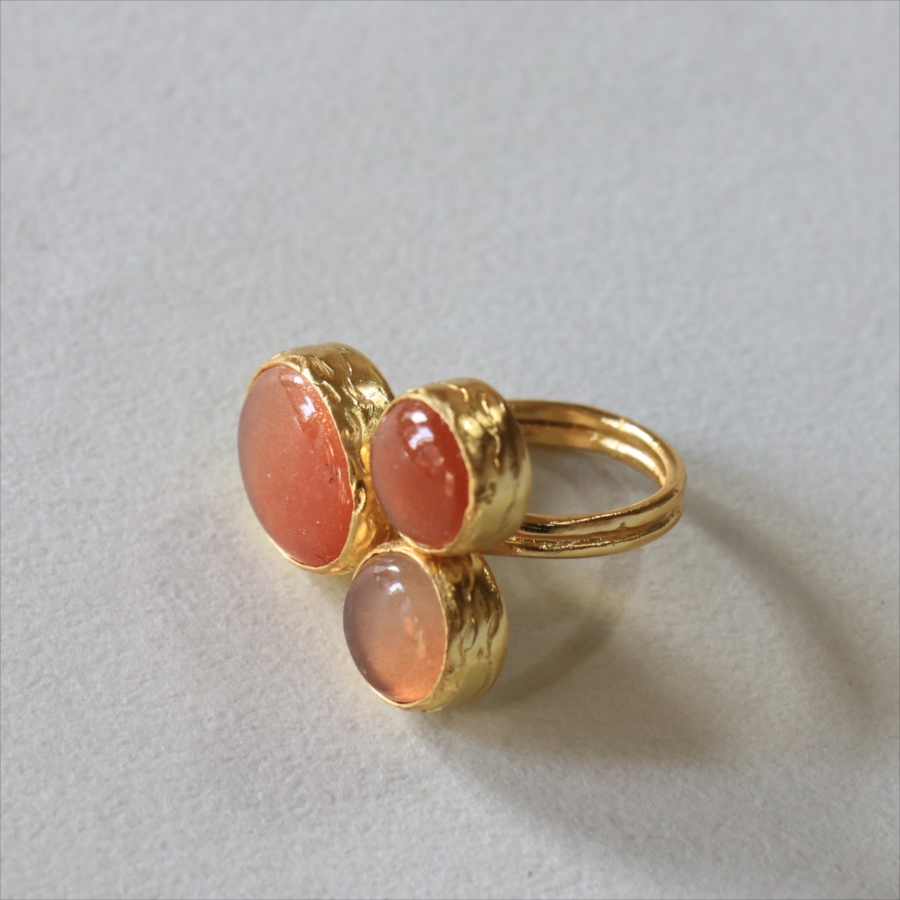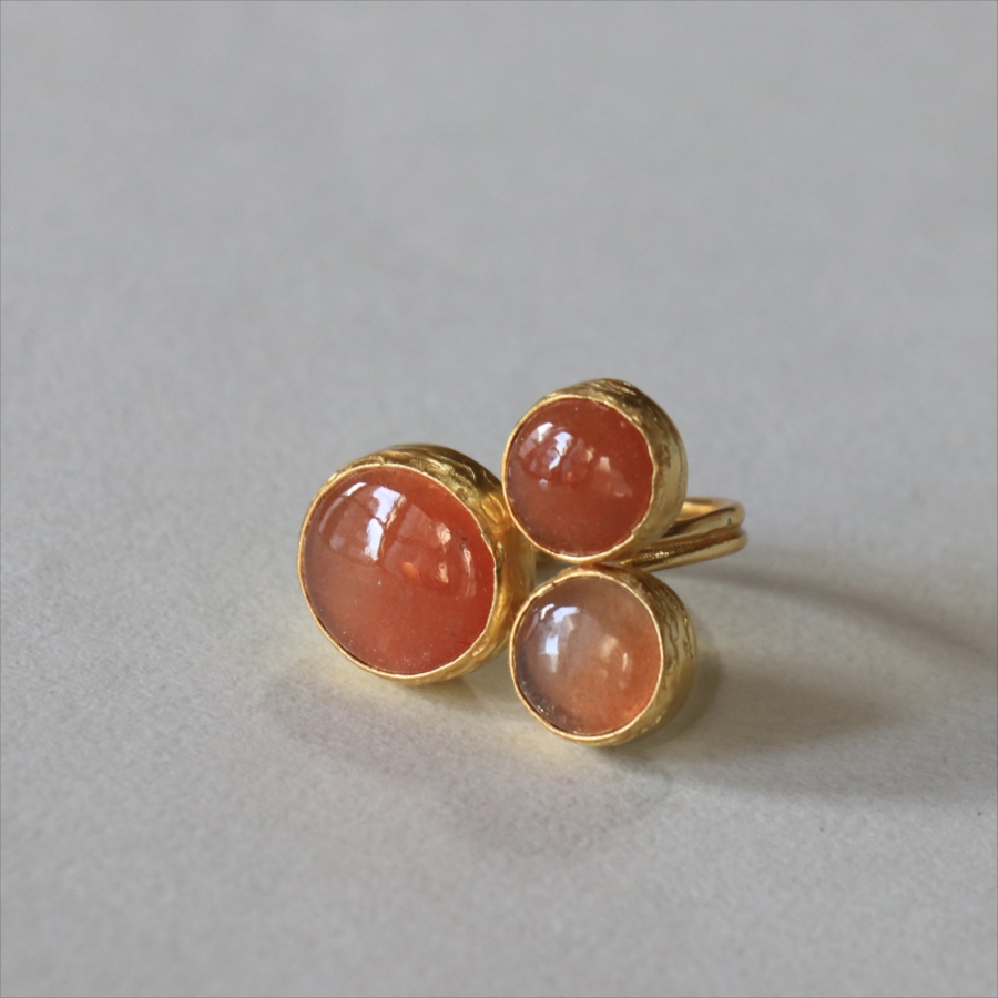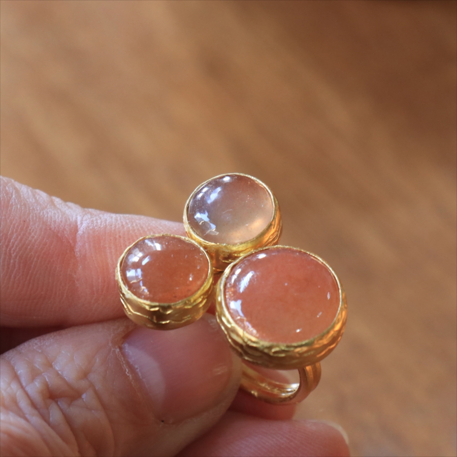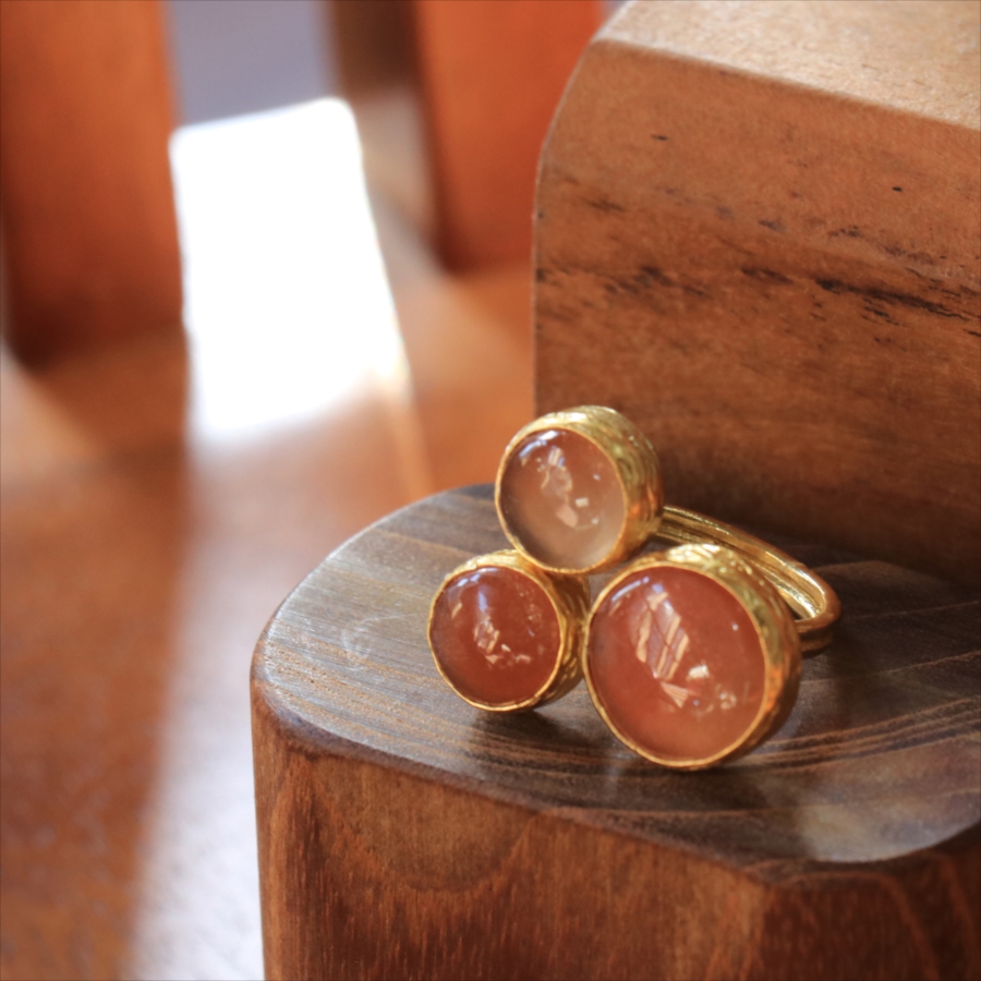 ほんのりブラウンがかったレンガの石の中に、よく見るときらきらと輝くインクルージョンがちりばめられたサンストーンが三つ並んだリング。コロンと丸形の3つの石はそれぞれ個性があり、ラメの様な輝きが光の射す角度によってきらめきます。