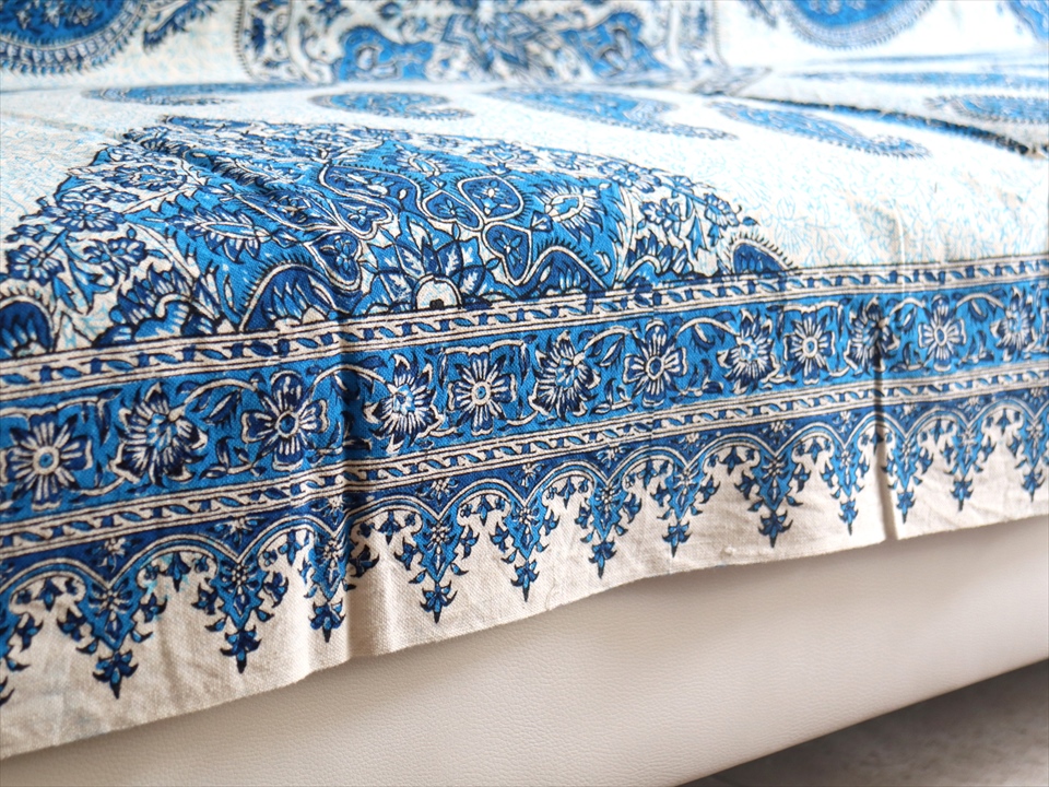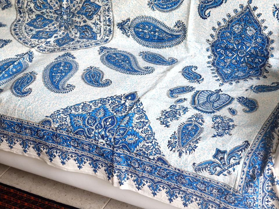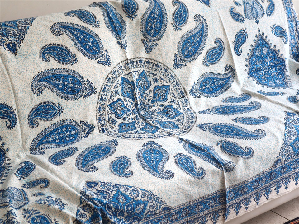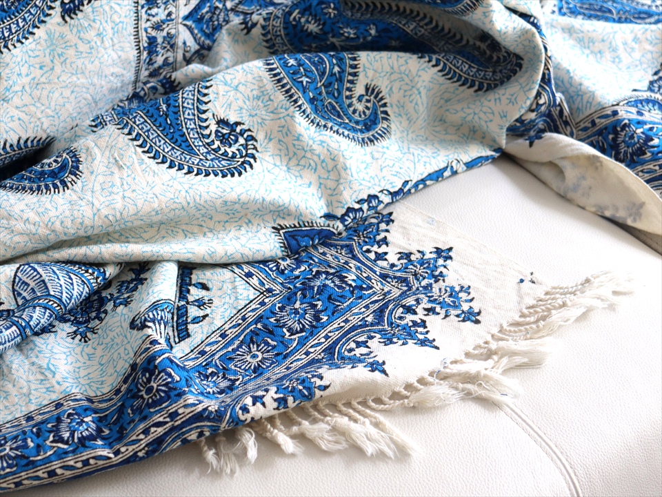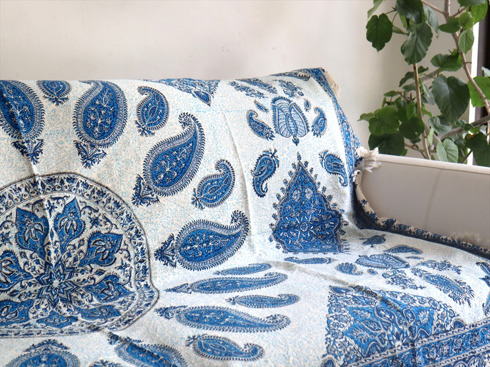 ペルシャ更紗・イラン手染め布/198x132cm ソファカバー・マルチカバー ブルー系ペイズリー柄