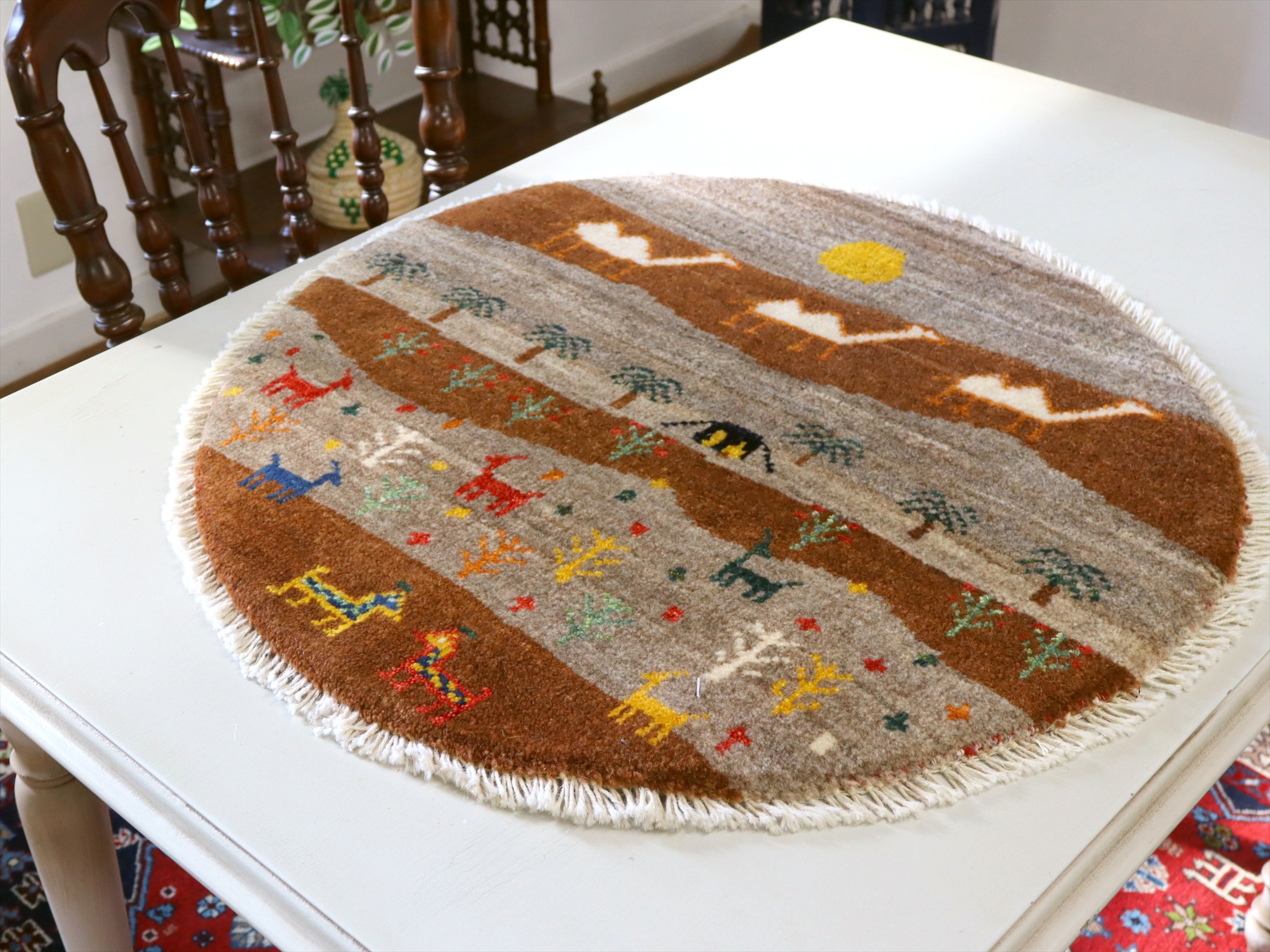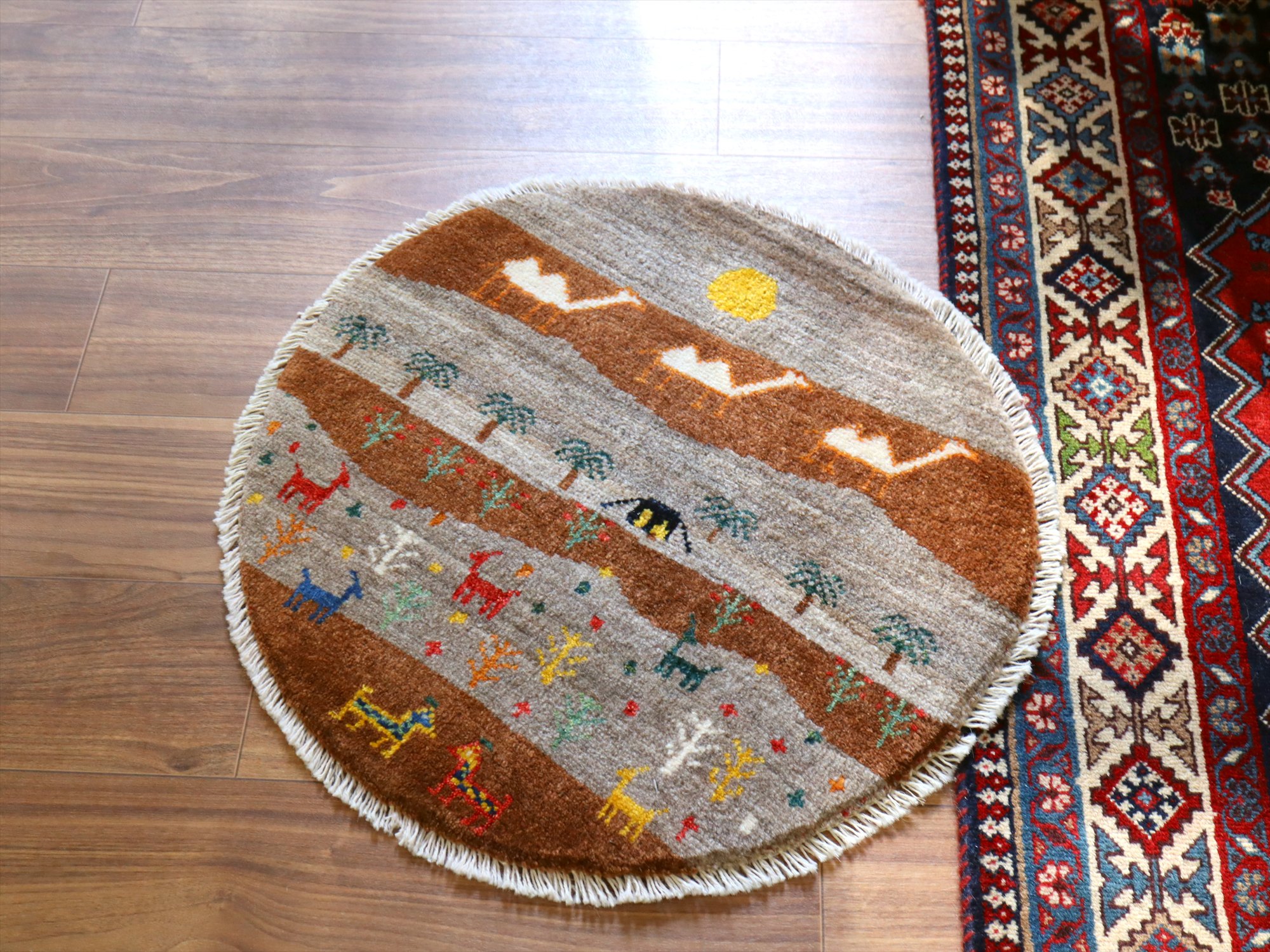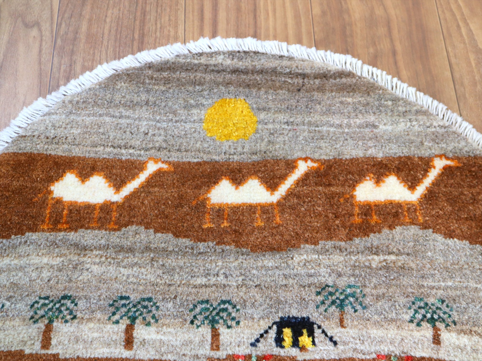 ギャッベを織るカシュカイ族の遊牧生活織った丸いカタチのギャッベです。黒いテントには明かりが灯り、遠くに砂漠を行くフタコブラクダが織り込まれています。