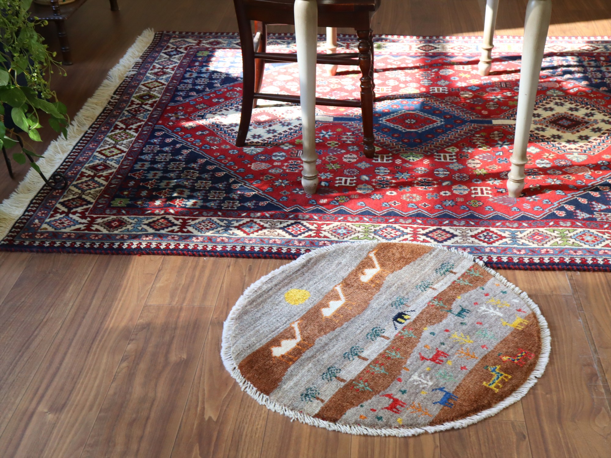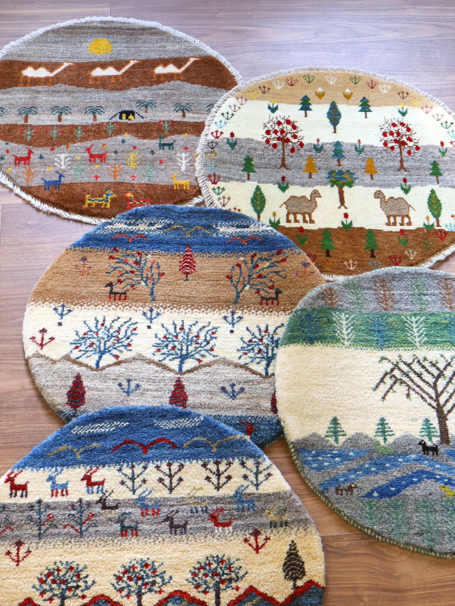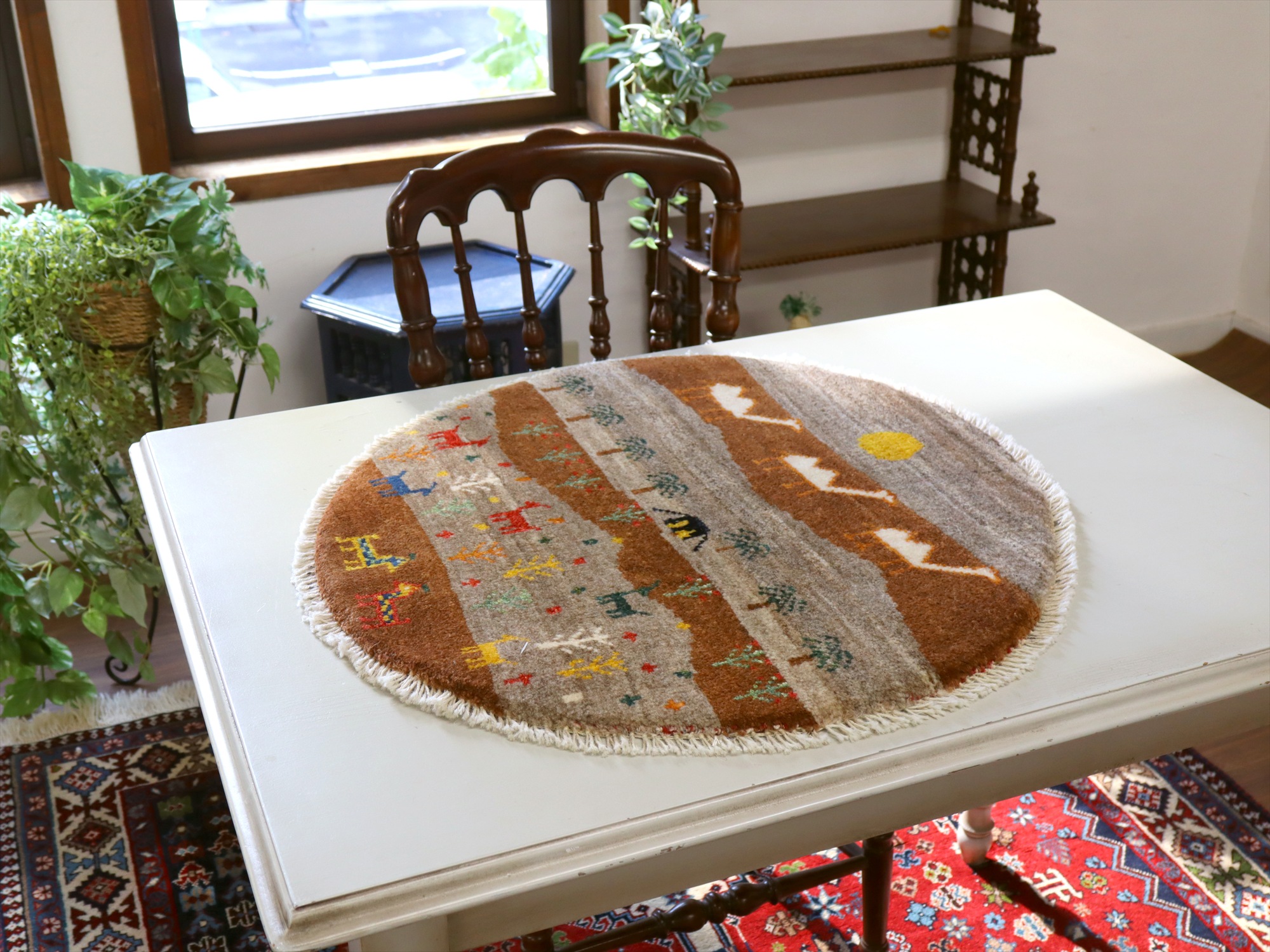 ギャッベを織るカシュカイ族の遊牧生活織った丸いカタチのギャッベです。黒いテントには明かりが灯り、遠くに砂漠を行くフタコブラクダが織り込まれています。