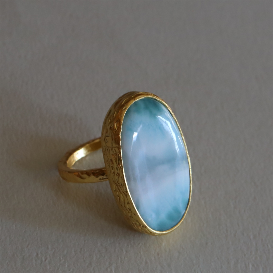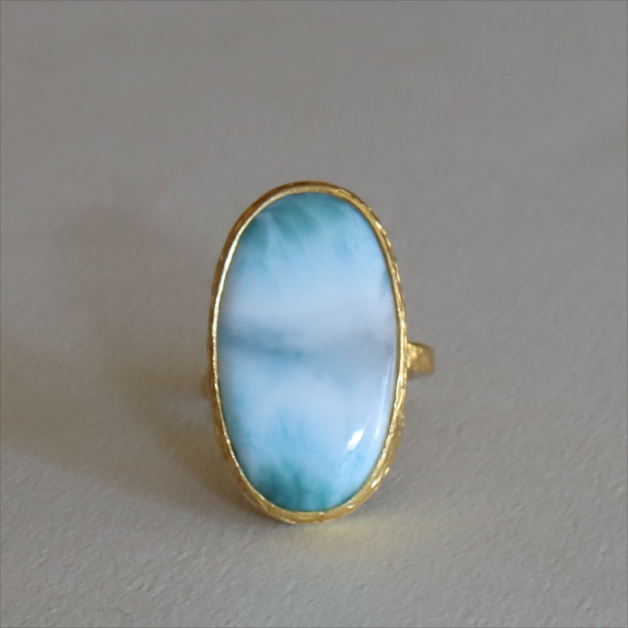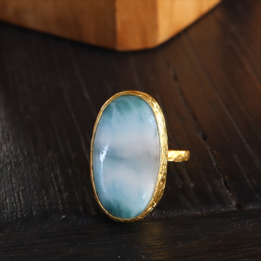 雲が浮かぶ青空のような模様が広がる、清々しいブルーが美しいラリマーのリングです。白や淡いブラウンがマーブル模様のように混ざり合い、艶やかなブルーを引き立てます。イエローゴールドとの組み合わせが上品な印象です。