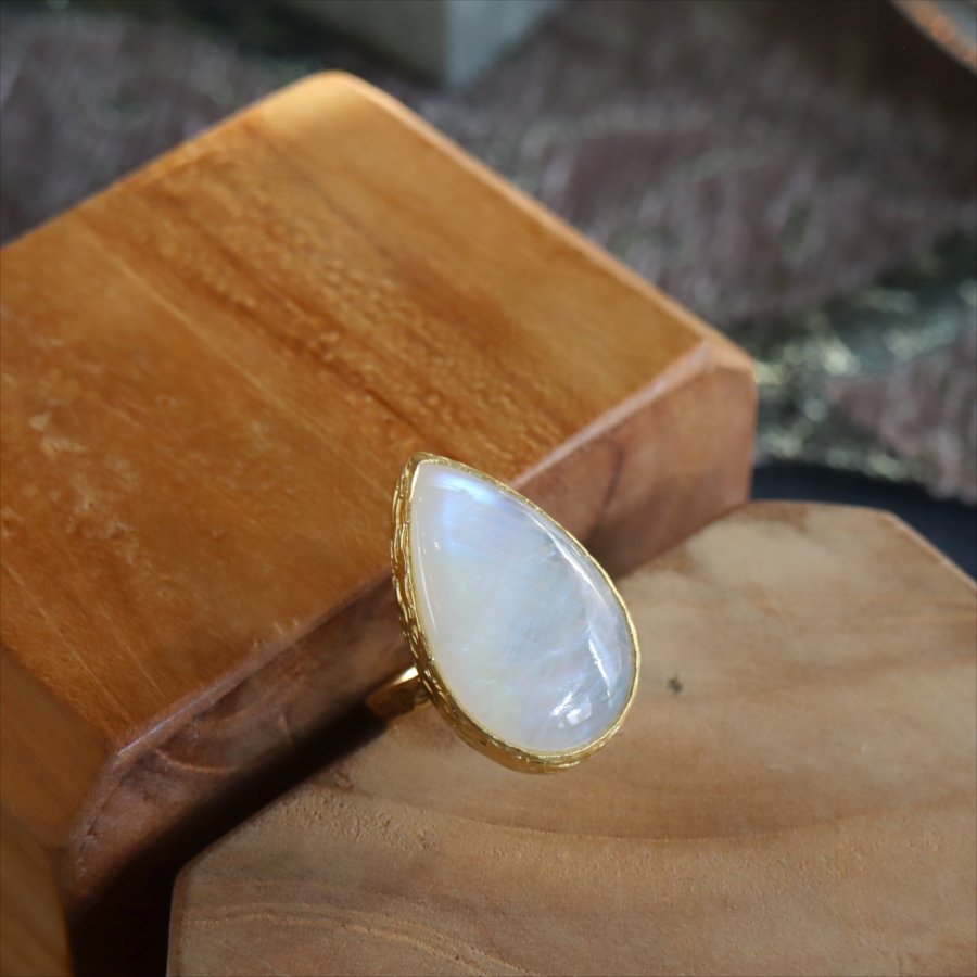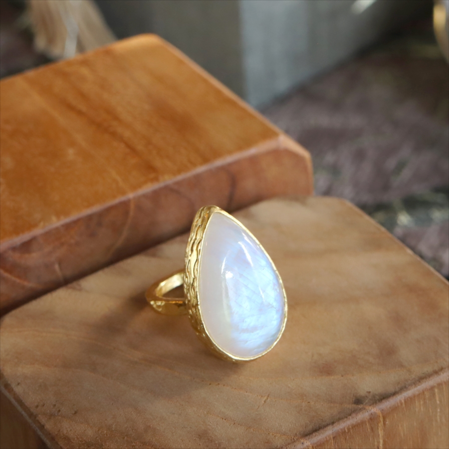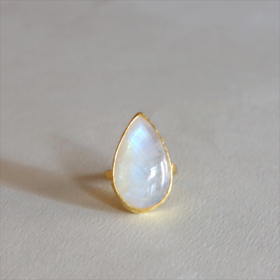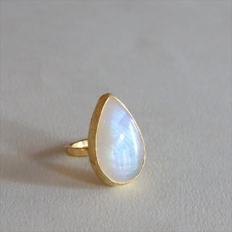 乳白色の大粒の石に幻想的な青みあるシラー(虹色の輝き)が美しい、存在感のあるリングです。ぽってりとボリューム感あるムーンストーンは艶やかで上品な印象です。