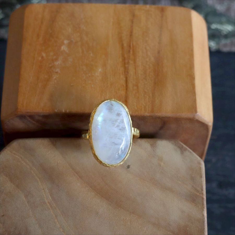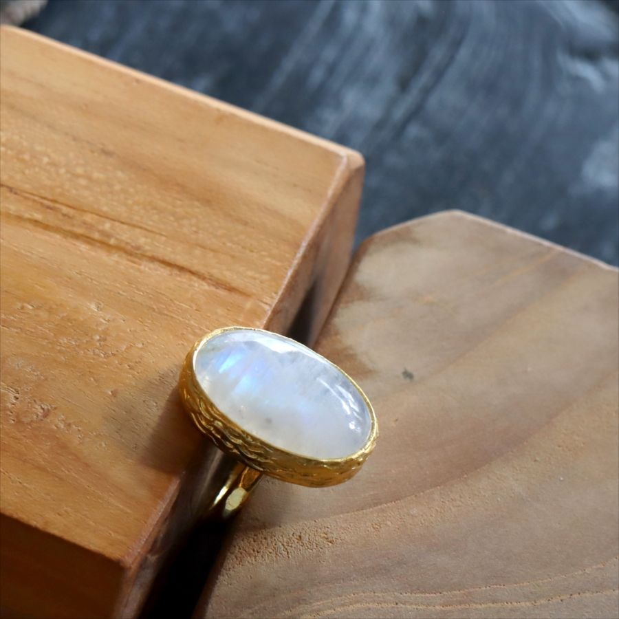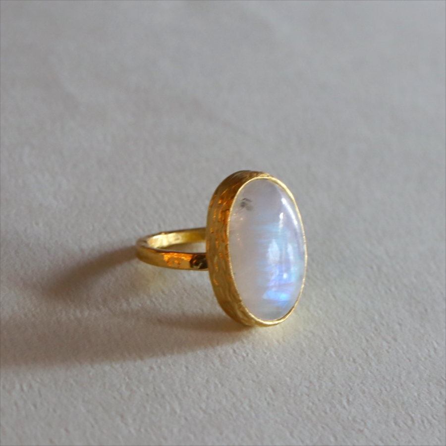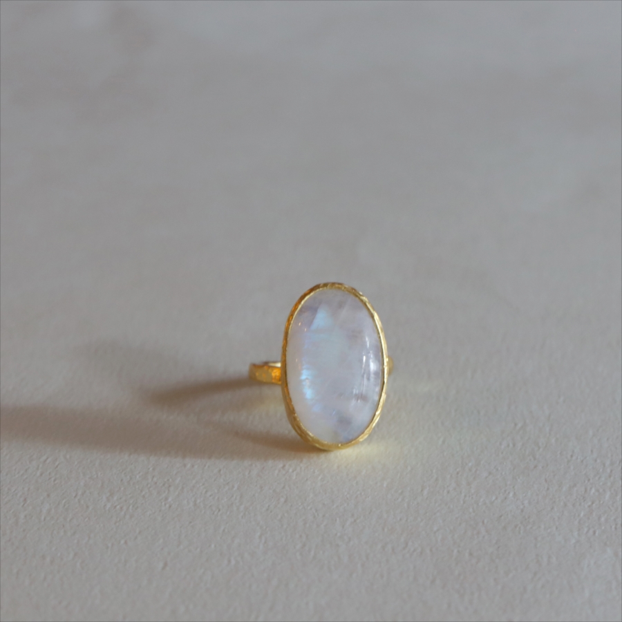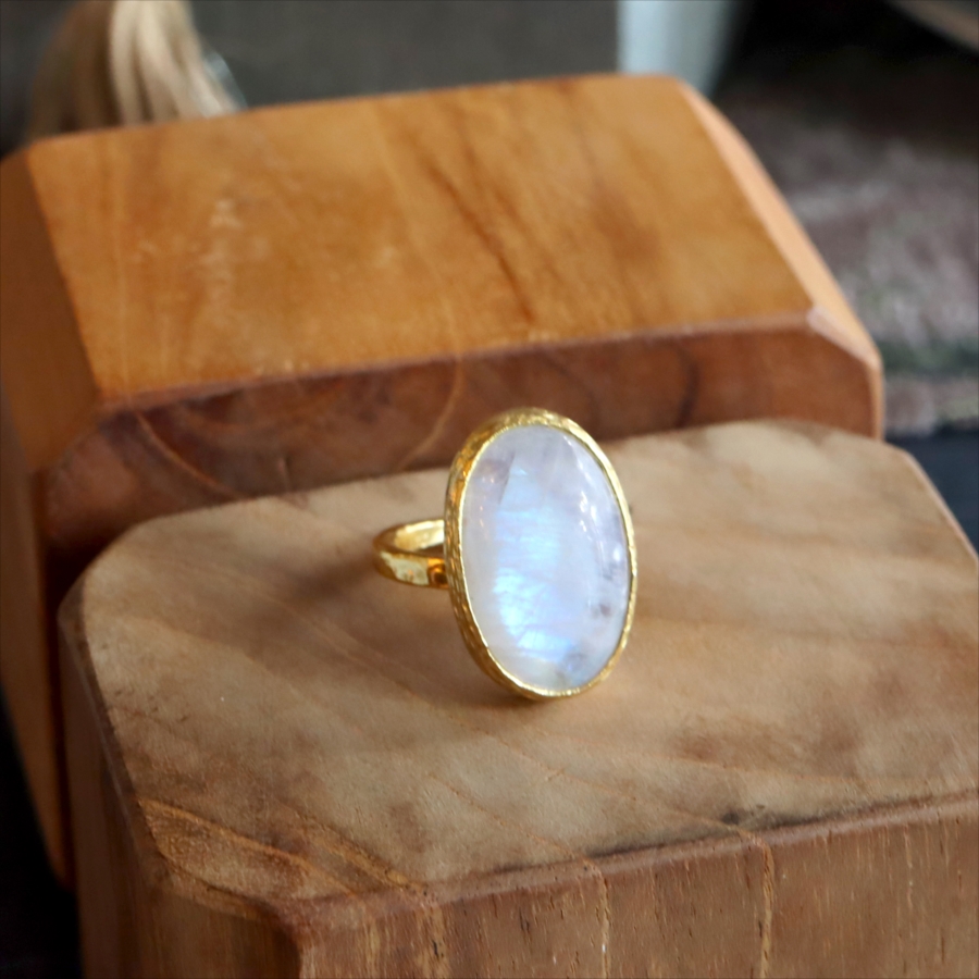 乳白色の大粒の石に幻想的な青みあるシラー(虹色の輝き)が美しい、存在感のあるリングです。ぽってりとボリューム感あるムーンストーンは艶やかで上品な印象です。