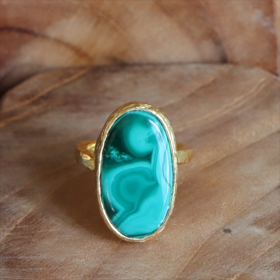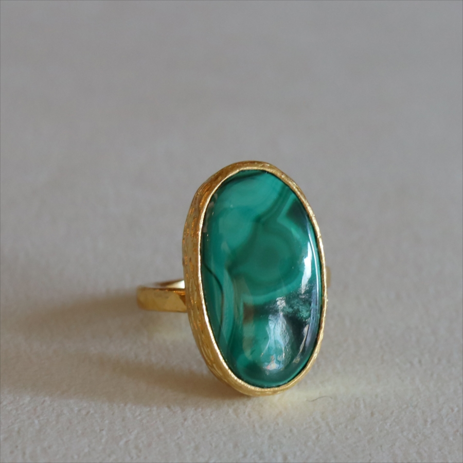 大粒のマラカイトを引き立てるため、デザインはあえてシンプルに。大胆なのにどこか落ち着きがあり、指先にしっくりなじむバランス感も魅力です。