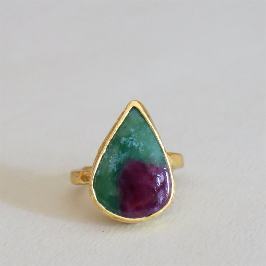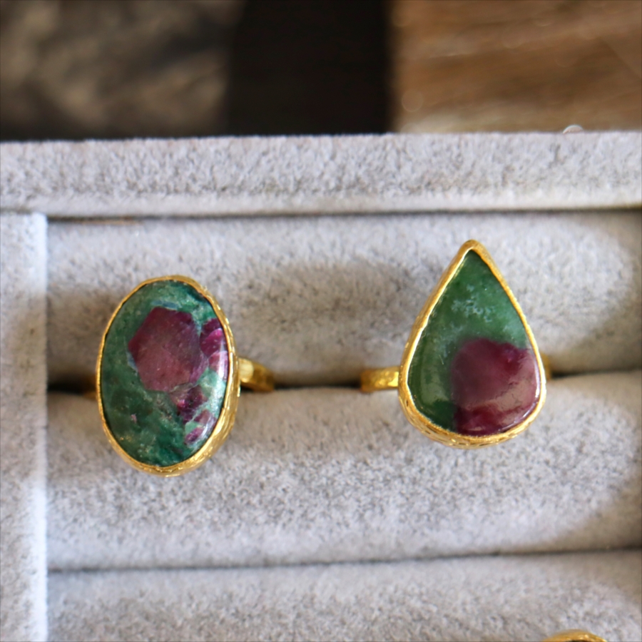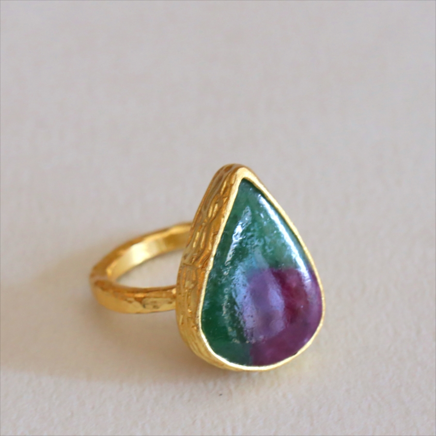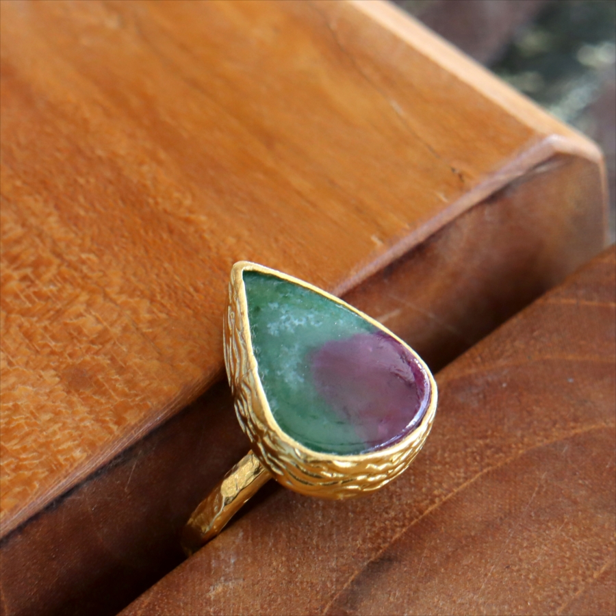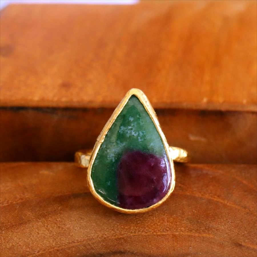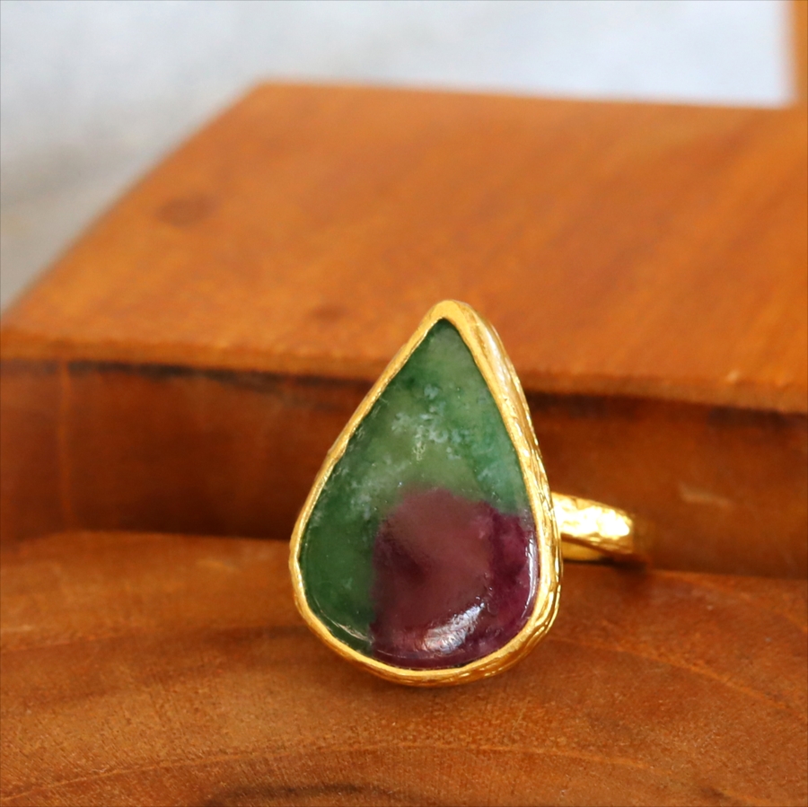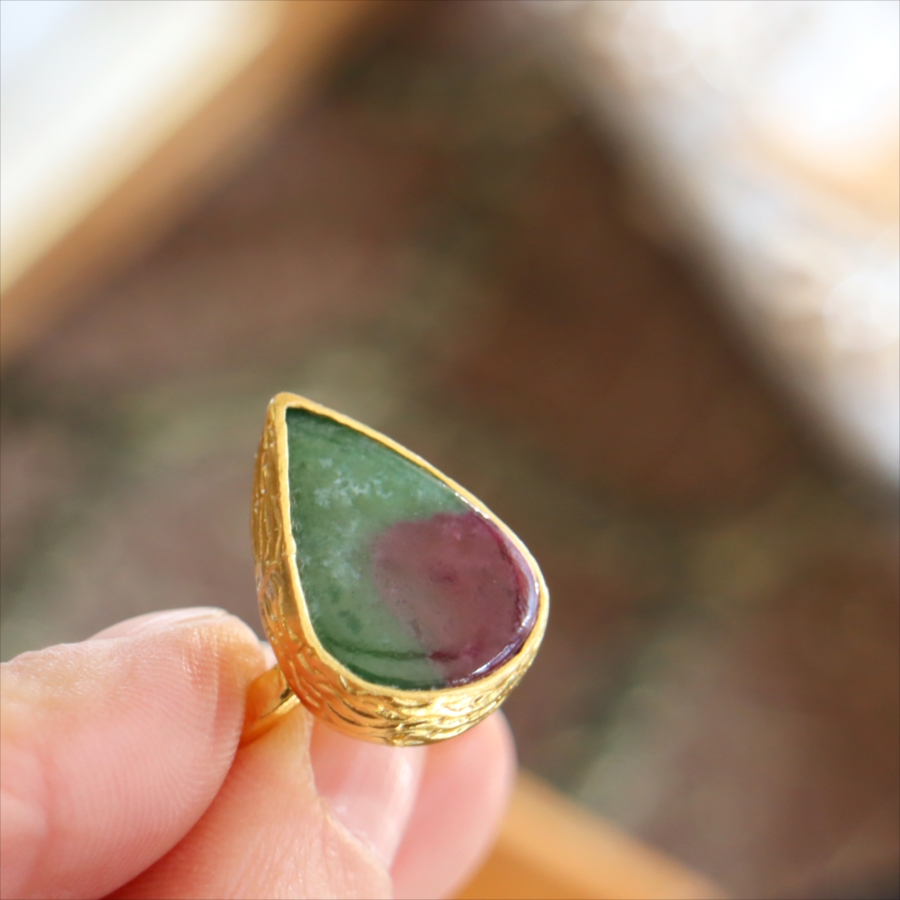 グリーンとワインレッドのエキゾチックなカラーが美しい、ルビーインゾイサイト(Ruby in Zoisite)のリング。鮮やかな緑色のゾイサイトの中に、紫からワインレッドのルビーの結晶が混ざり合った天然の変成岩です。まるで大地が長い時間をかけて描いた抽象画のよう。ひとつとして同じ表情はなく、自然が生み出したアートをそのまま楽しめるのが、この石の最大の魅力です。