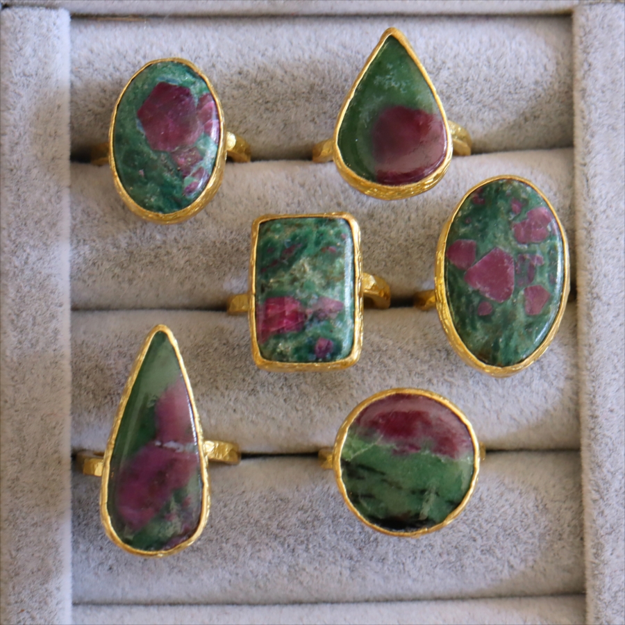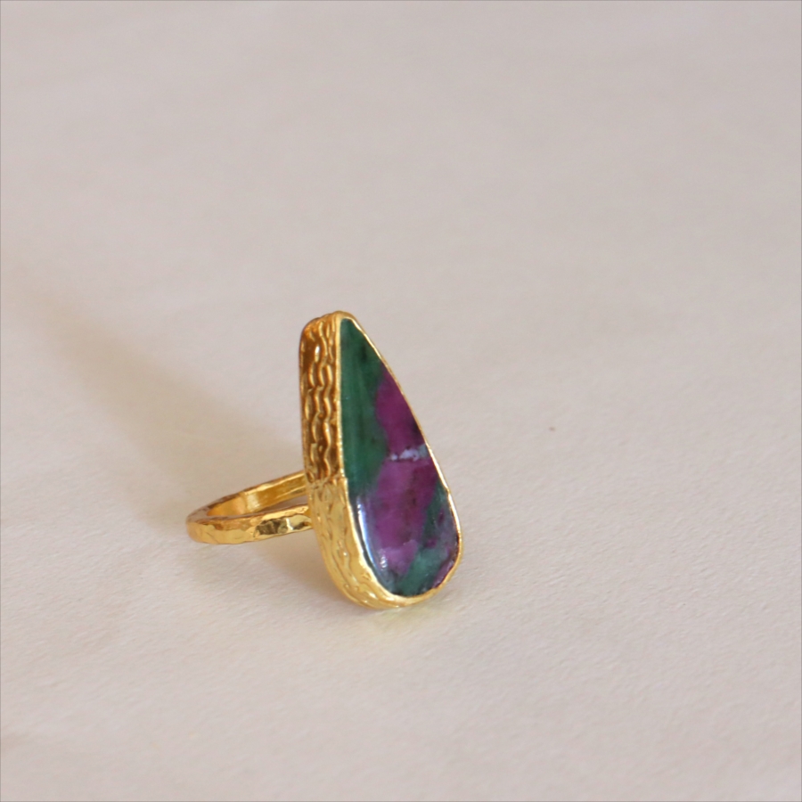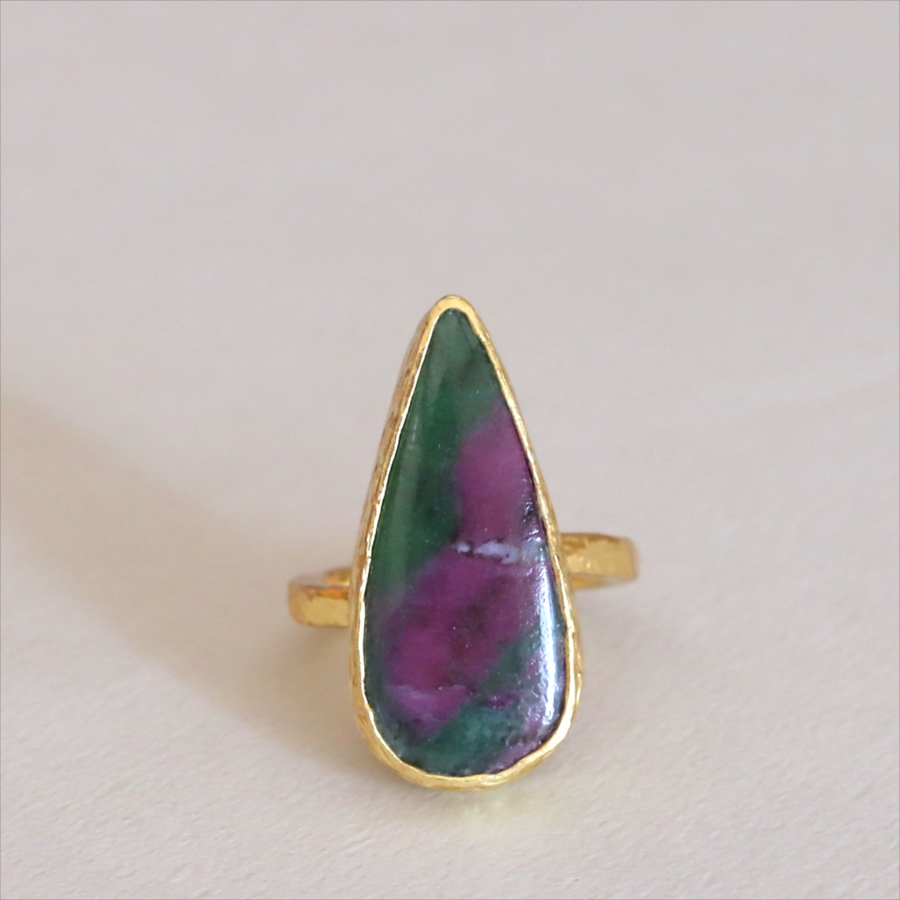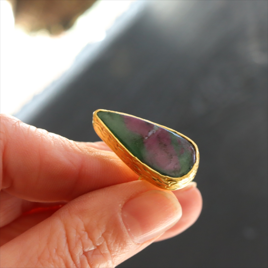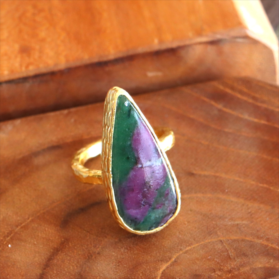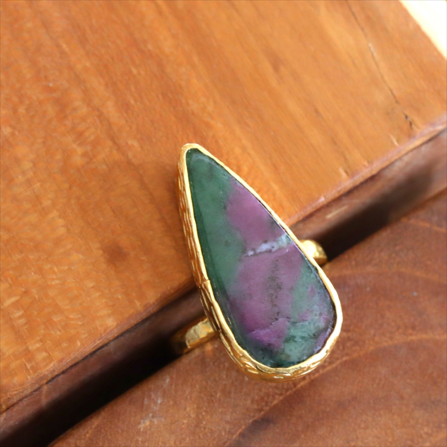 グリーンとワインレッドのエキゾチックなカラーが美しい、ルビーインゾイサイト(Ruby in Zoisite)のリング。鮮やかな緑色のゾイサイトの中に、紫からワインレッドのルビーの結晶が混ざり合った天然の変成岩です。まるで大地が長い時間をかけて描いた抽象画のよう。ひとつとして同じ表情はなく、自然が生み出したアートをそのまま楽しめるのが、この石の最大の魅力です。