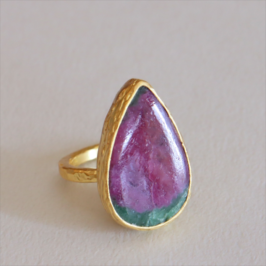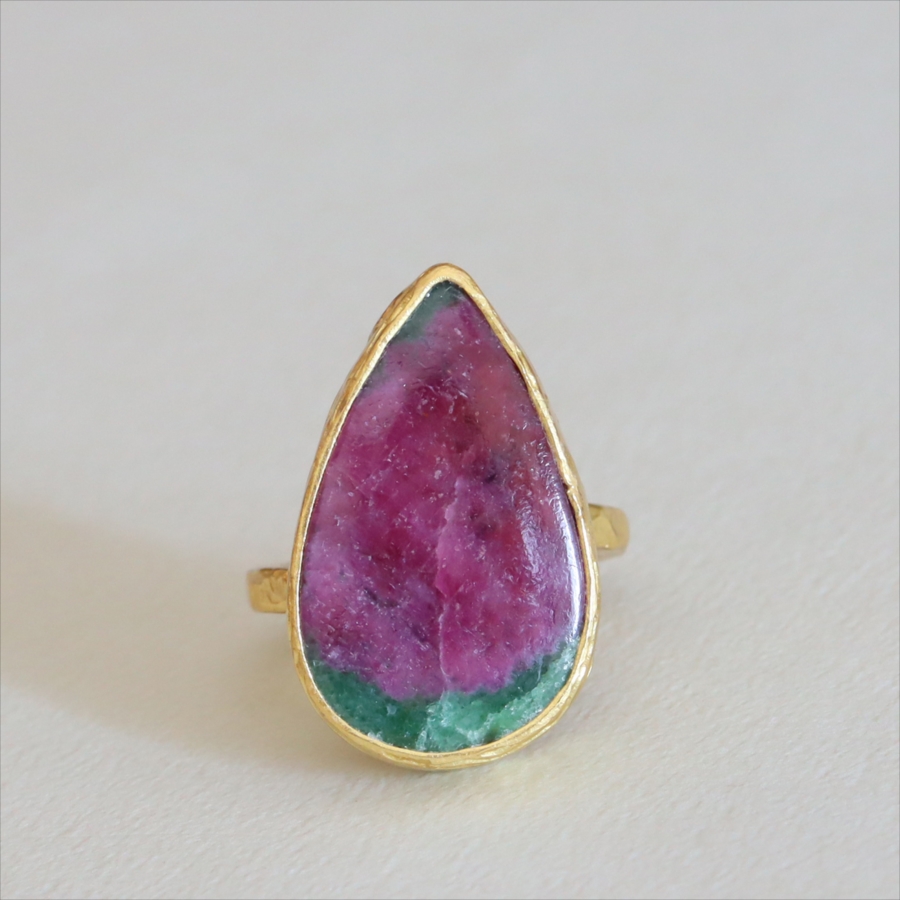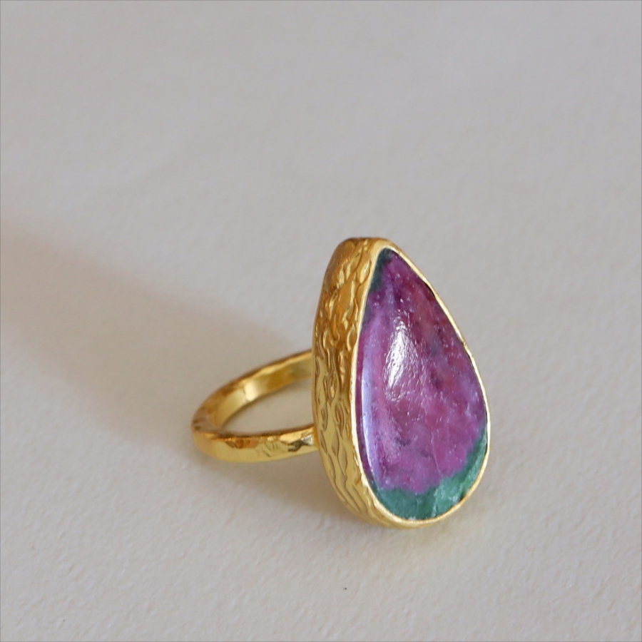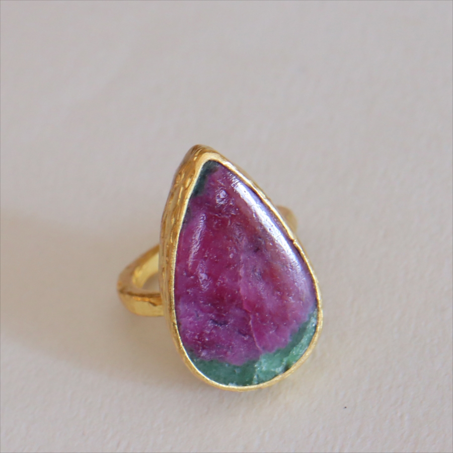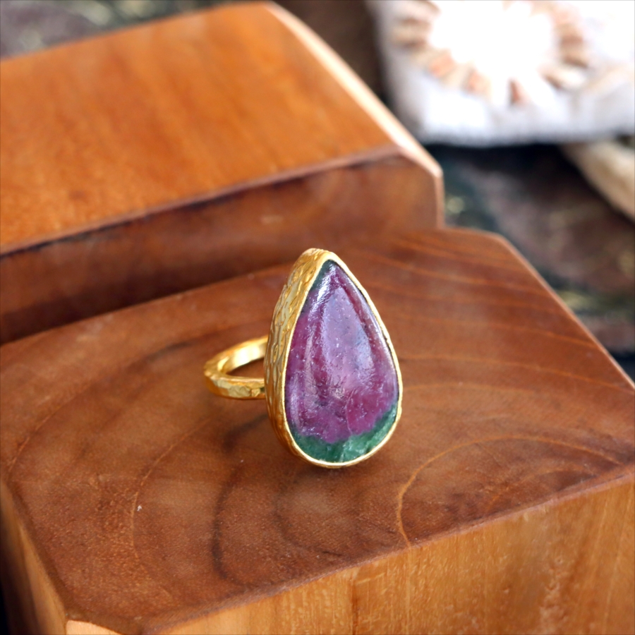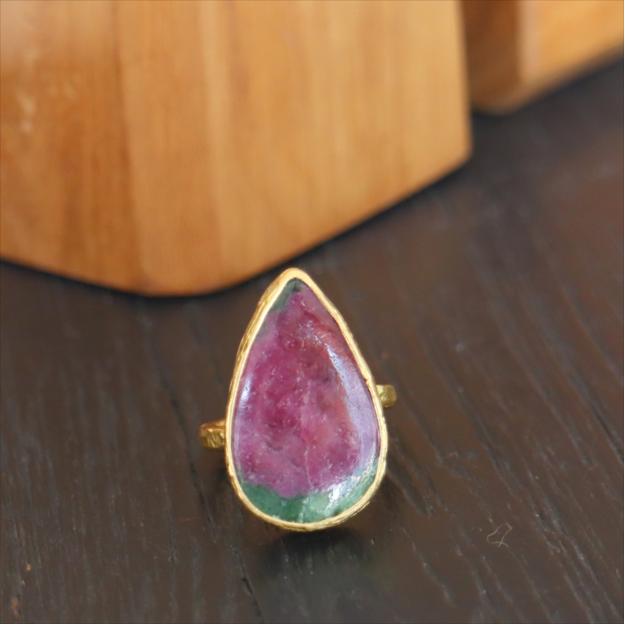 グリーンとワインレッドのエキゾチックなカラーが美しい、ルビーインゾイサイト(Ruby in Zoisite)のリング。鮮やかな緑色のゾイサイトの中に、紫からワインレッドのルビーの結晶が混ざり合った天然の変成岩です。まるで大地が長い時間をかけて描いた抽象画のよう。ひとつとして同じ表情はなく、自然が生み出したアートをそのまま楽しめるのが、この石の最大の魅力です。