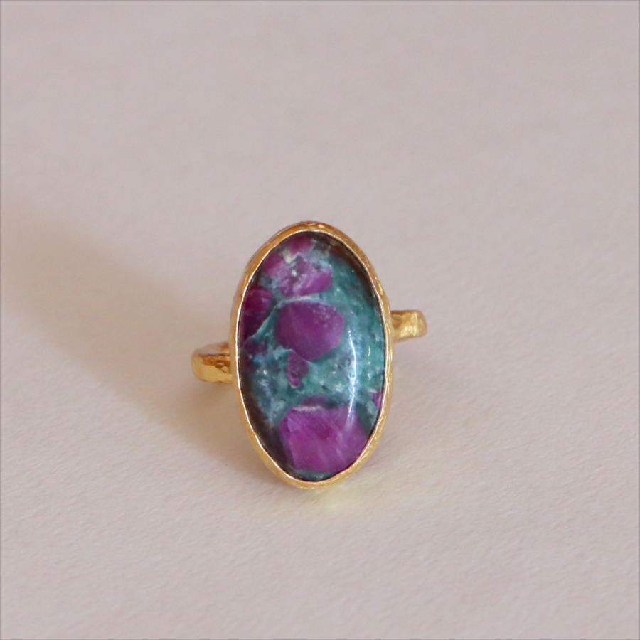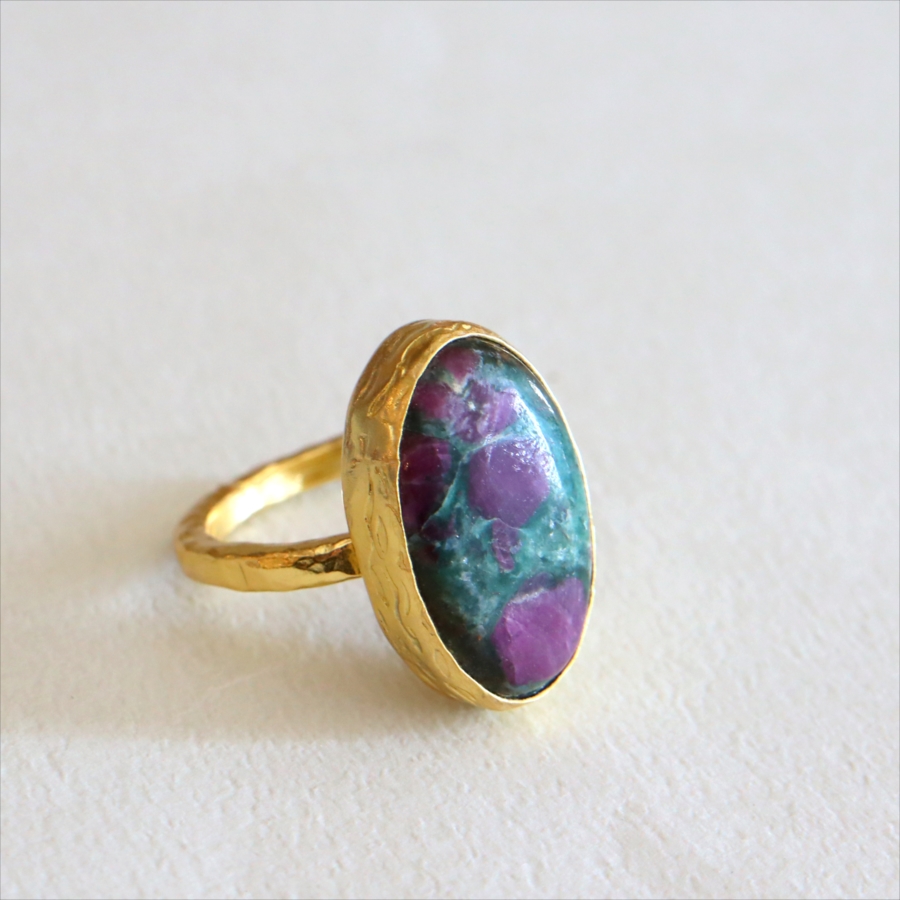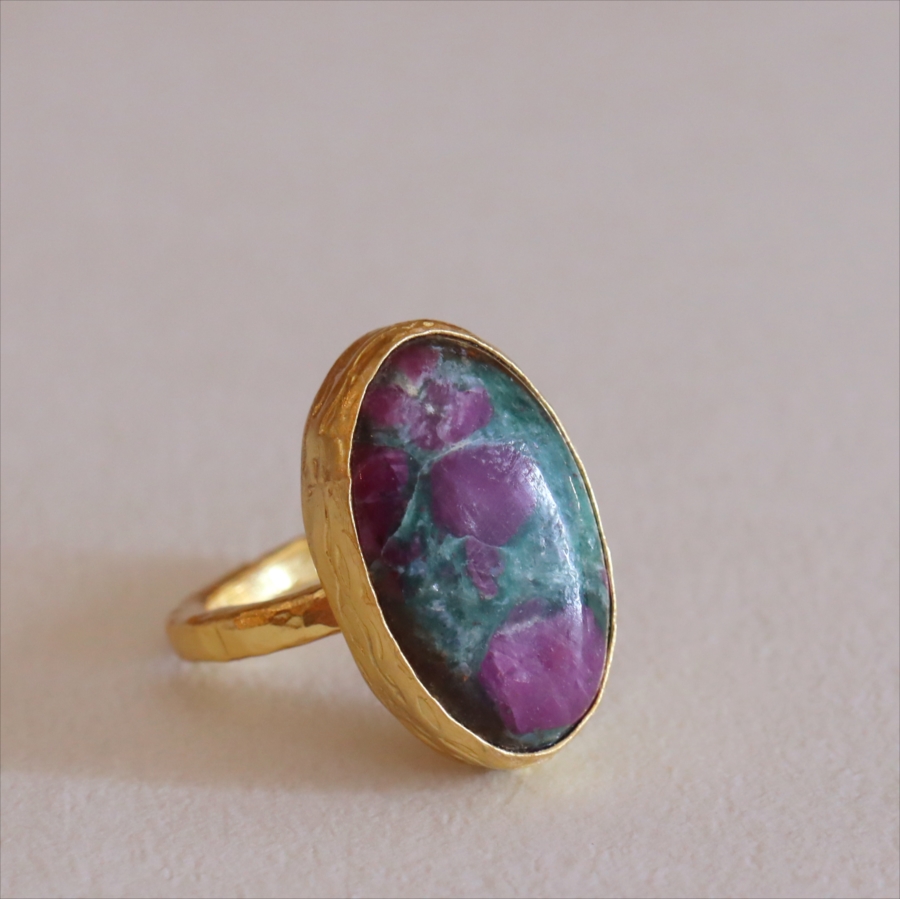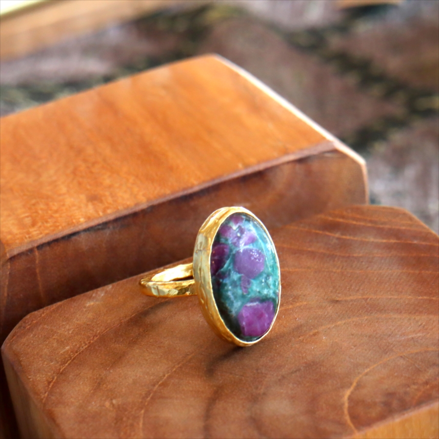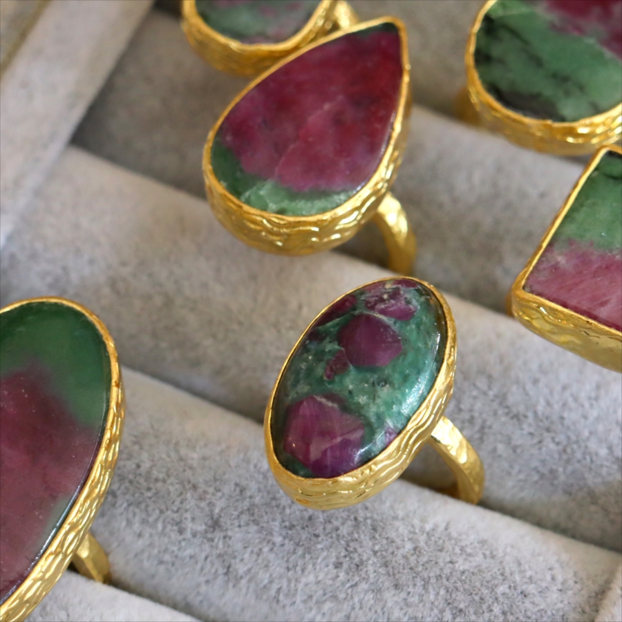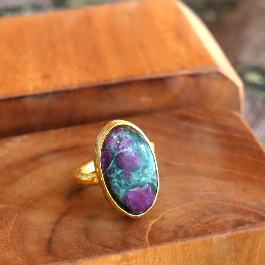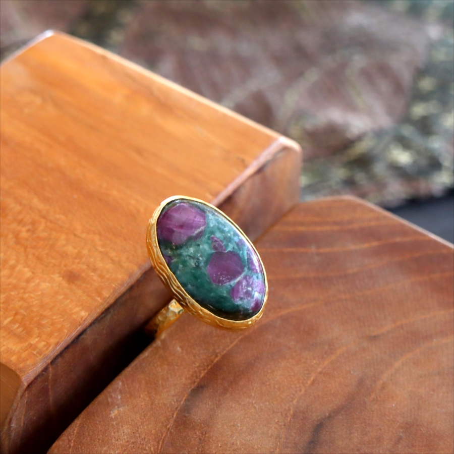 グリーンとワインレッドのエキゾチックなカラーが美しい、ルビーインゾイサイト(Ruby in Zoisite)のリング。鮮やかな緑色のゾイサイトの中に、紫からワインレッドのルビーの結晶が混ざり合った天然の変成岩です。まるで大地が長い時間をかけて描いた抽象画のよう。ひとつとして同じ表情はなく、自然が生み出したアートをそのまま楽しめるのが、この石の最大の魅力です。