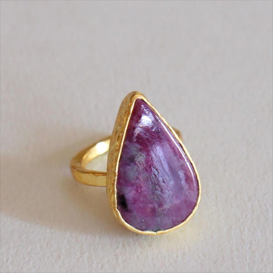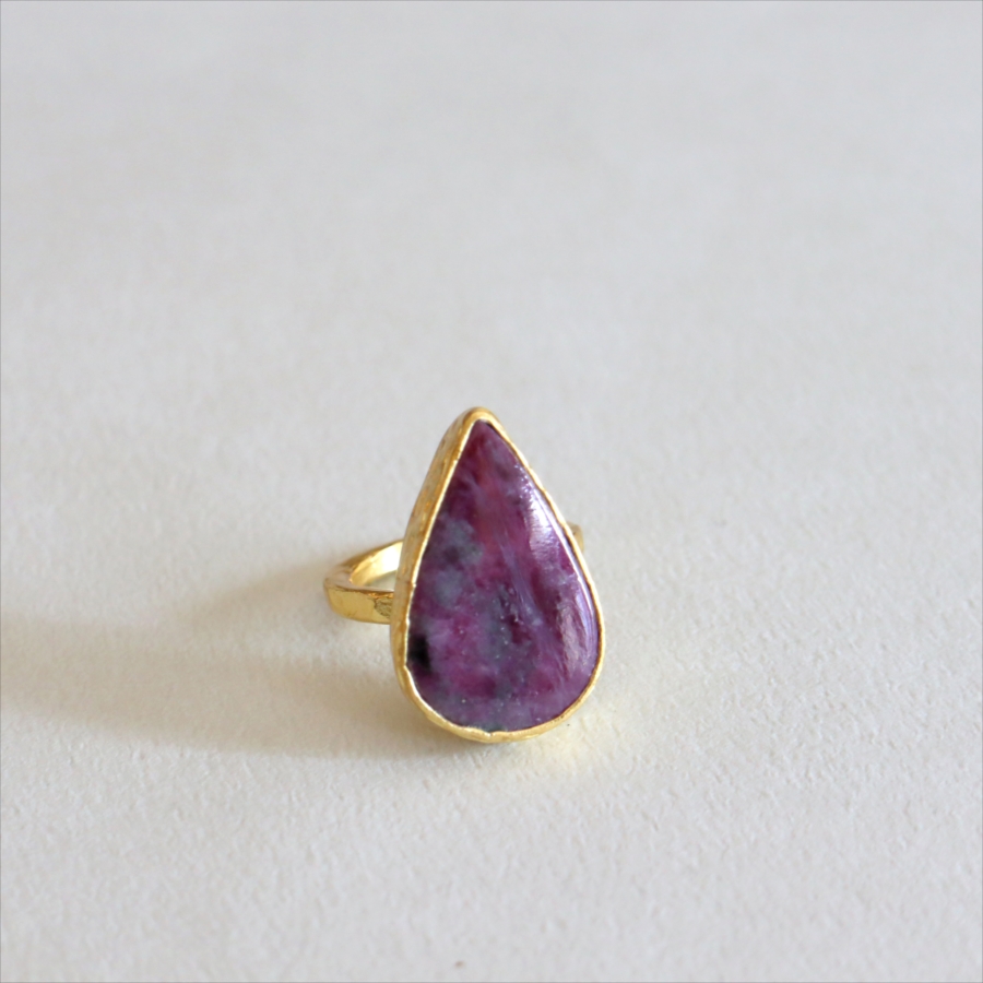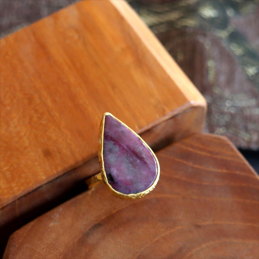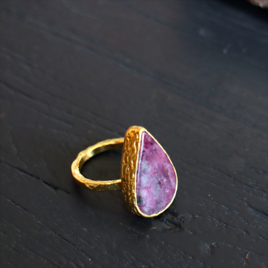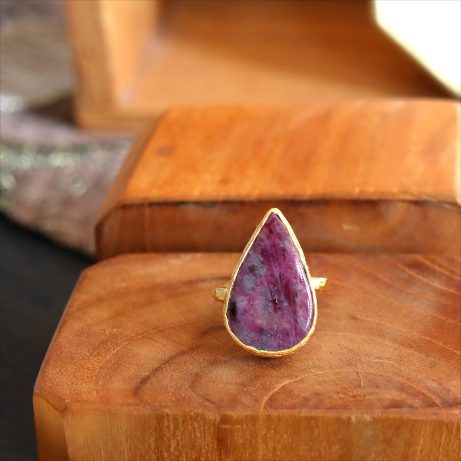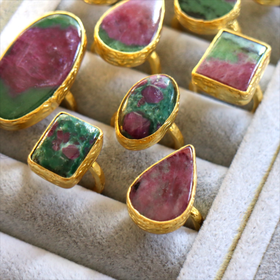 グリーンとワインレッドのエキゾチックなカラーが美しい、ルビーインゾイサイト(Ruby in Zoisite)のリング。鮮やかな緑色のゾイサイトの中に、紫からワインレッドのルビーの結晶が混ざり合った天然の変成岩です。まるで大地が長い時間をかけて描いた抽象画のよう。ひとつとして同じ表情はなく、自然が生み出したアートをそのまま楽しめるのが、この石の最大の魅力です。