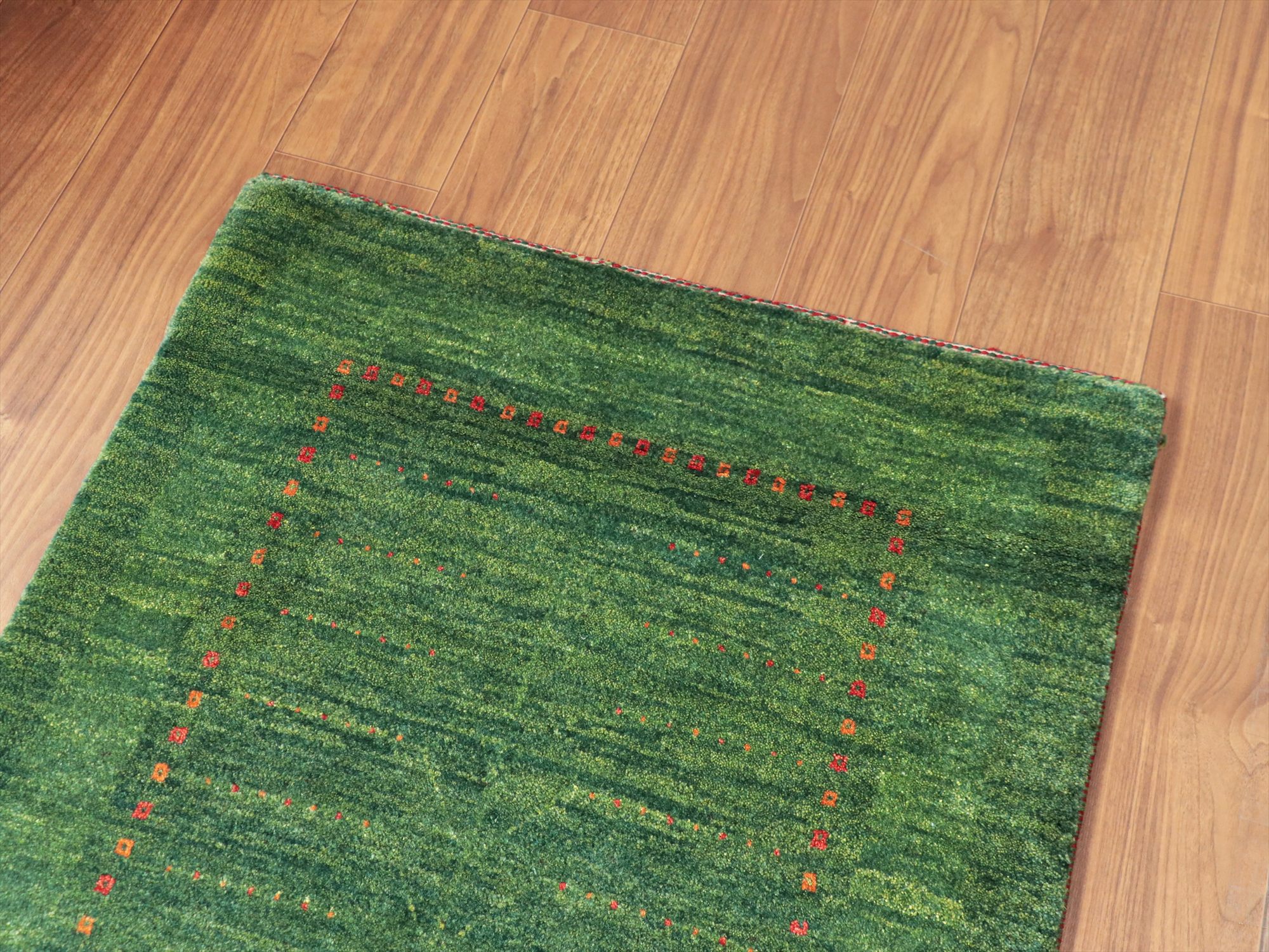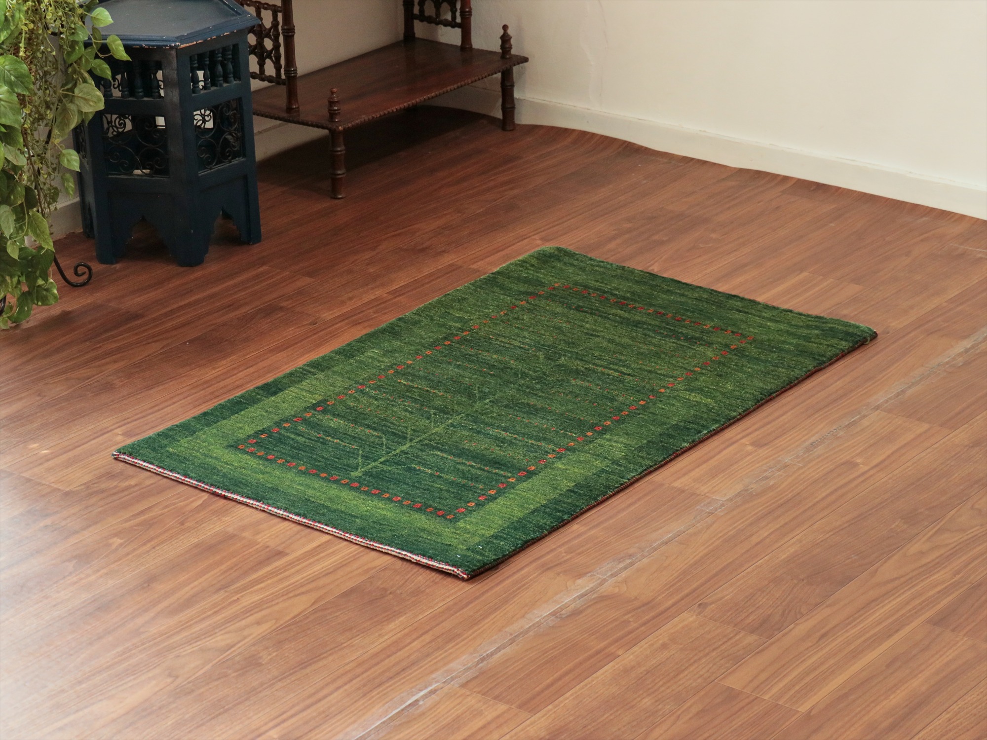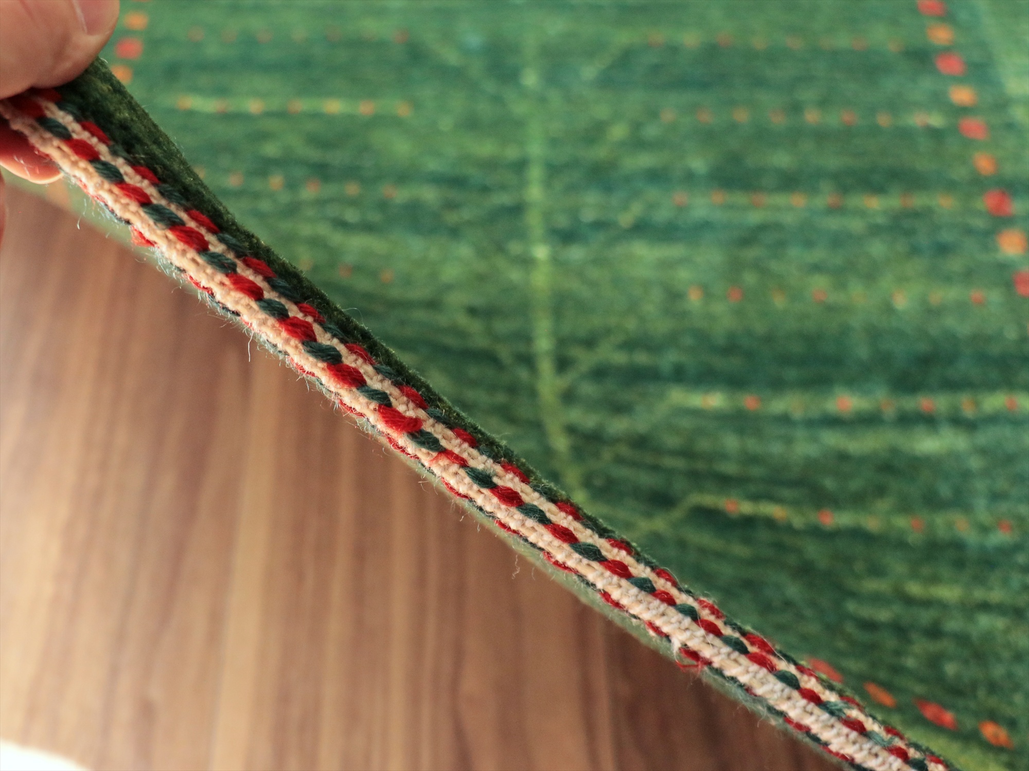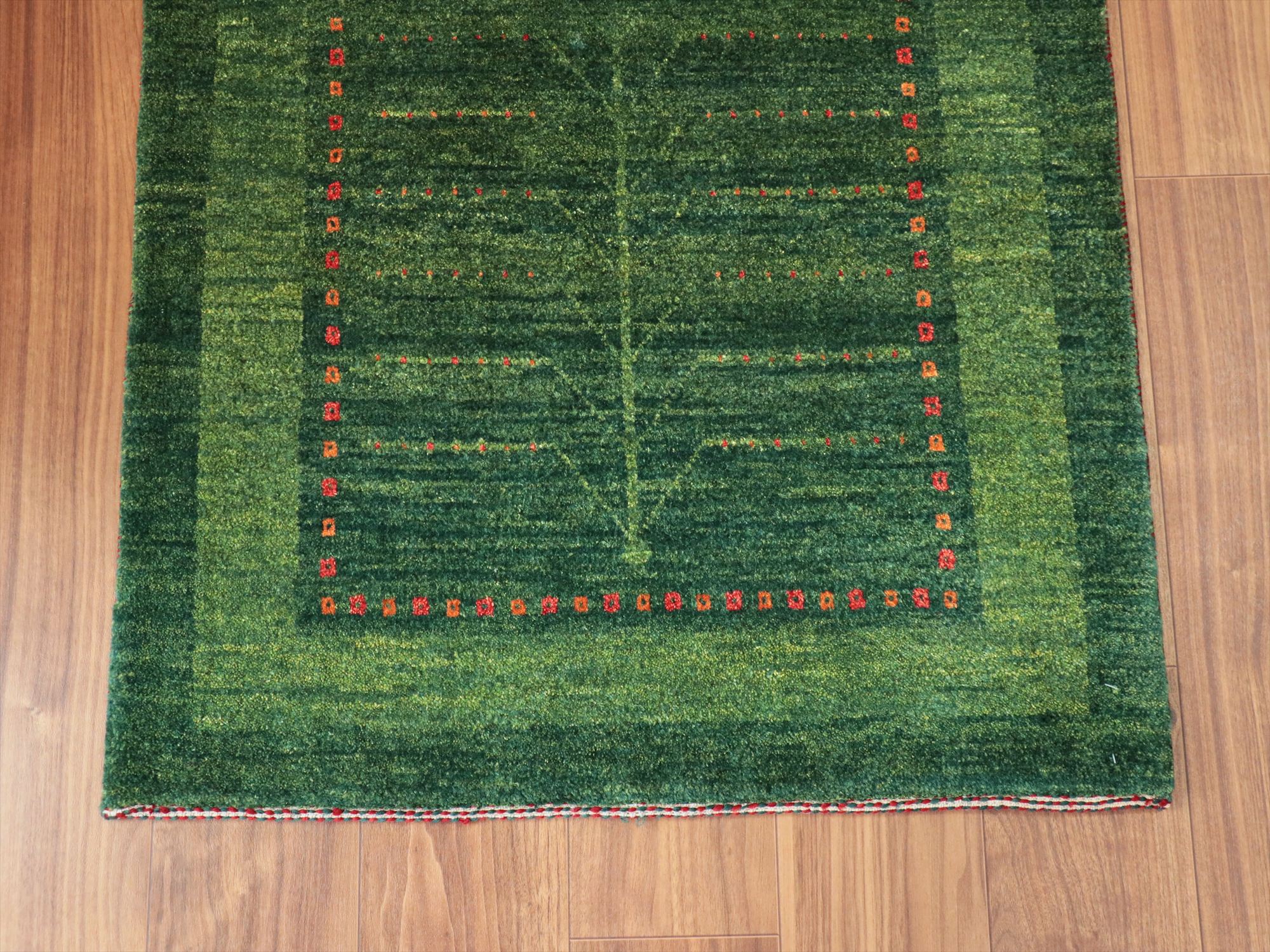 トーンの違うグリーンを使って、上品なボーダーがデザインされています。中央には生命の樹のモチーフ、その周りに赤とオレンジの小さな幾何学モチーフが入っています。ギャベらしい伝統柄をアレンジしつつ、モダンですっきりしたデザインに仕上がっています。