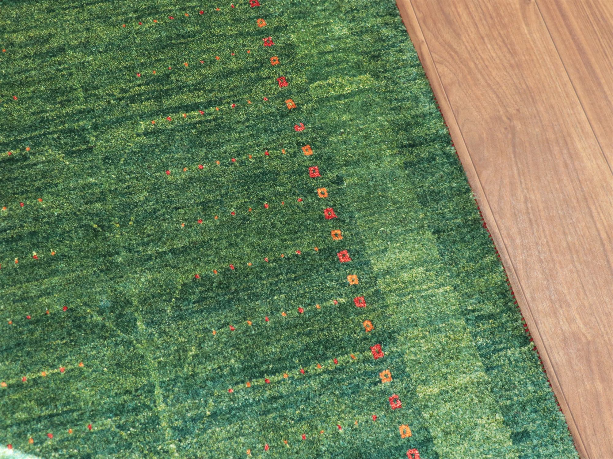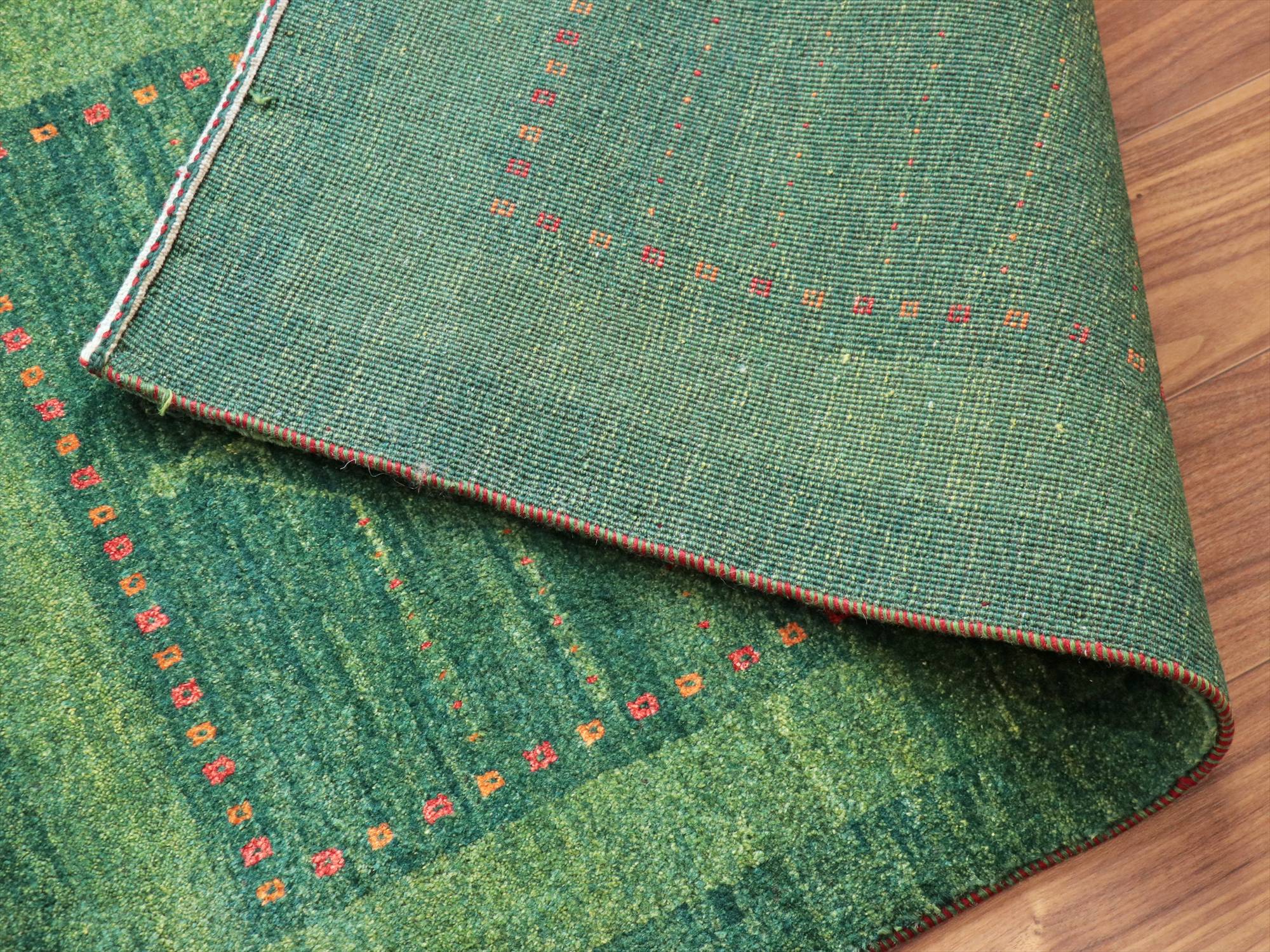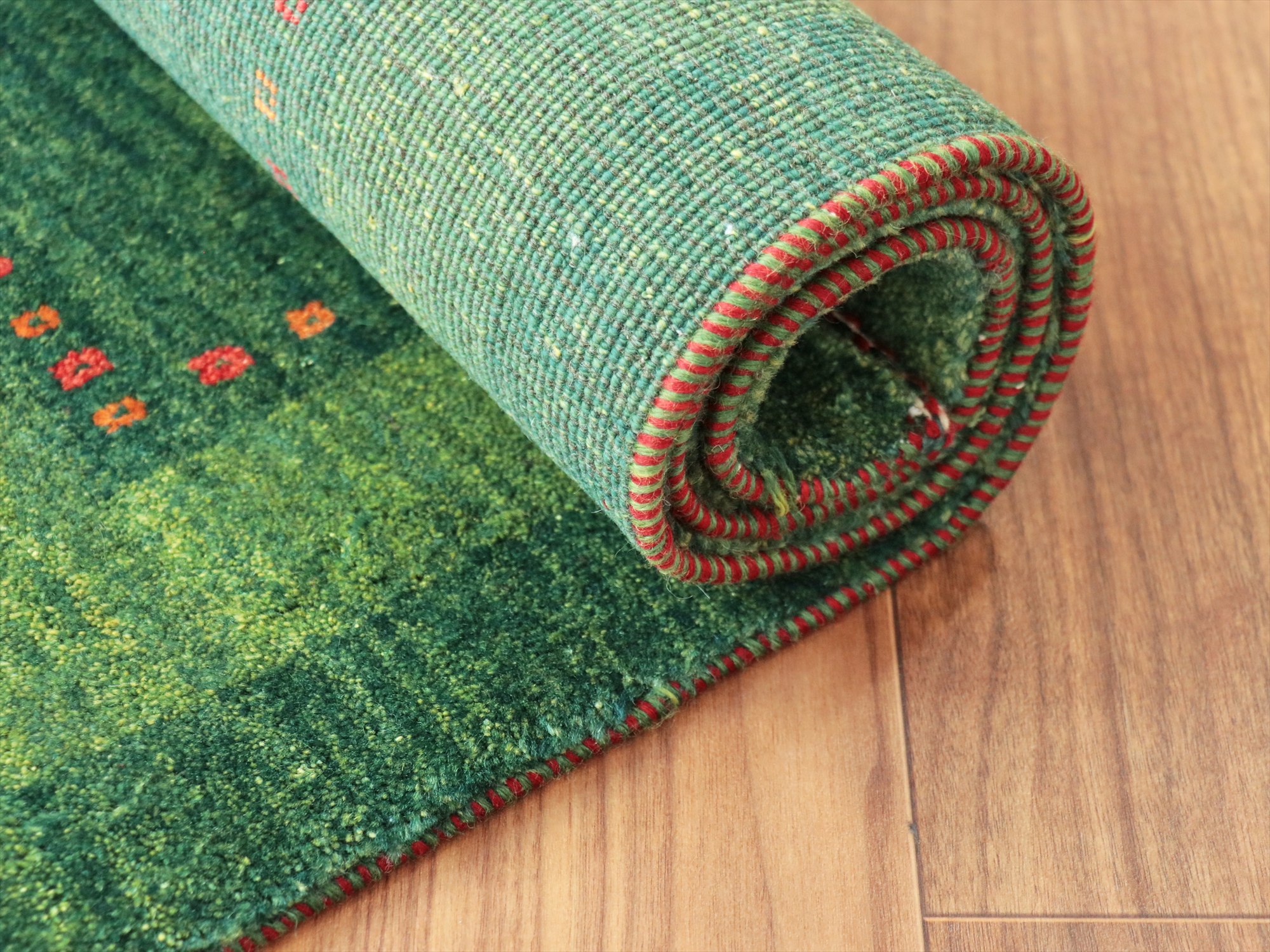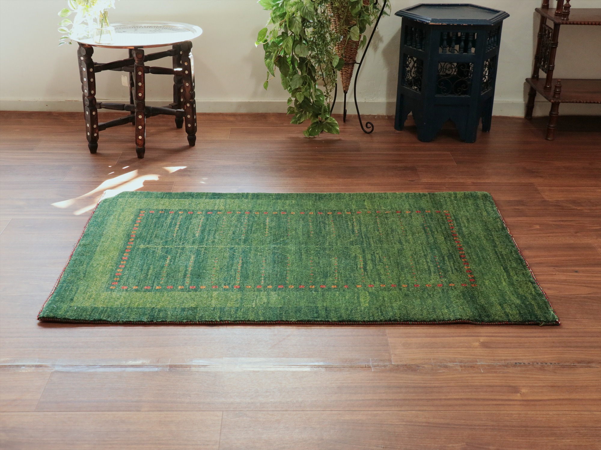 トーンの違うグリーンを使って、上品なボーダーがデザインされています。中央には生命の樹のモチーフ、その周りに赤とオレンジの小さな幾何学モチーフが入っています。ギャベらしい伝統柄をアレンジしつつ、モダンですっきりしたデザインに仕上がっています。