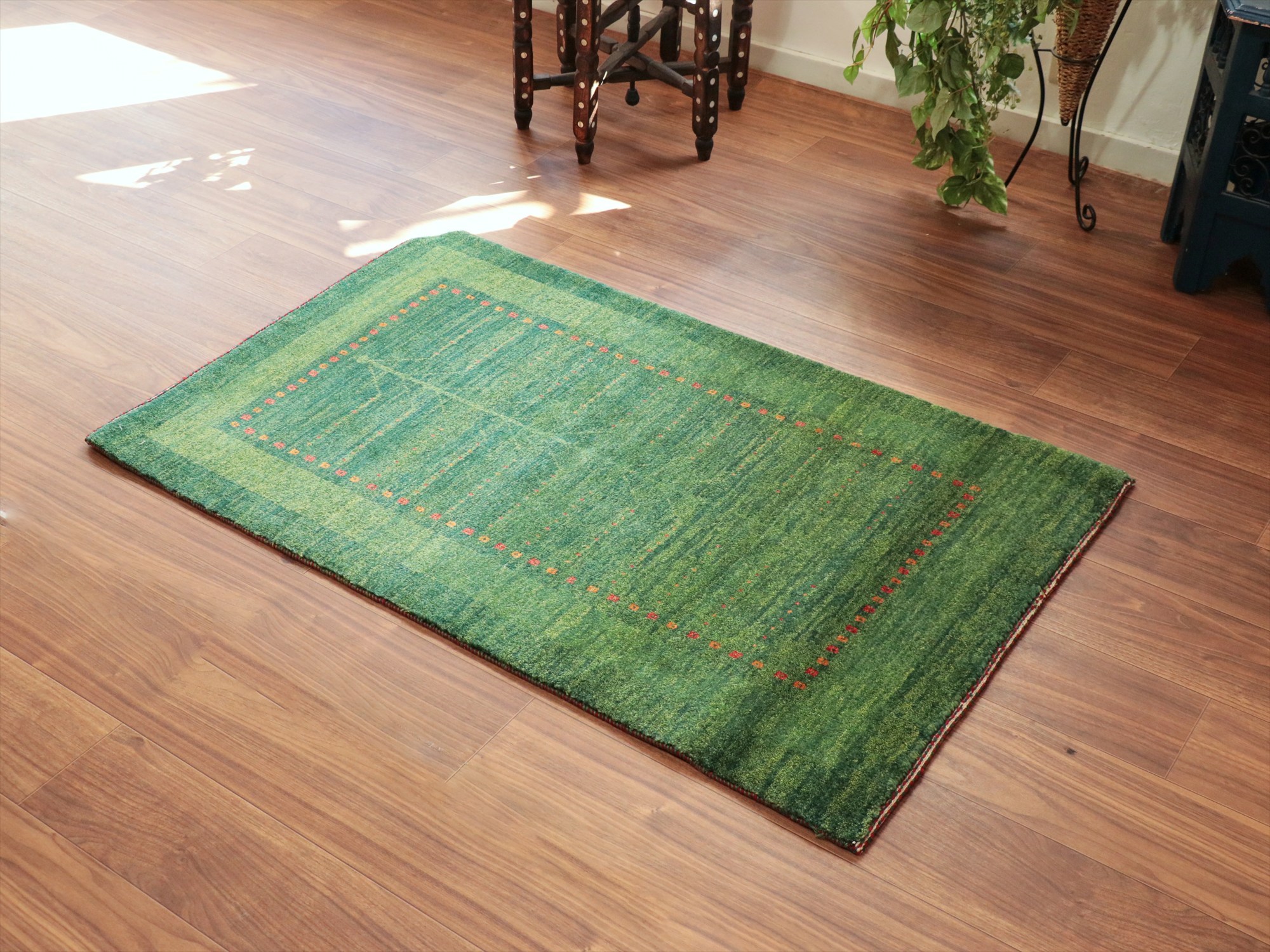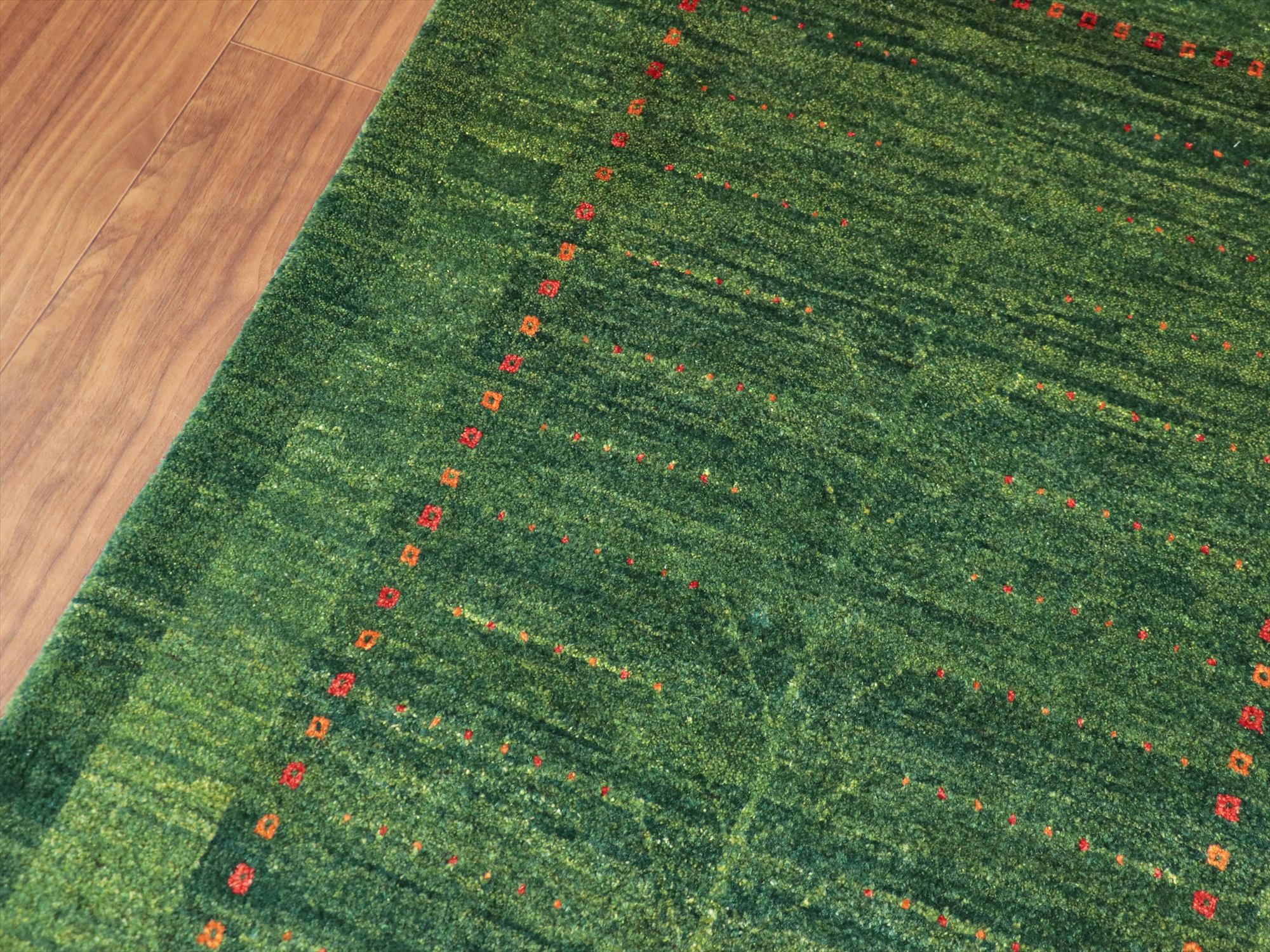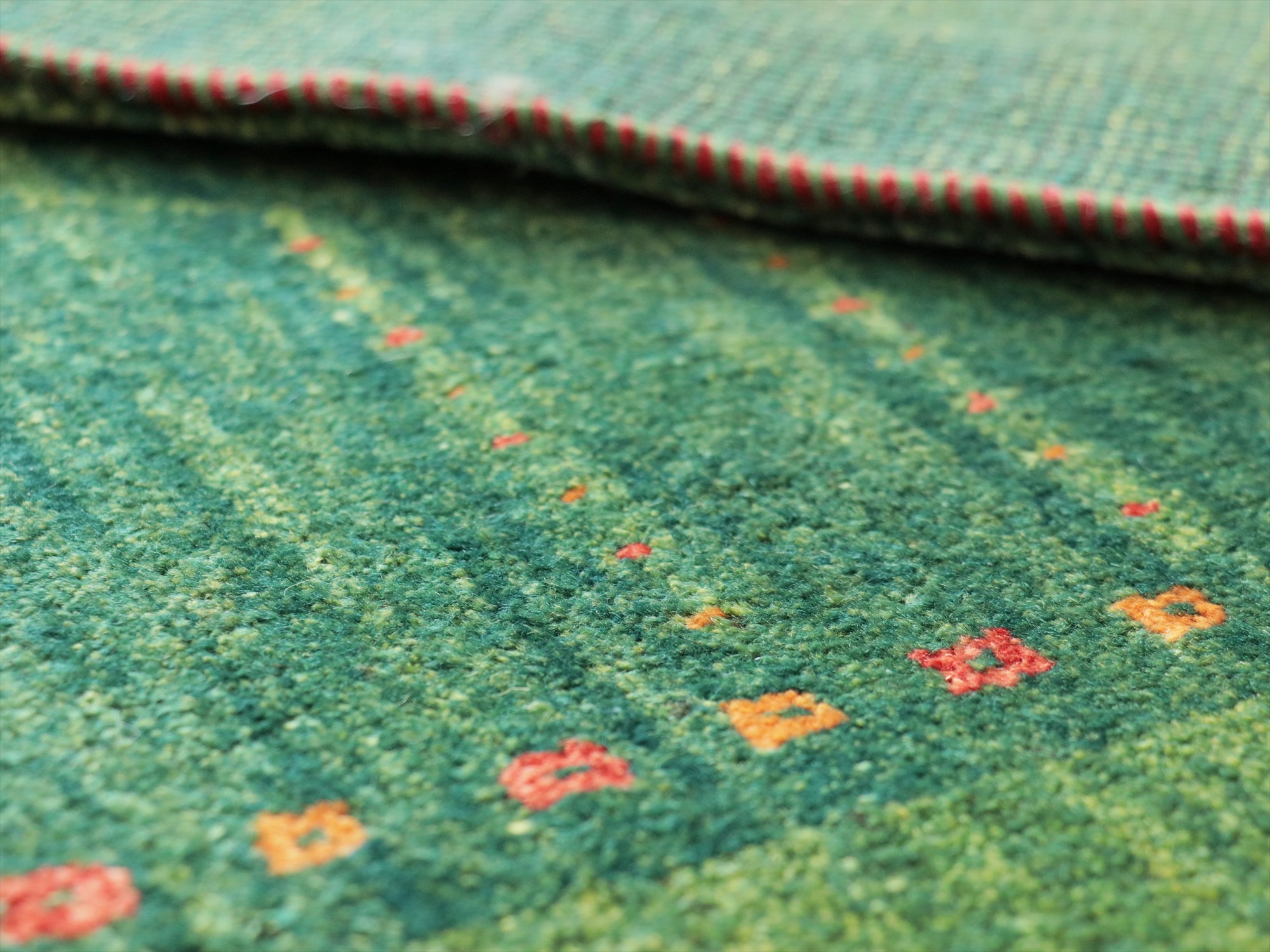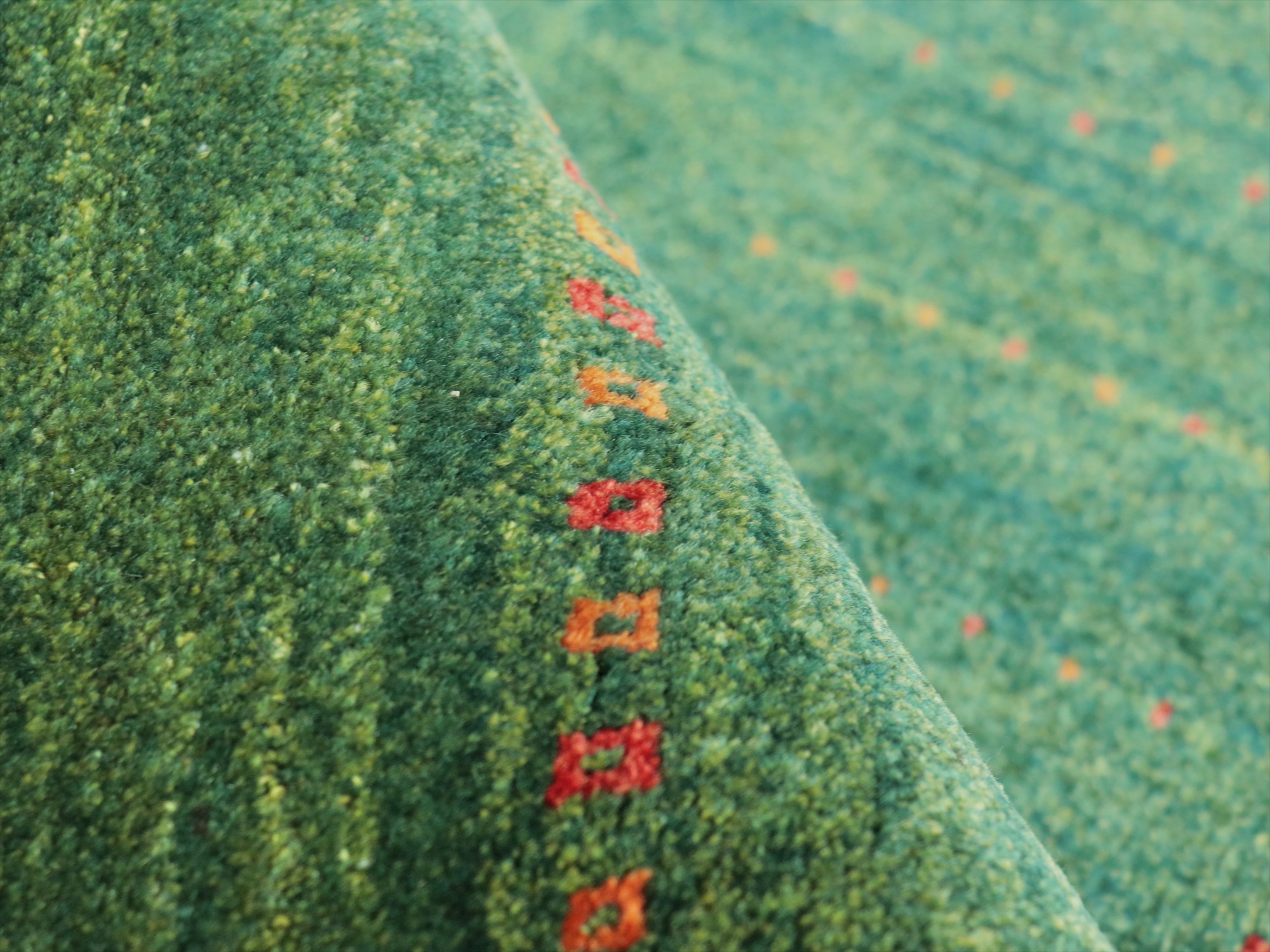 トーンの違うグリーンを使って、上品なボーダーがデザインされています。中央には生命の樹のモチーフ、その周りに赤とオレンジの小さな幾何学モチーフが入っています。ギャベらしい伝統柄をアレンジしつつ、モダンですっきりしたデザインに仕上がっています。