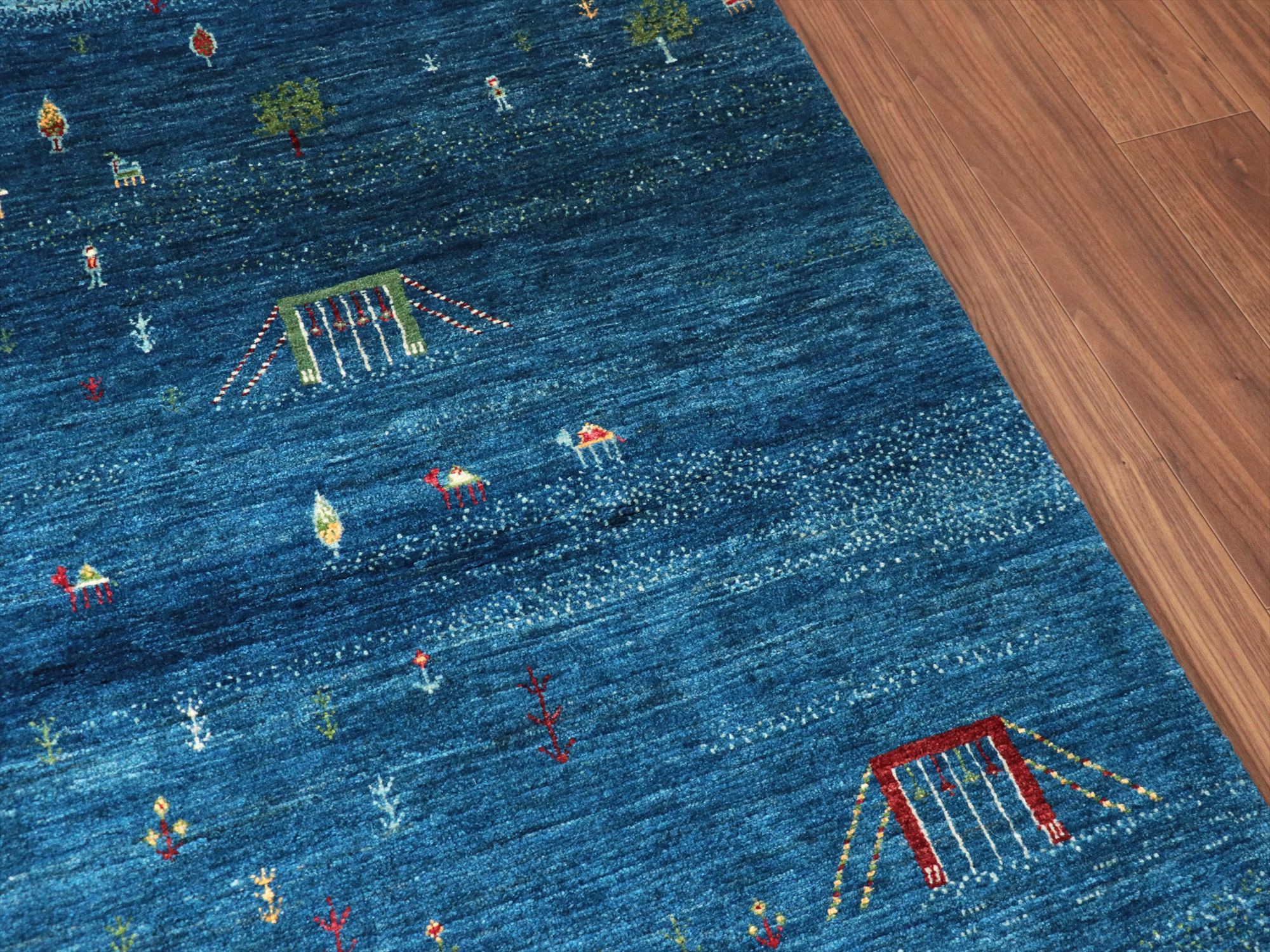 遠くまで広がる草原で暮らすカシュカイ族の村の風景のデザイン。大家族が暮らすテントが張られて、その周囲に動物たちや草花い、そしてスカートをはいた女性の姿も見られます。ブルーが溶け合うグラデーションがきれいな一枚。