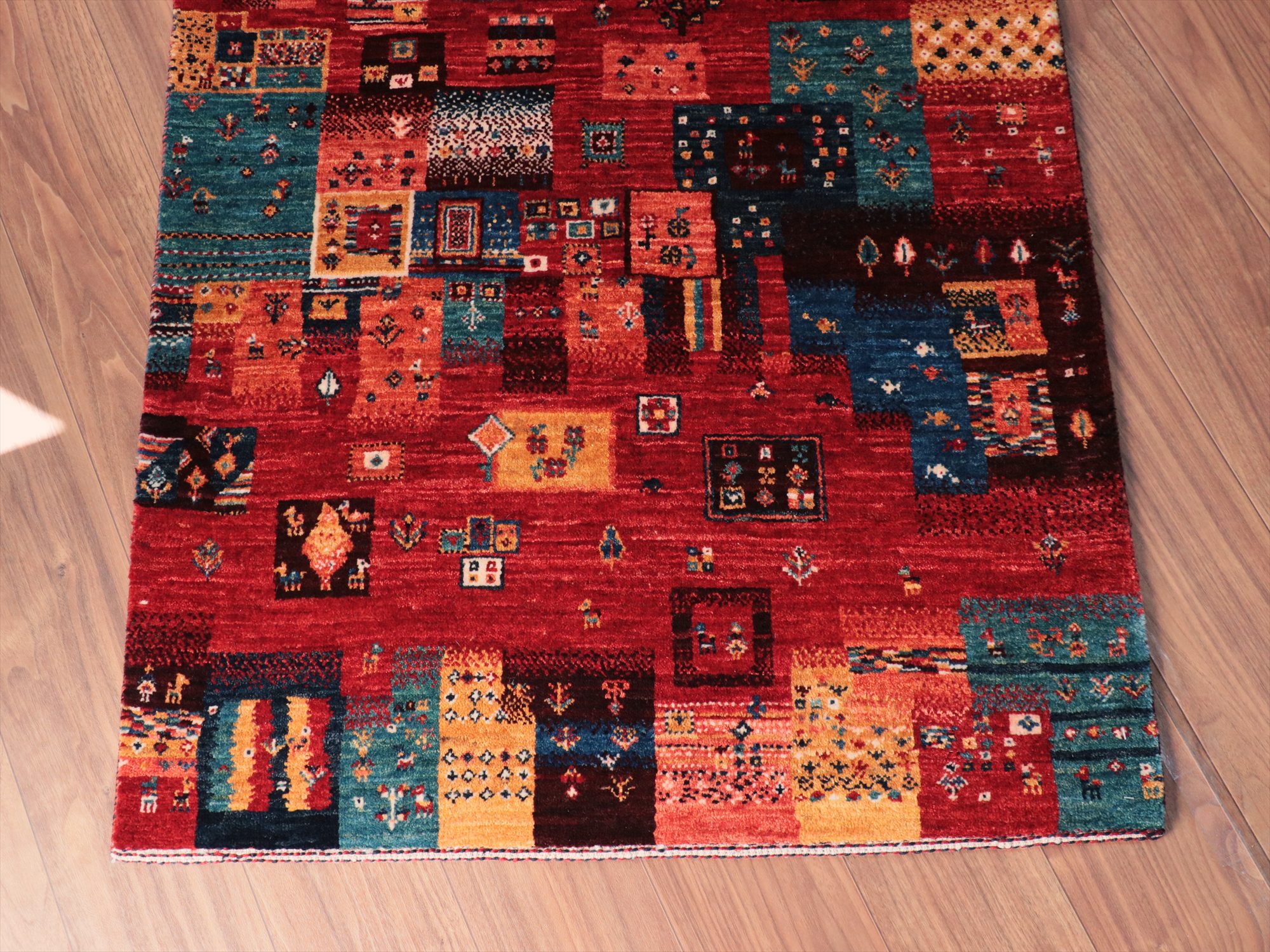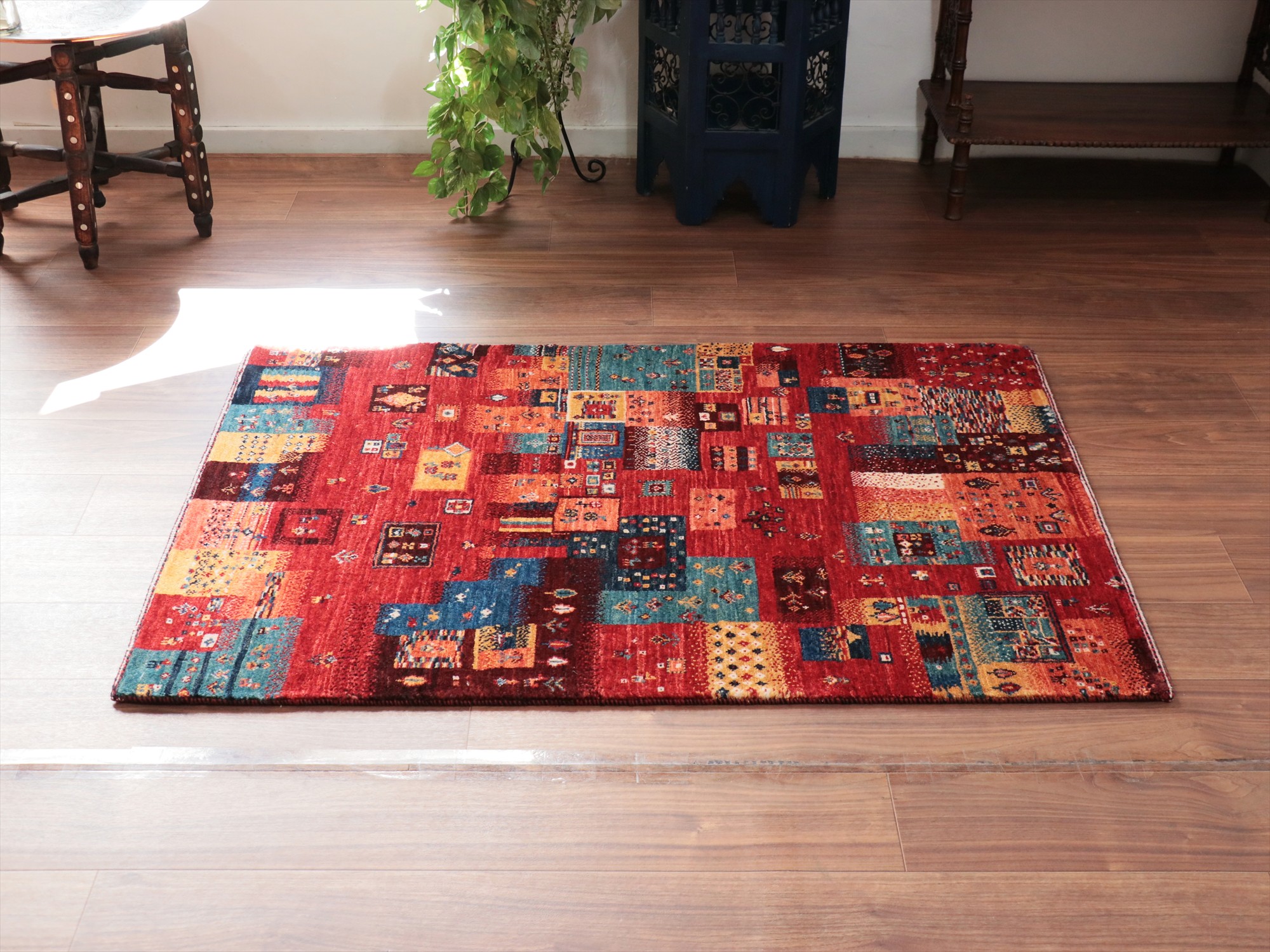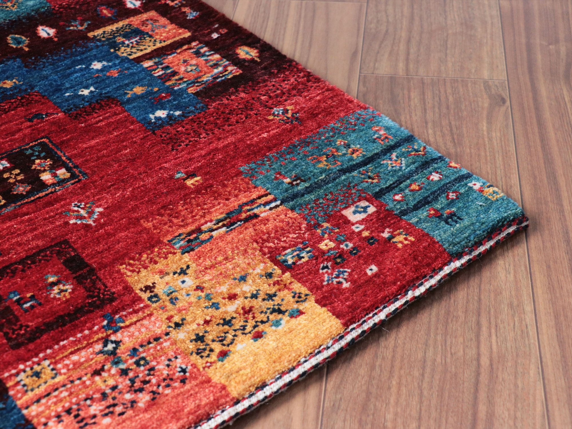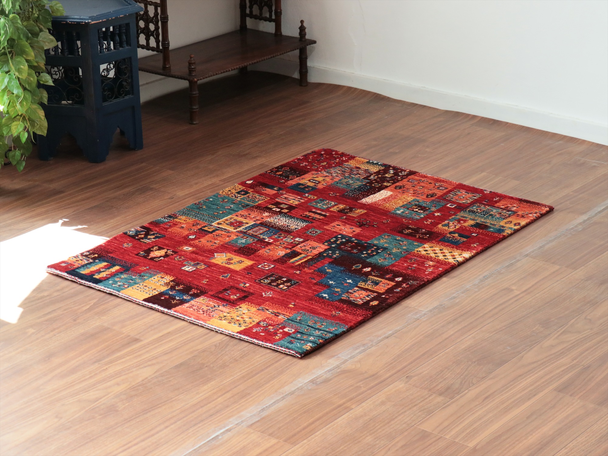 毛足は短く、手触りはやわらかく滑らかです。表面には光沢があります。パイルを含めたギャベの厚みは、1.2-1.3cm程度。