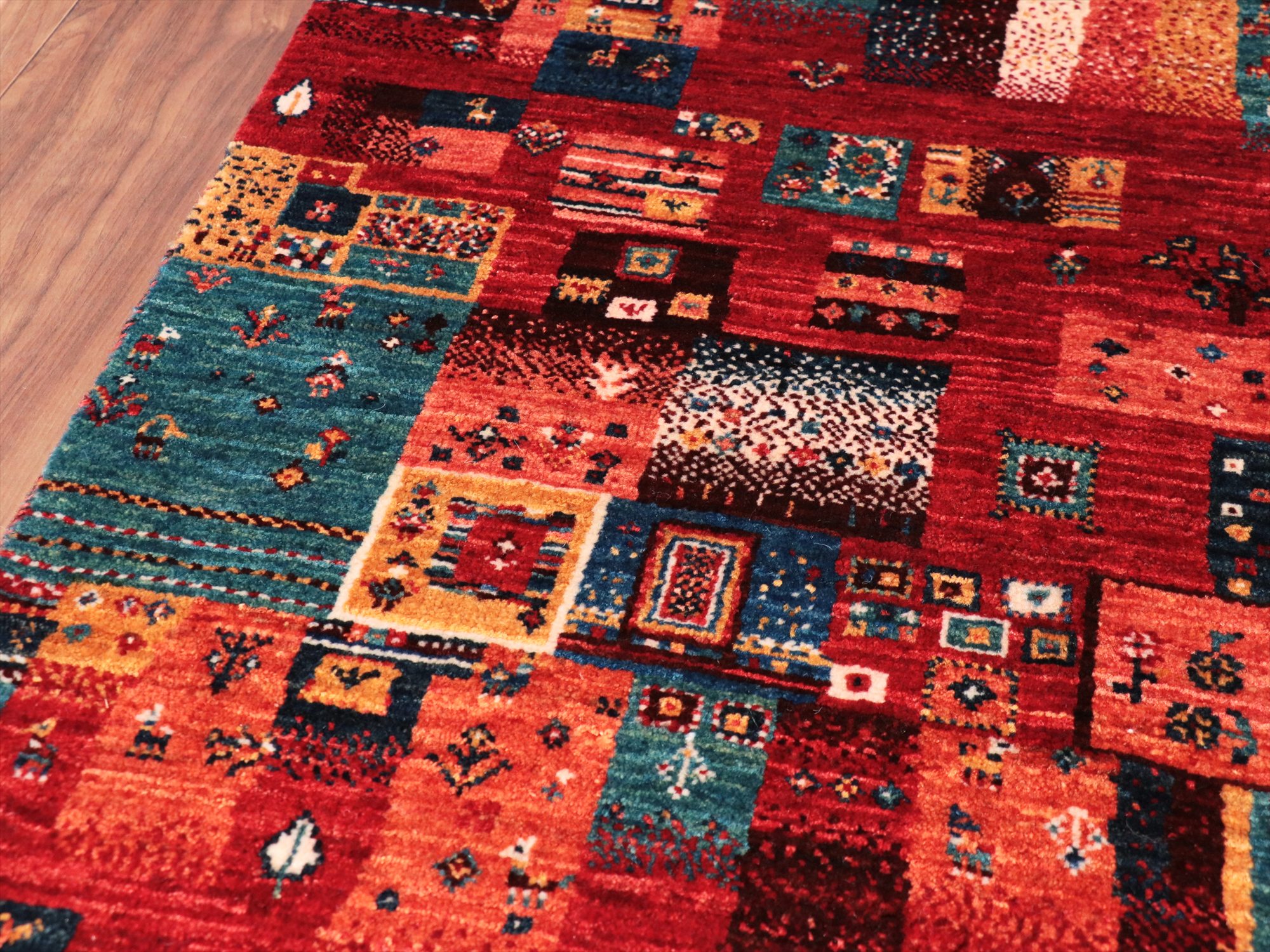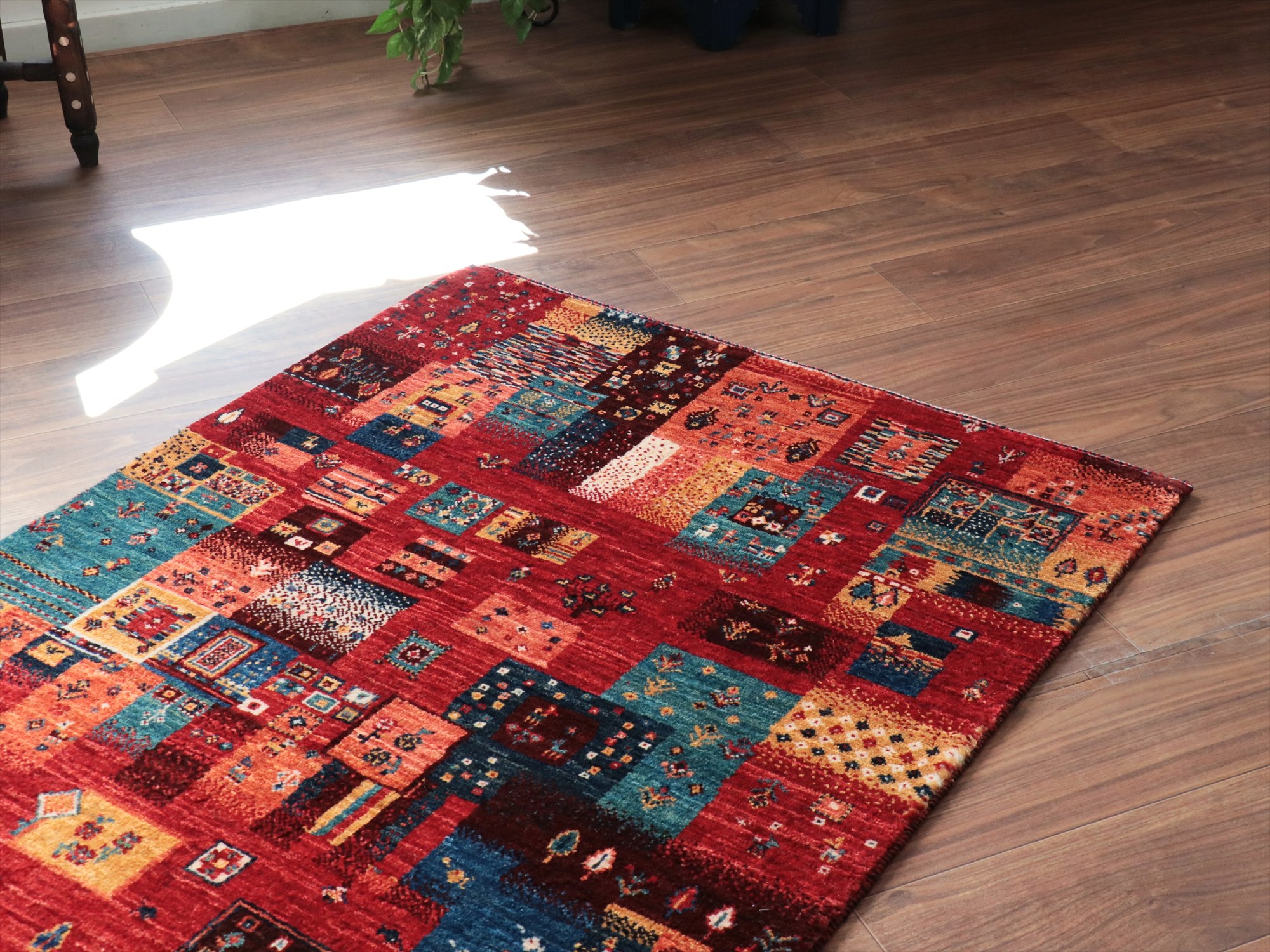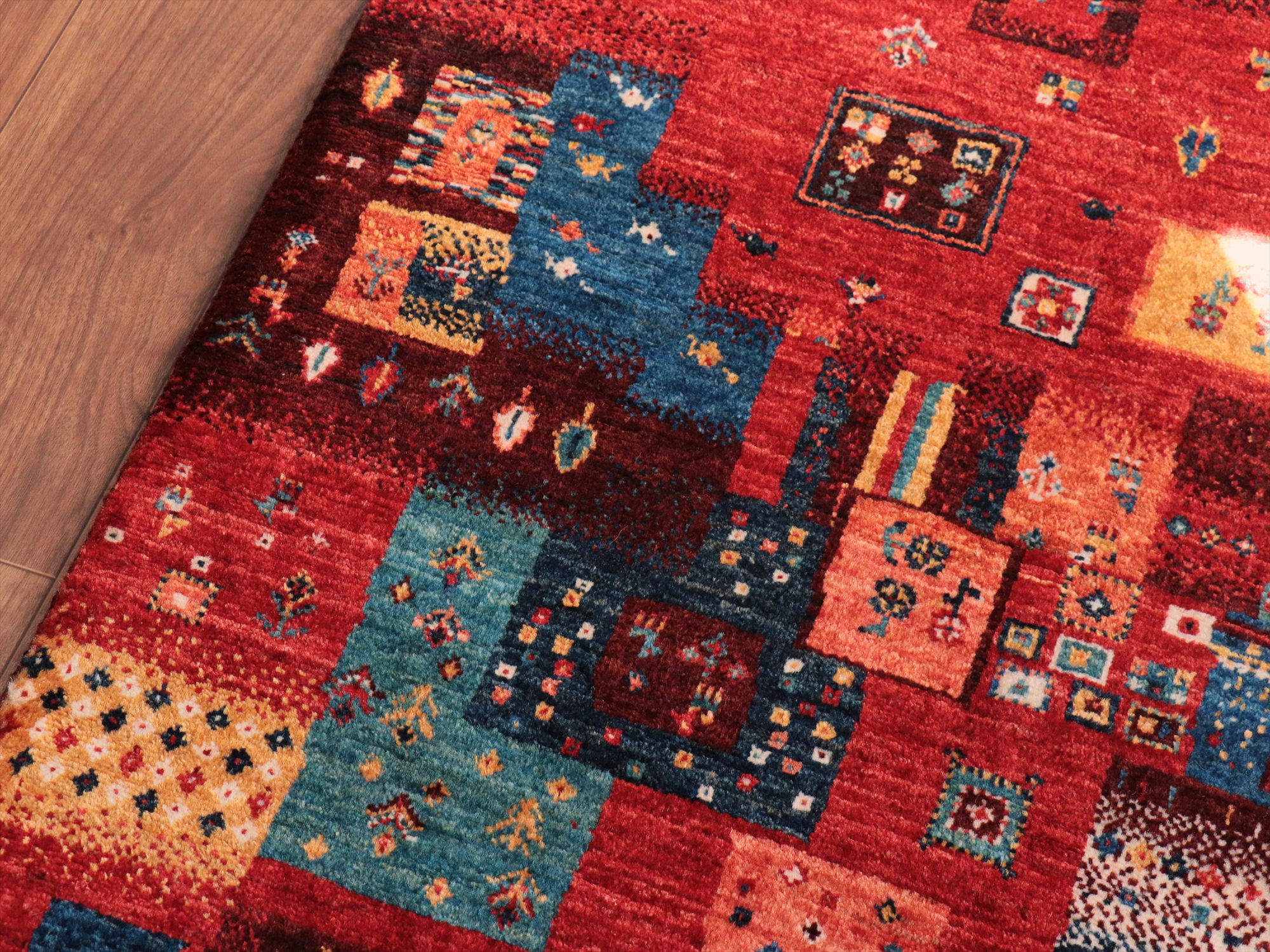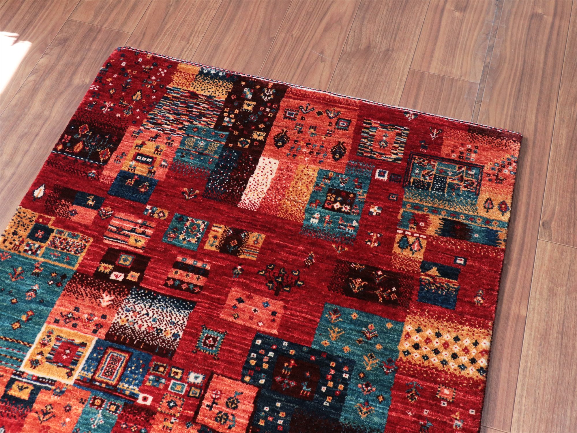 毛足は短く、手触りはやわらかく滑らかです。表面には光沢があります。パイルを含めたギャベの厚みは、1.2-1.3cm程度。