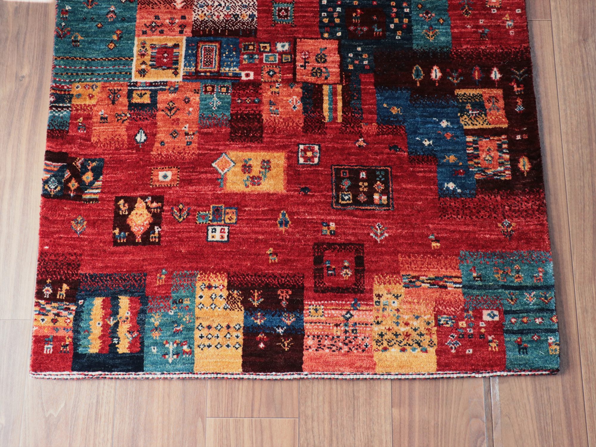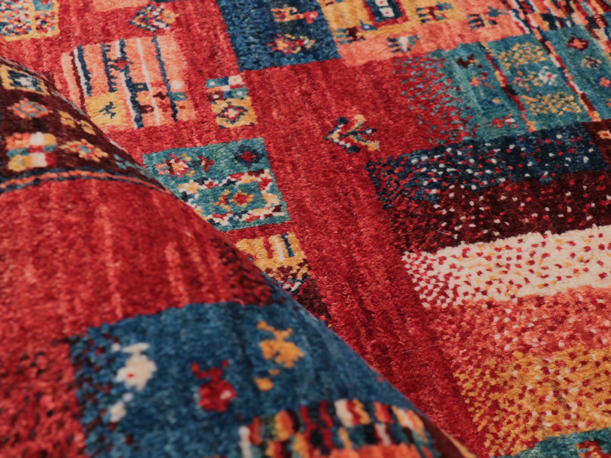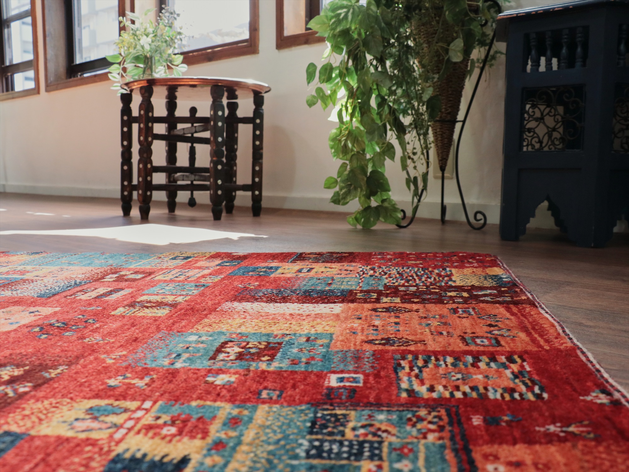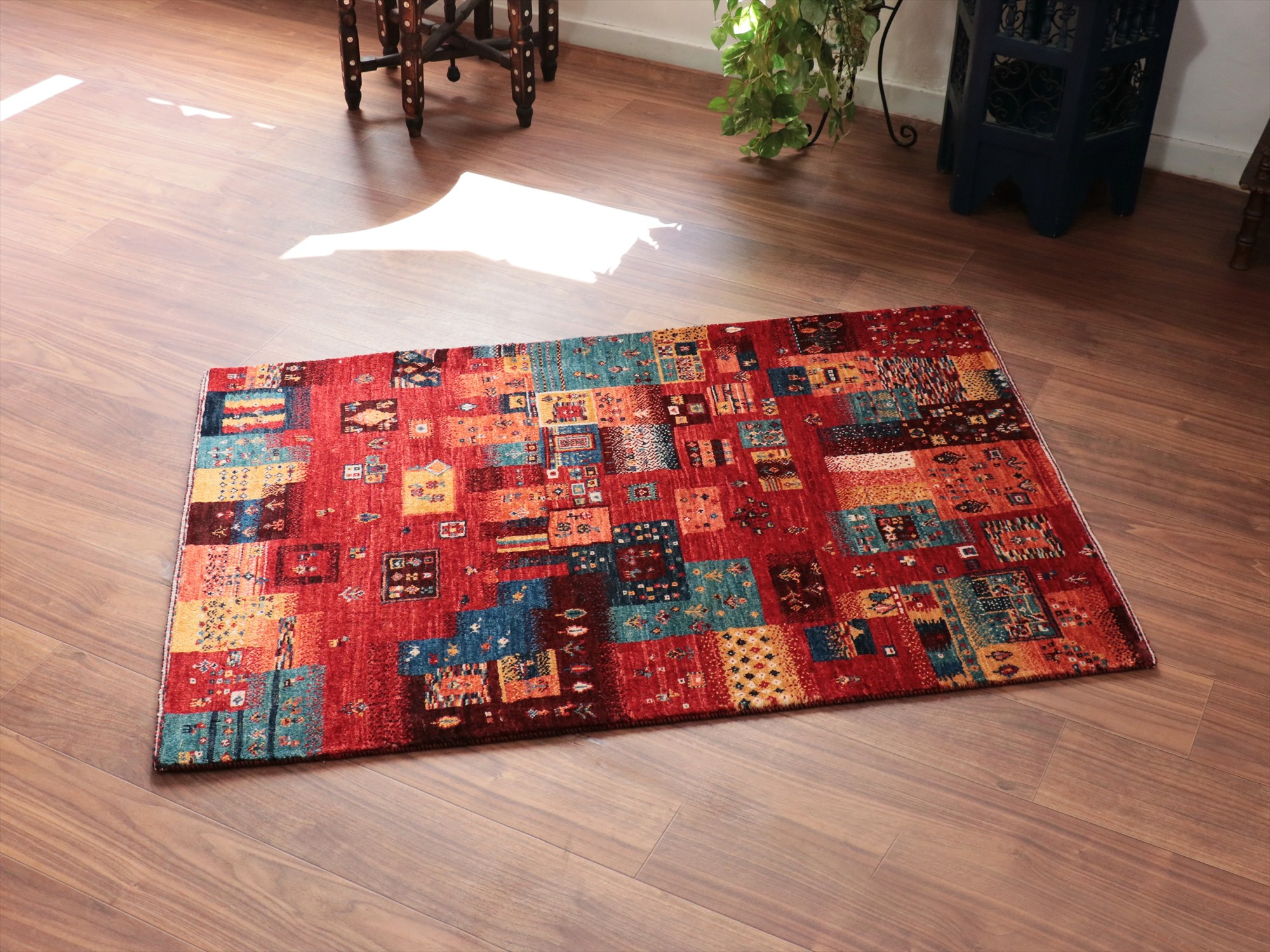 毛足は短く、手触りはやわらかく滑らかです。表面には光沢があります。パイルを含めたギャベの厚みは、1.2-1.3cm程度。