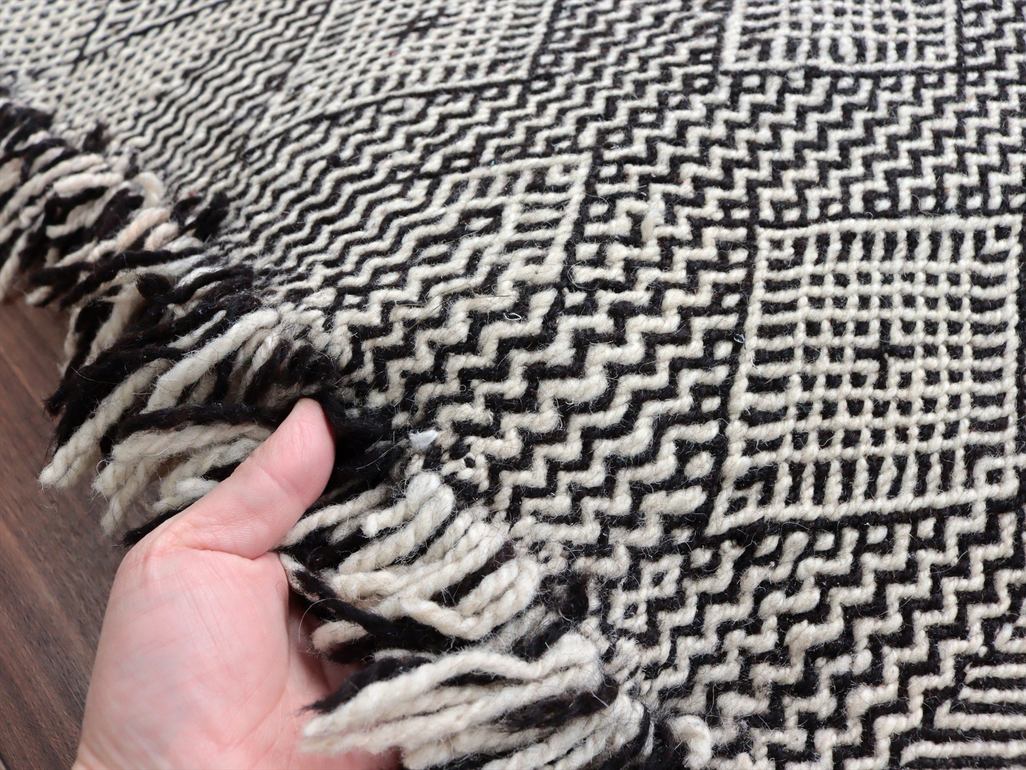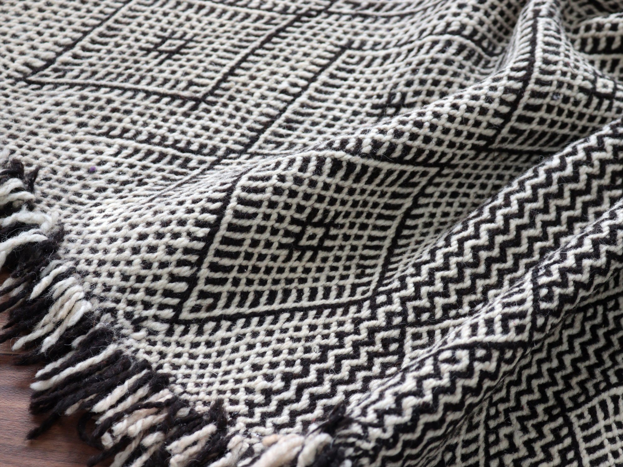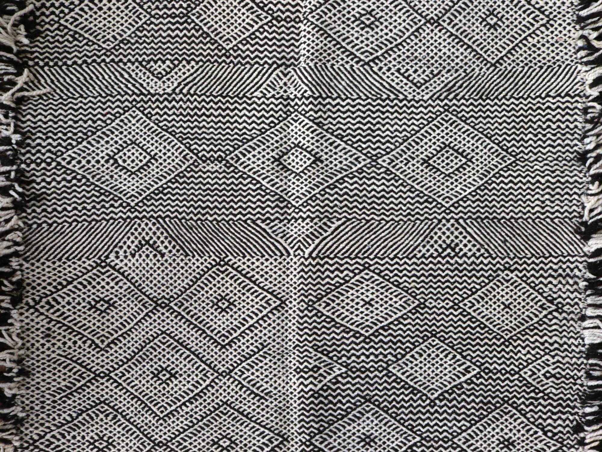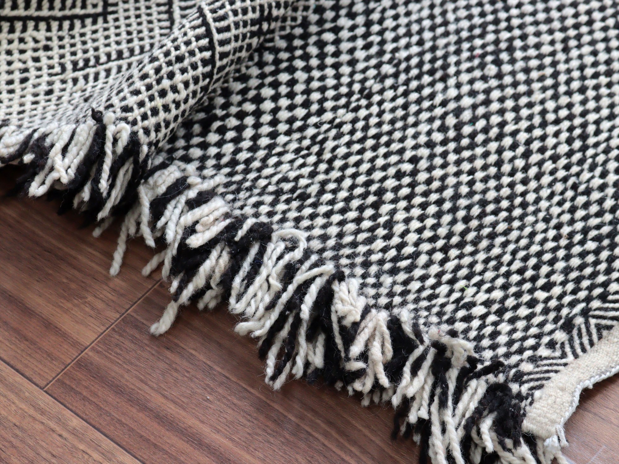 モロッコのラグらしく、太めの毛糸を使ってふっくらした織り、7-8mmほどの厚みがあります。左右の房は、横糸をそのまま切りっぱなしにしてありますが、ほどけないように処理されています。