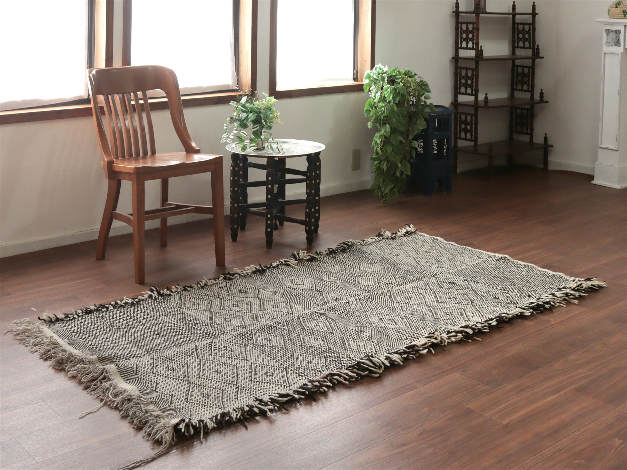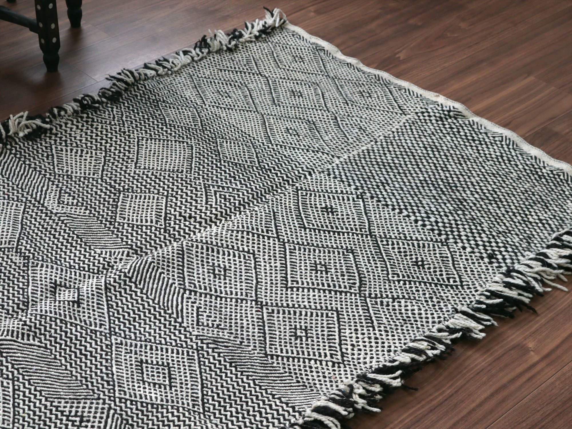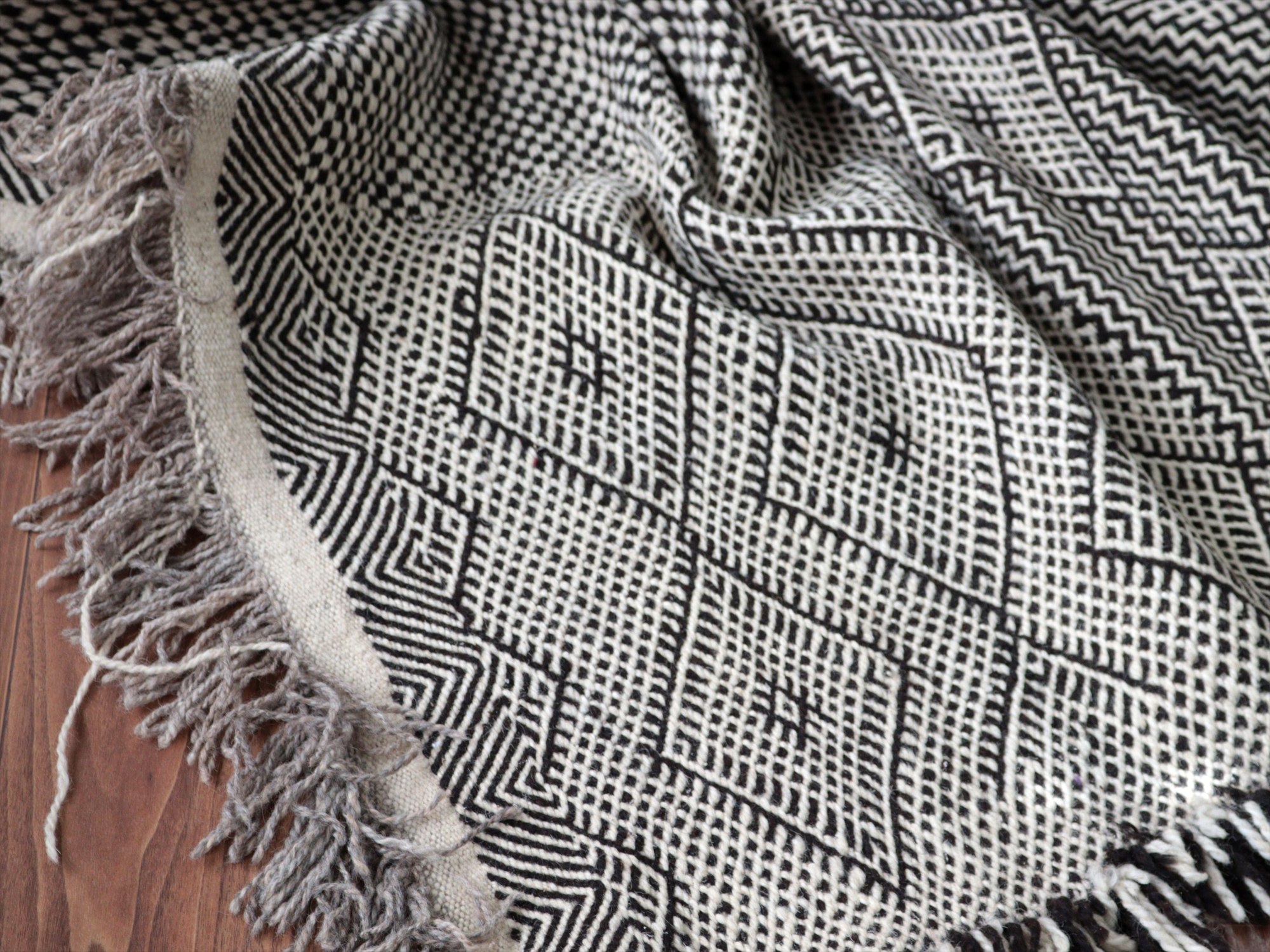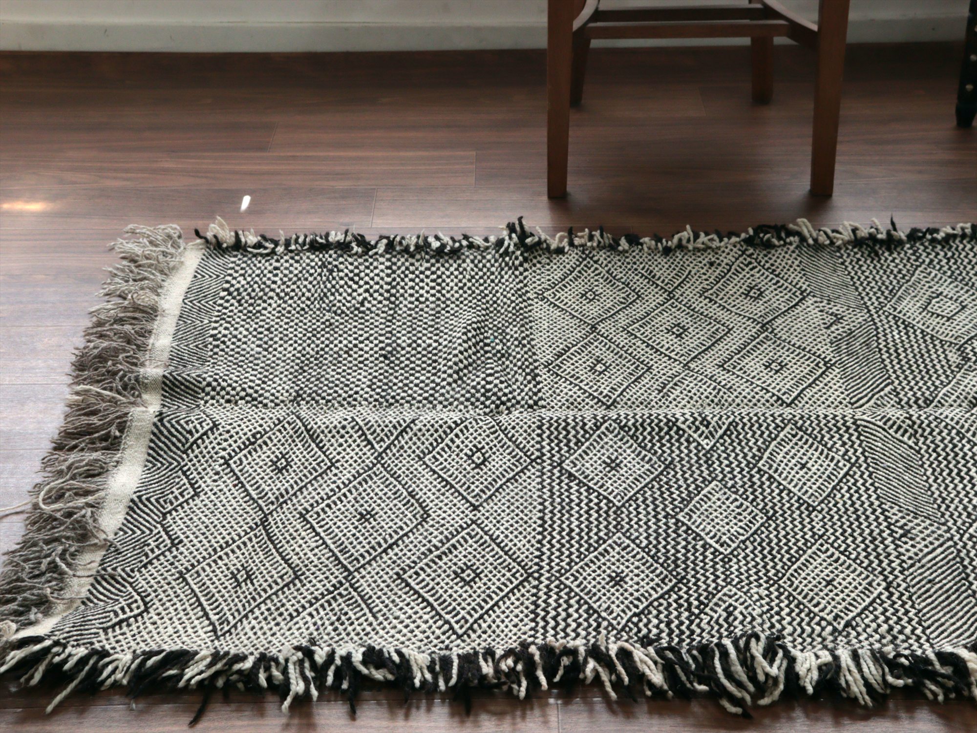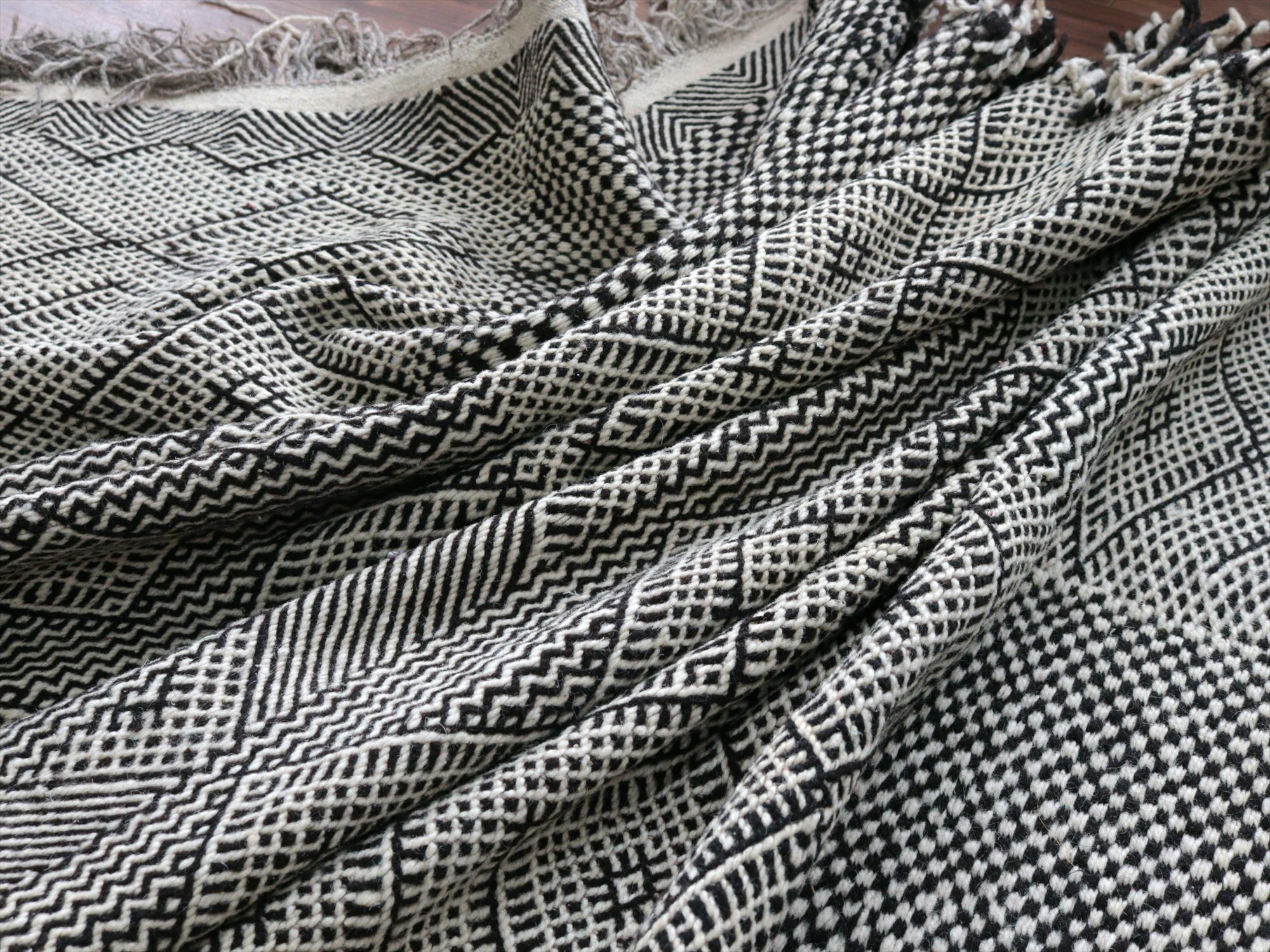 モロッコのラグらしく、太めの毛糸を使ってふっくらした織り、7-8mmほどの厚みがあります。左右の房は、横糸をそのまま切りっぱなしにしてありますが、ほどけないように処理されています。