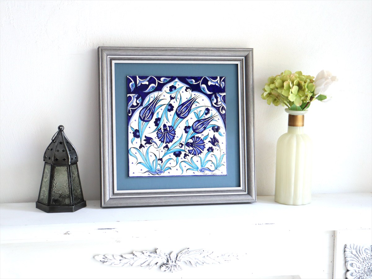 トルコを代表する花であるチューリップ&カーネーションを色鮮やかに描いた絵柄は、近年トルコで浸透し始めているモダンデザイン。独特のトルコスタイルが凝縮された繊細なデザインは、現地の職人によって1枚ずつ手描きされたものです。シルバーのフレームがブルータイルを引き立てています。