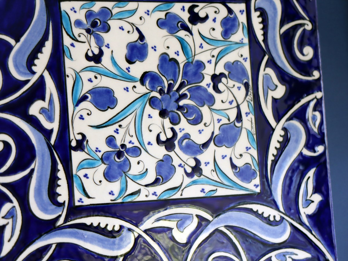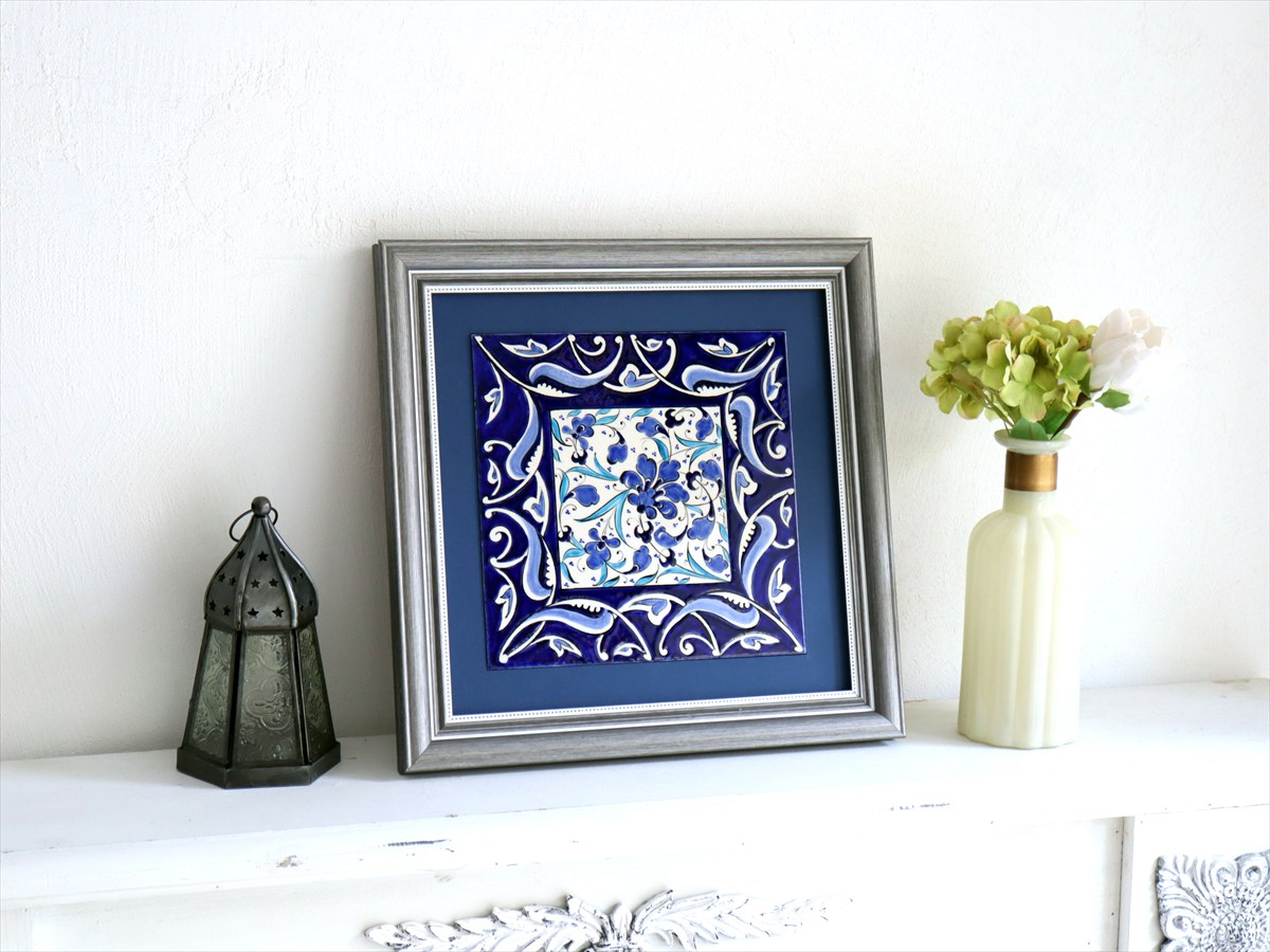 ブルーフラワーデザインを鮮やかに描いた絵柄は、近年トルコで浸透し始めているモダンデザイン。独特のトルコスタイルが凝縮された繊細なデザインは、現地の職人によって1枚ずつ手描きされたものです。シルバーのフレームがブルータイルを引き立てています。