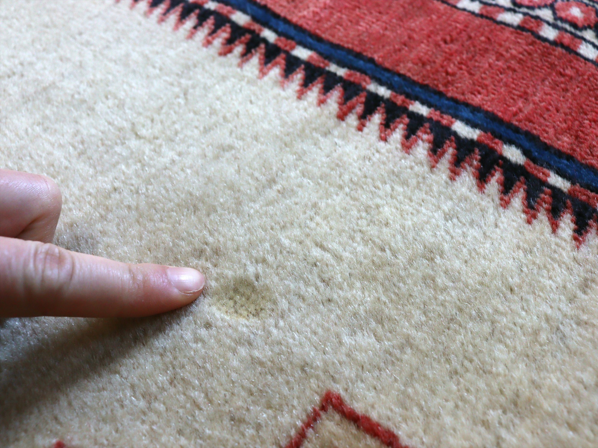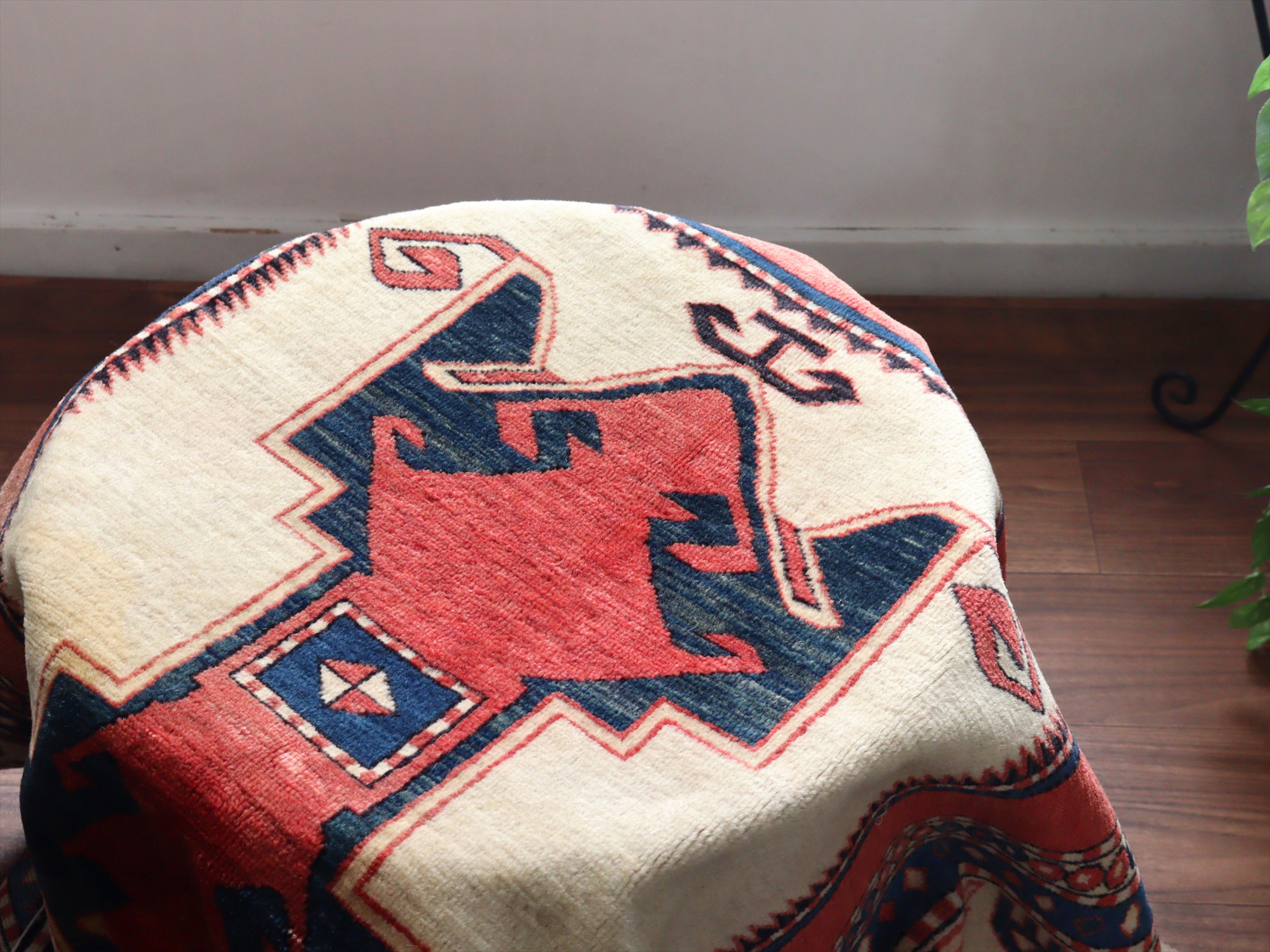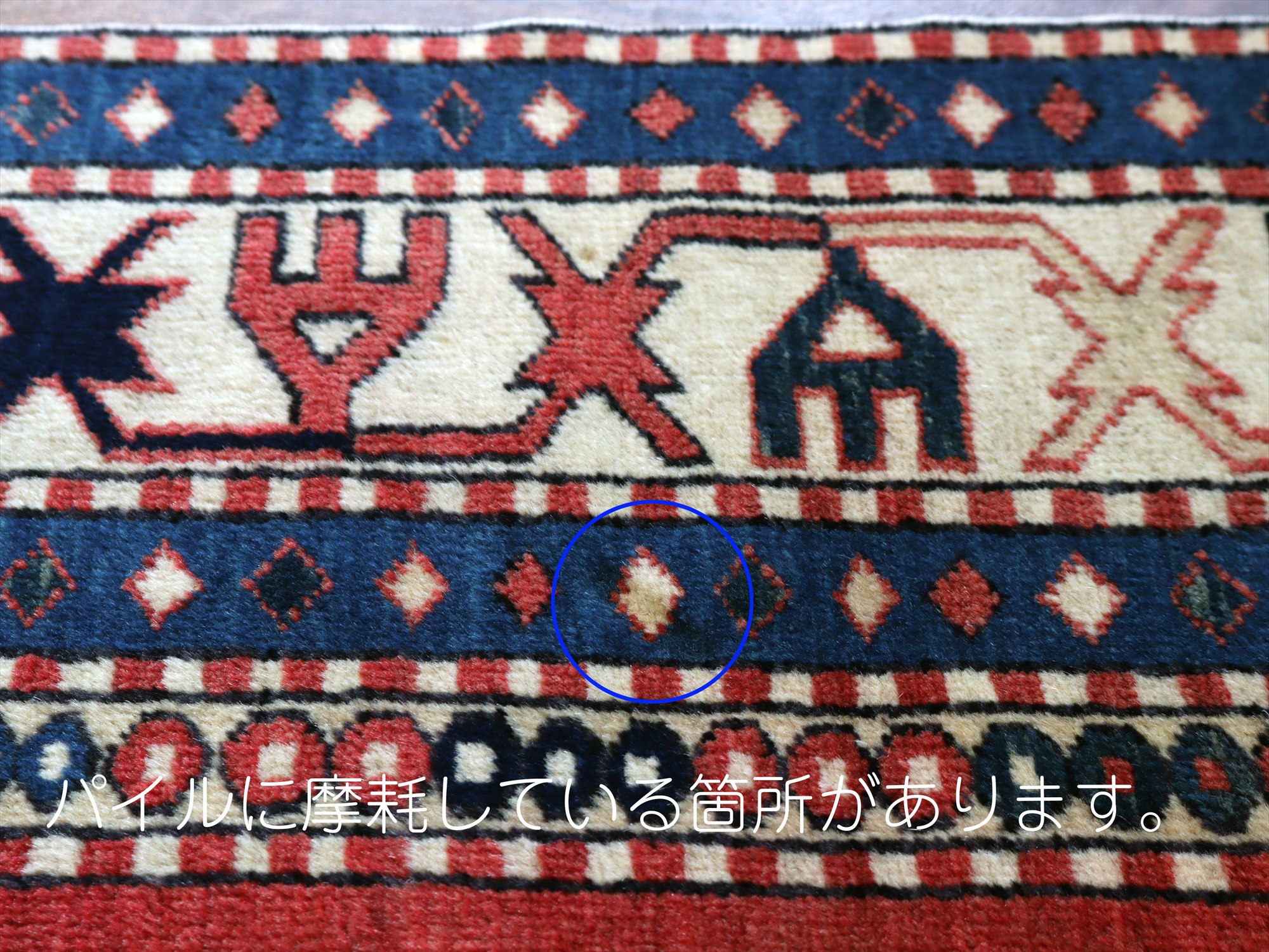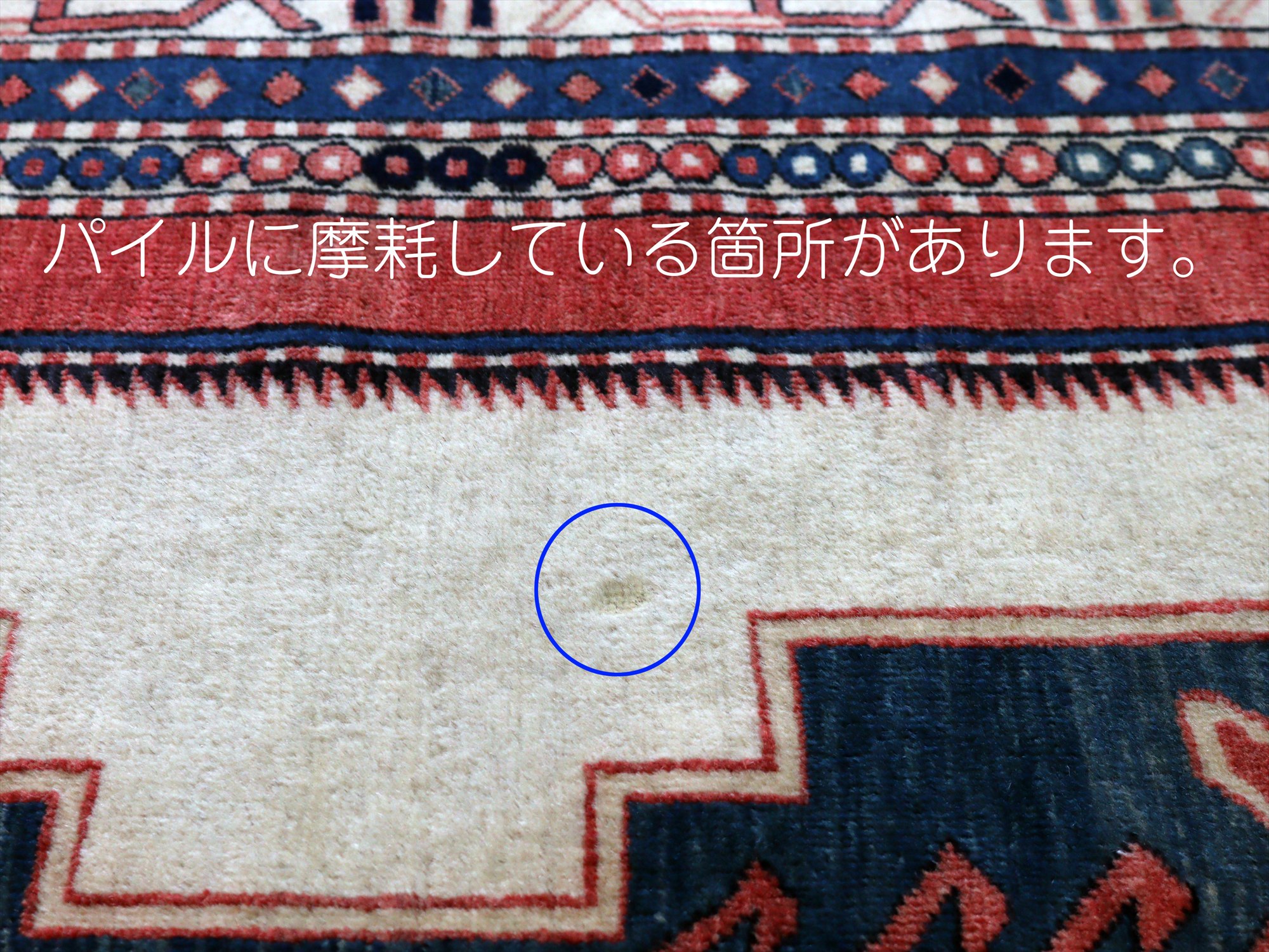 べーズを含めたラグの厚みは5mm程で、パイルは短くすっきりとしています。一部パイルに削れている箇所があります(写真をご参照ください)。そのほかは大きいダメージもなくきれいな状態です。