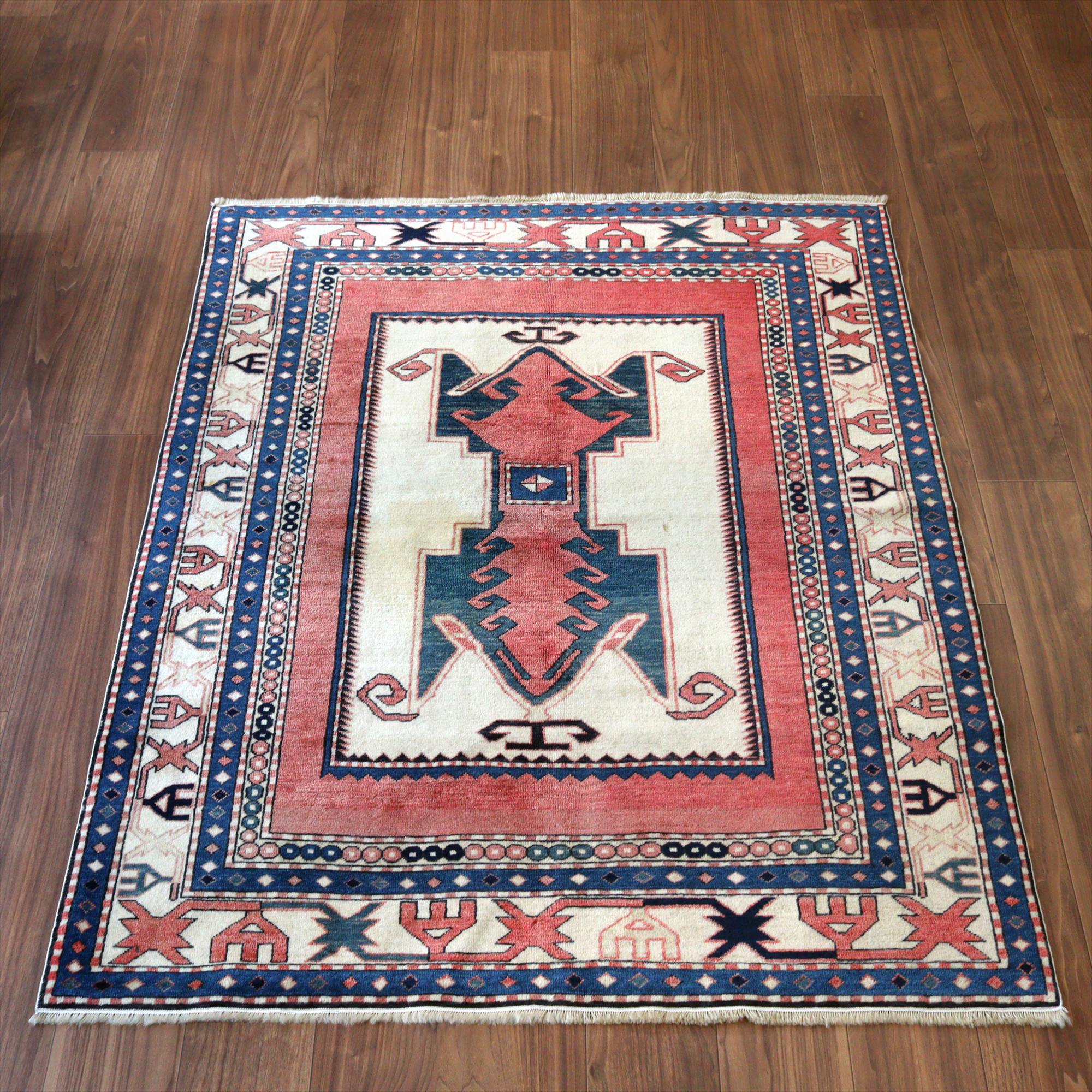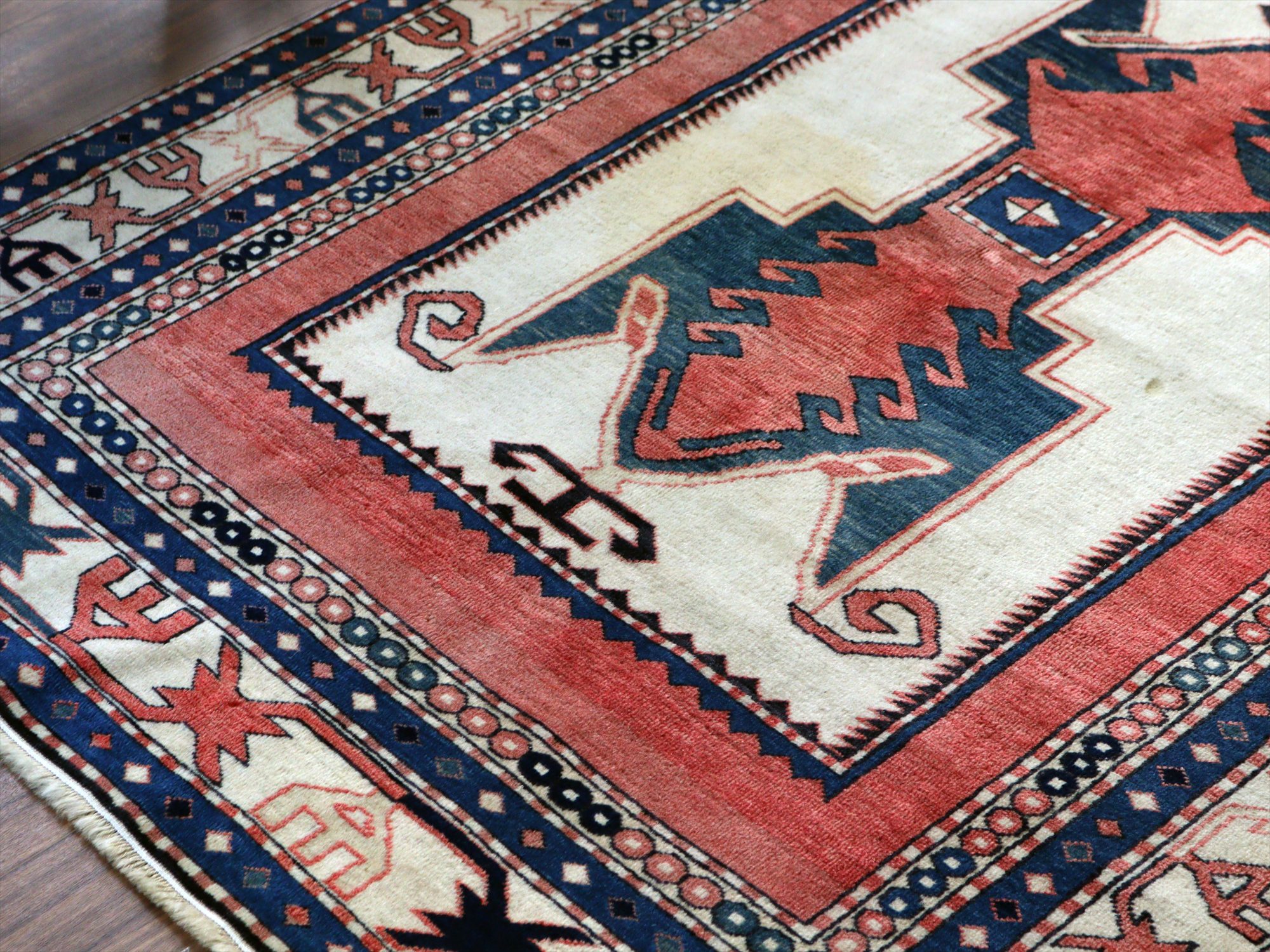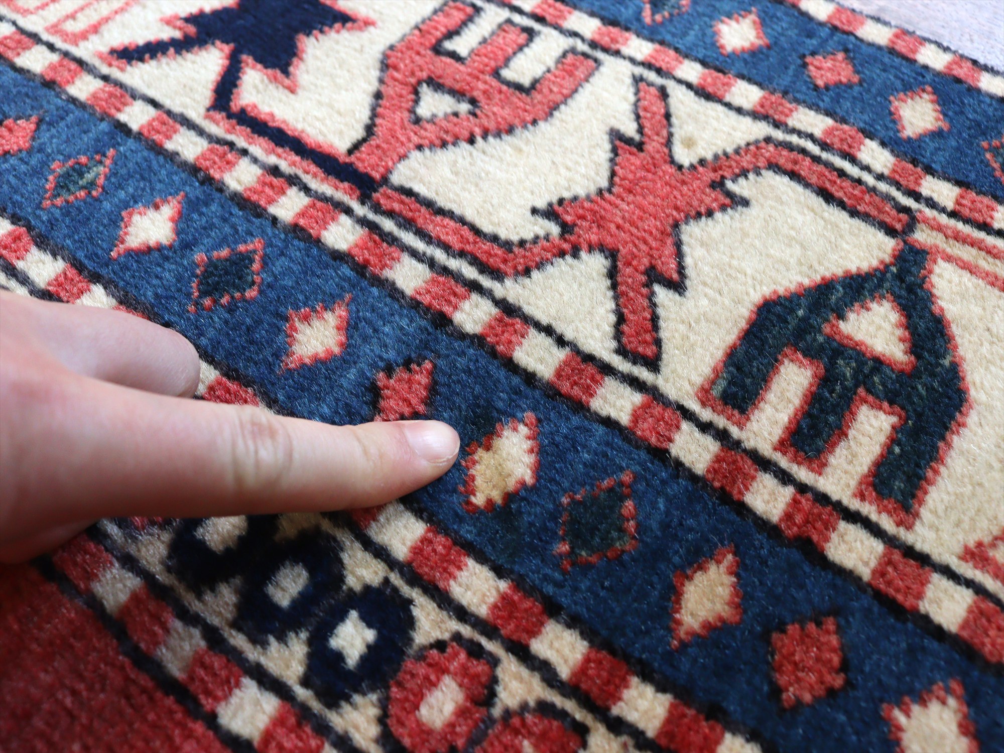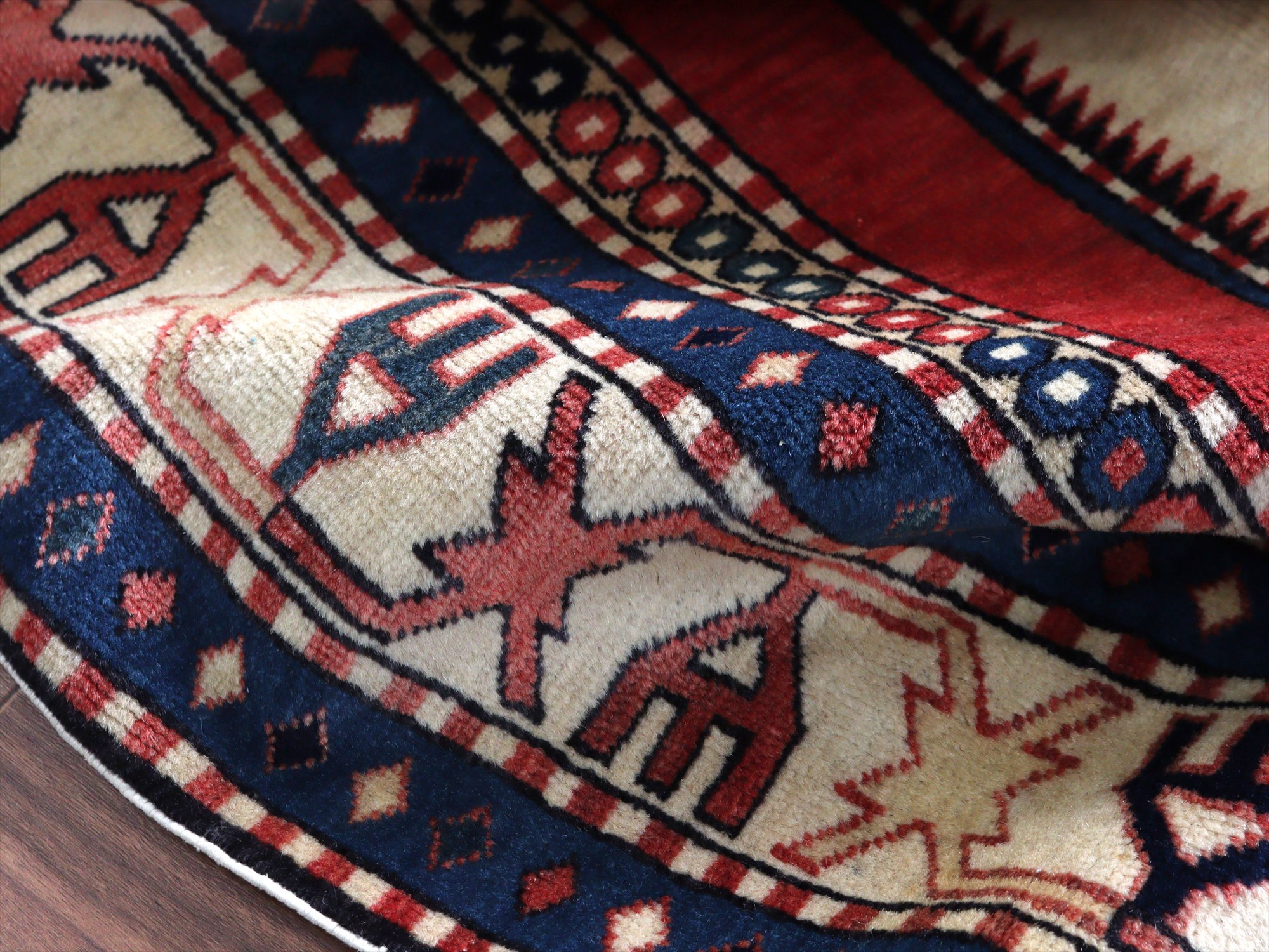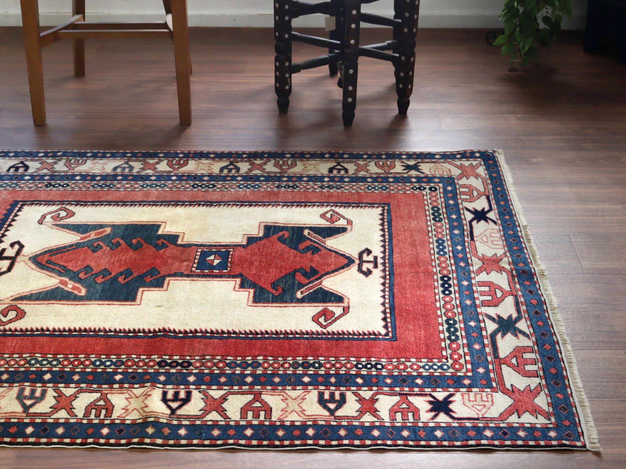 べーズを含めたラグの厚みは5mm程で、パイルは短くすっきりとしています。一部パイルに削れている箇所があります(写真をご参照ください)。そのほかは大きいダメージもなくきれいな状態です。