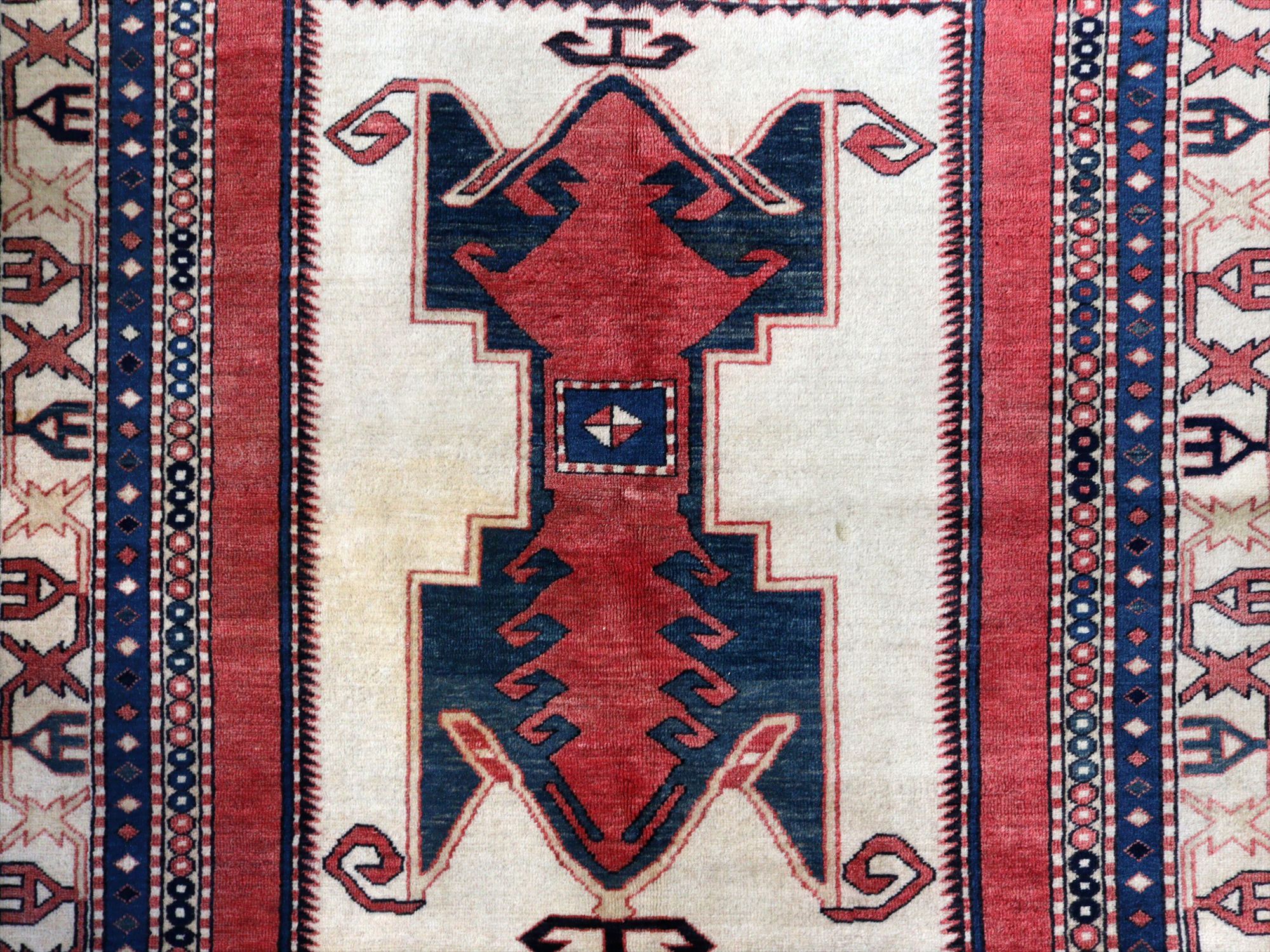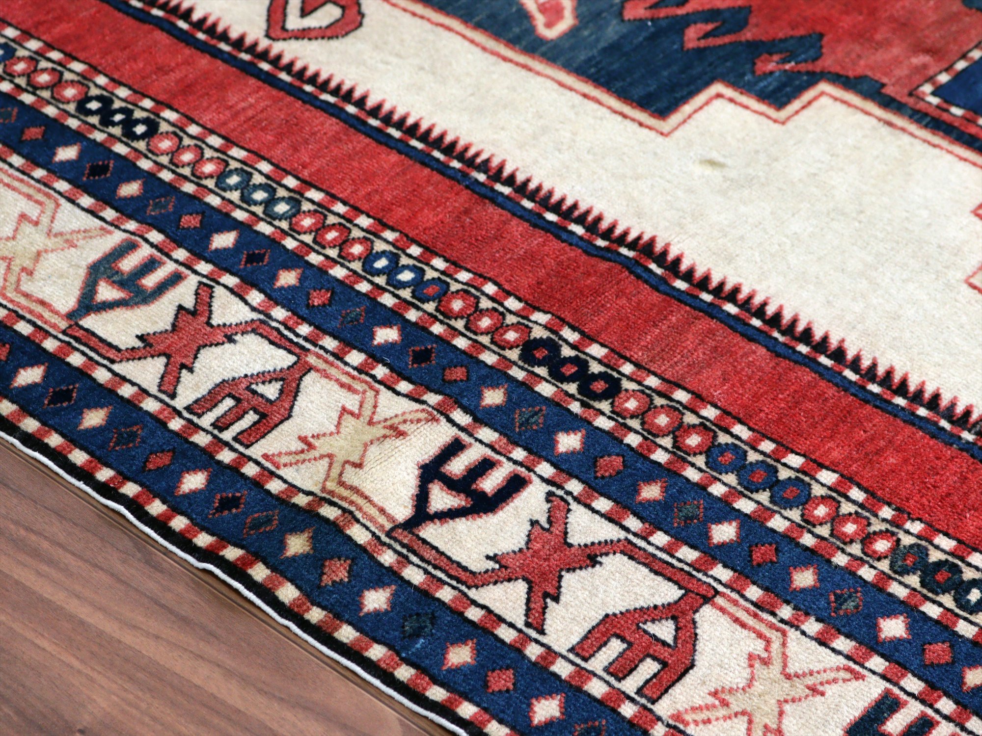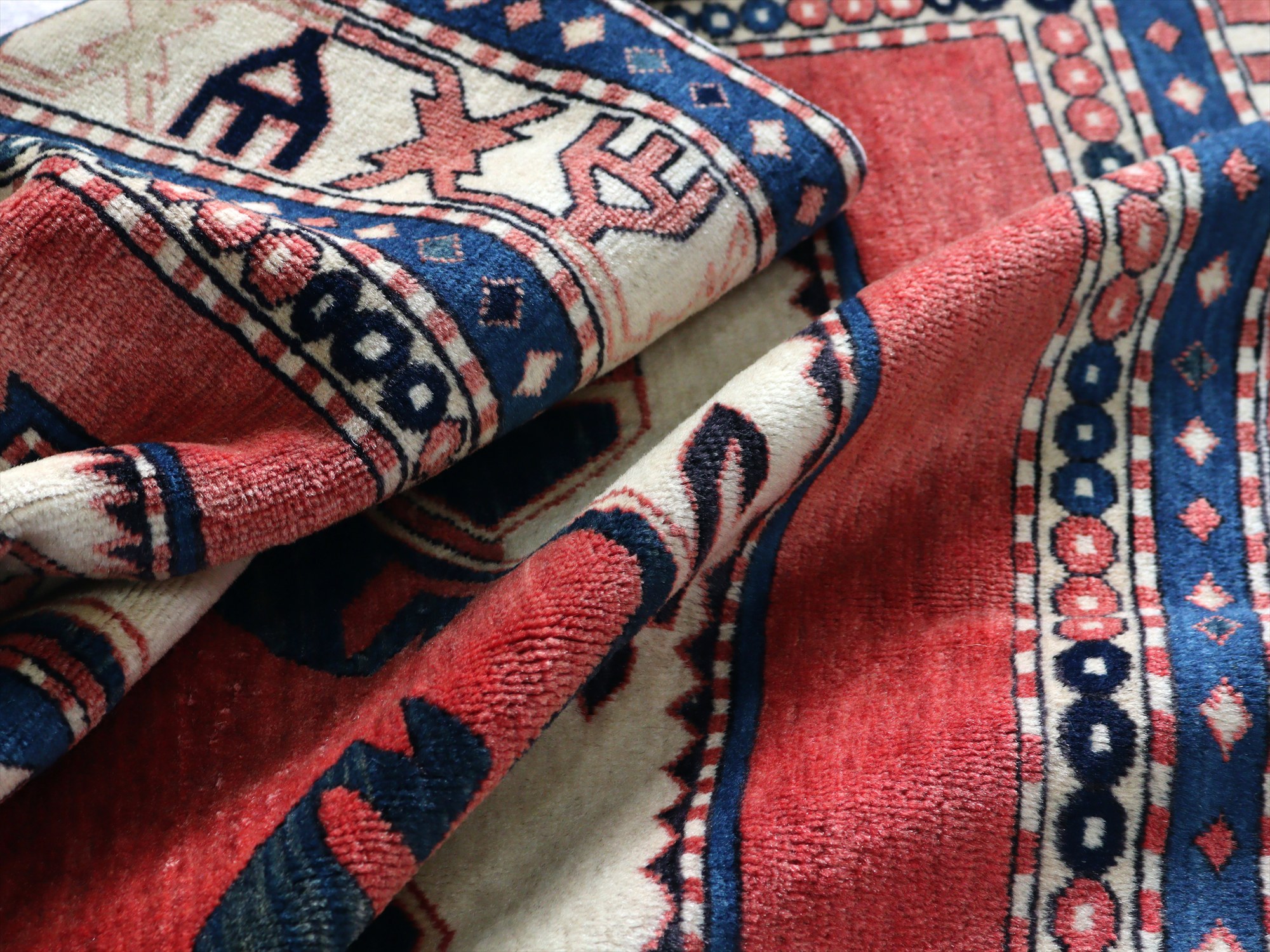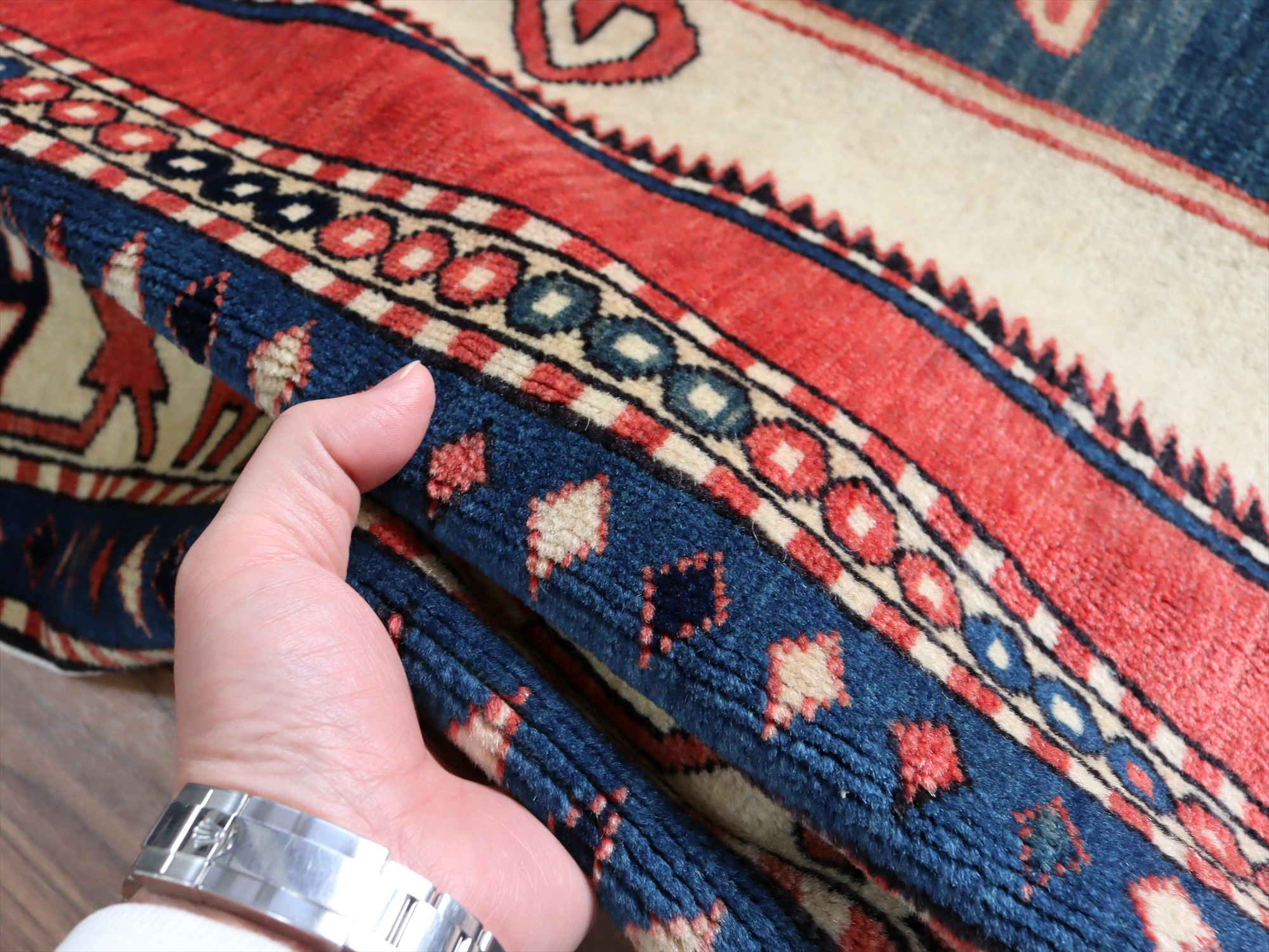 べーズを含めたラグの厚みは5mm程で、パイルは短くすっきりとしています。一部パイルに削れている箇所があります(写真をご参照ください)。そのほかは大きいダメージもなくきれいな状態です。