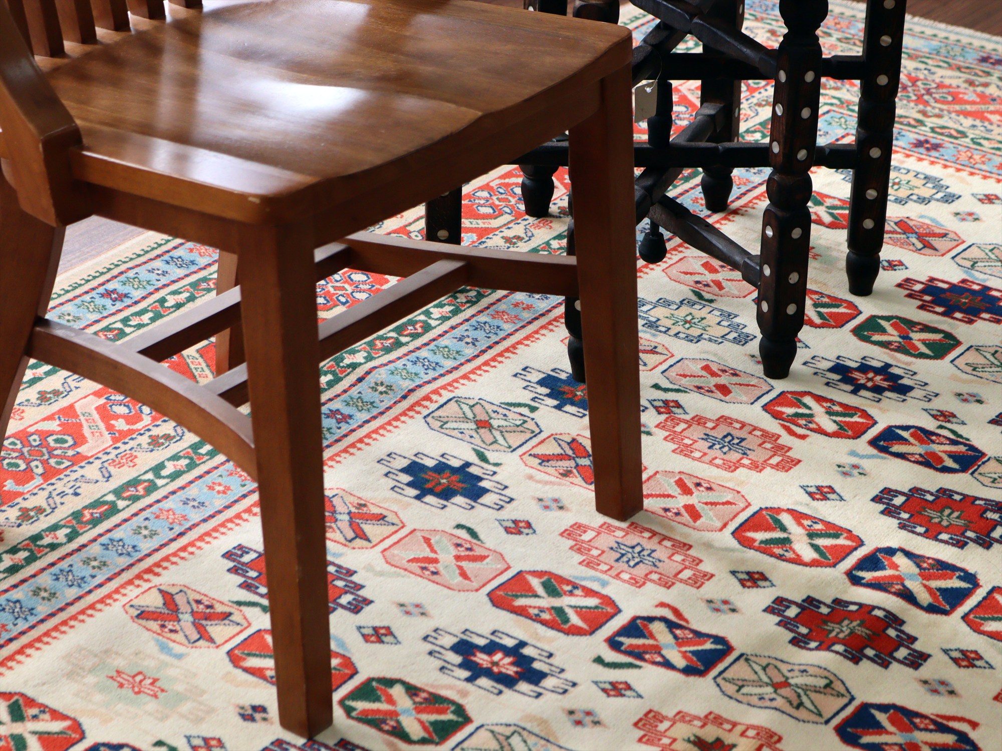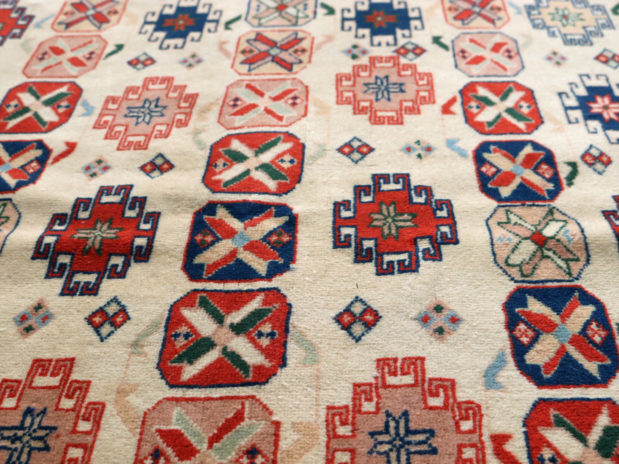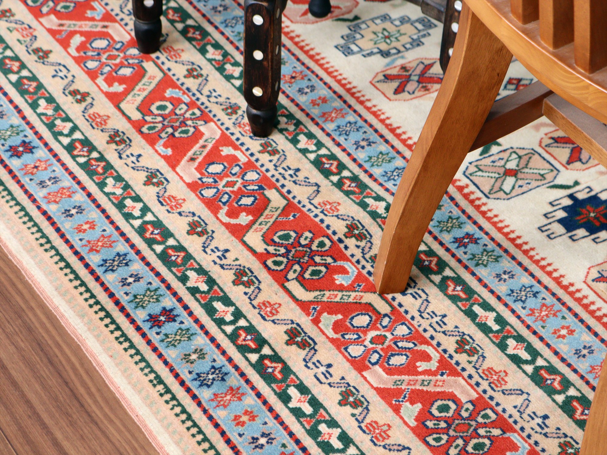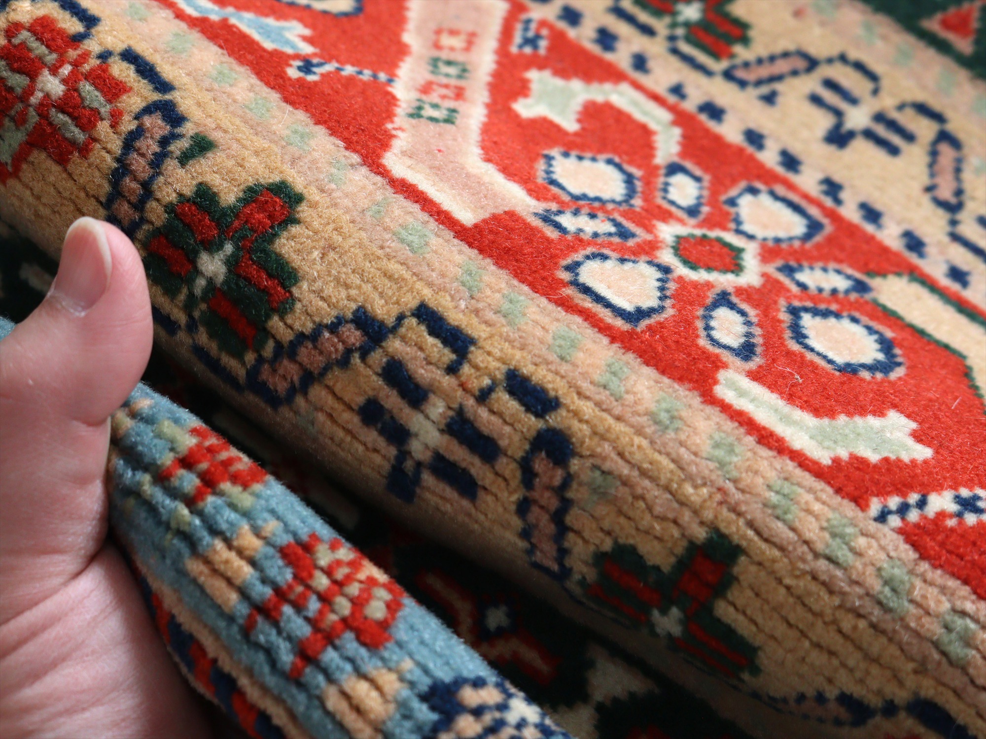 縦糸にはコットンが使われています。また、パイルの長さが比較的均一で整っていることから、もともと輸出向けに工房で織られたものと思われます。