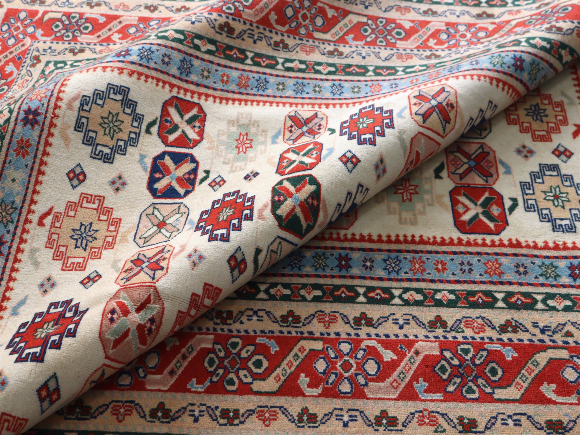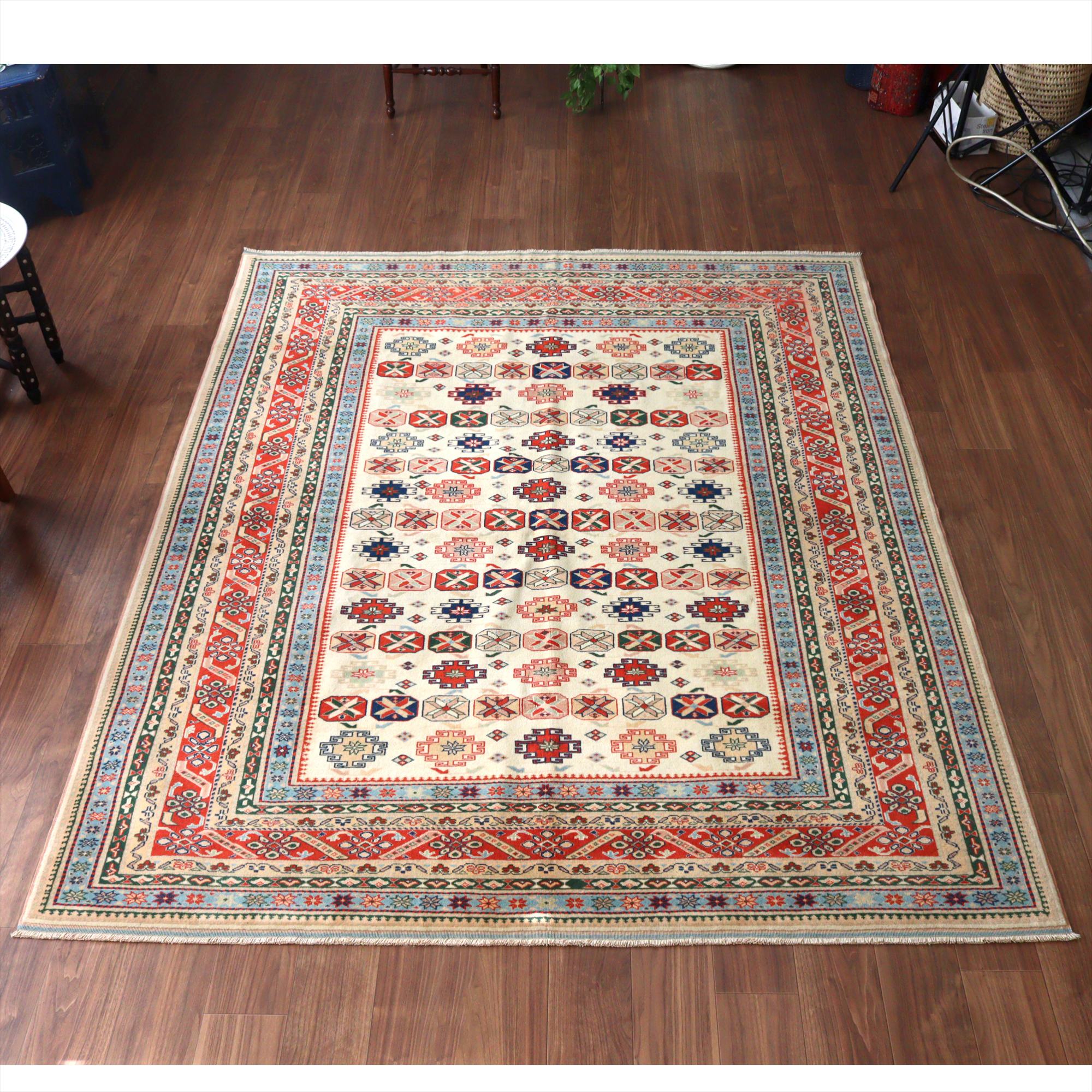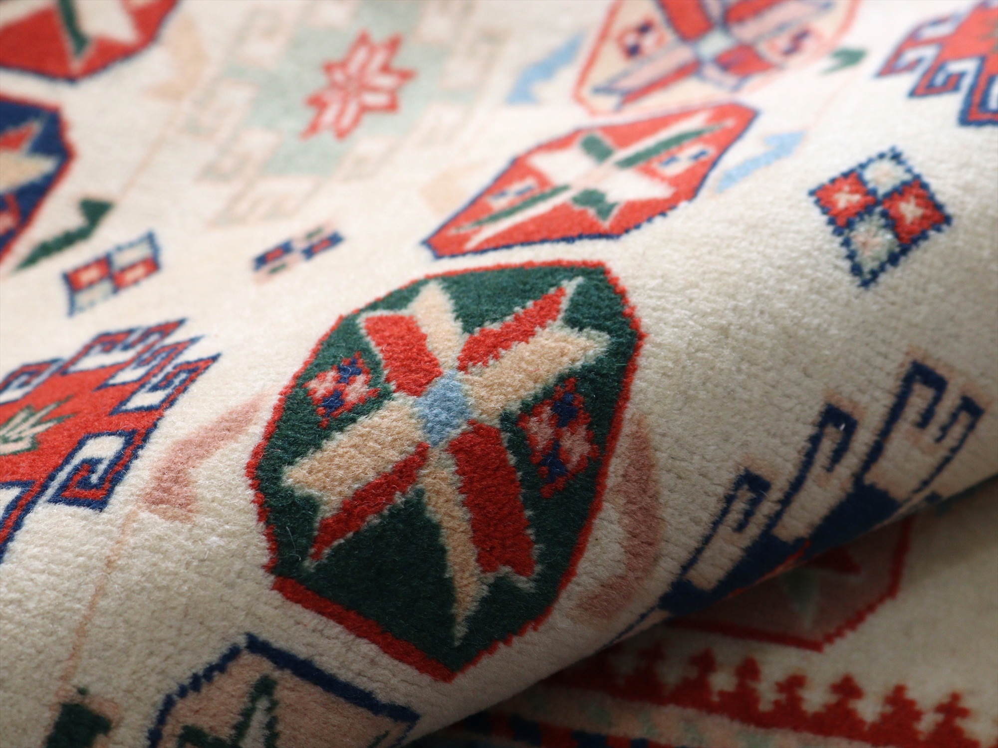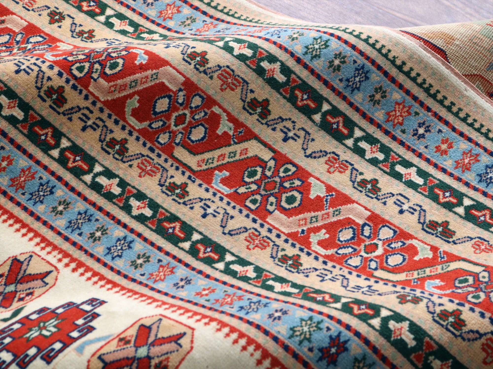 縦糸にはコットンが使われています。また、パイルの長さが比較的均一で整っていることから、もともと輸出向けに工房で織られたものと思われます。