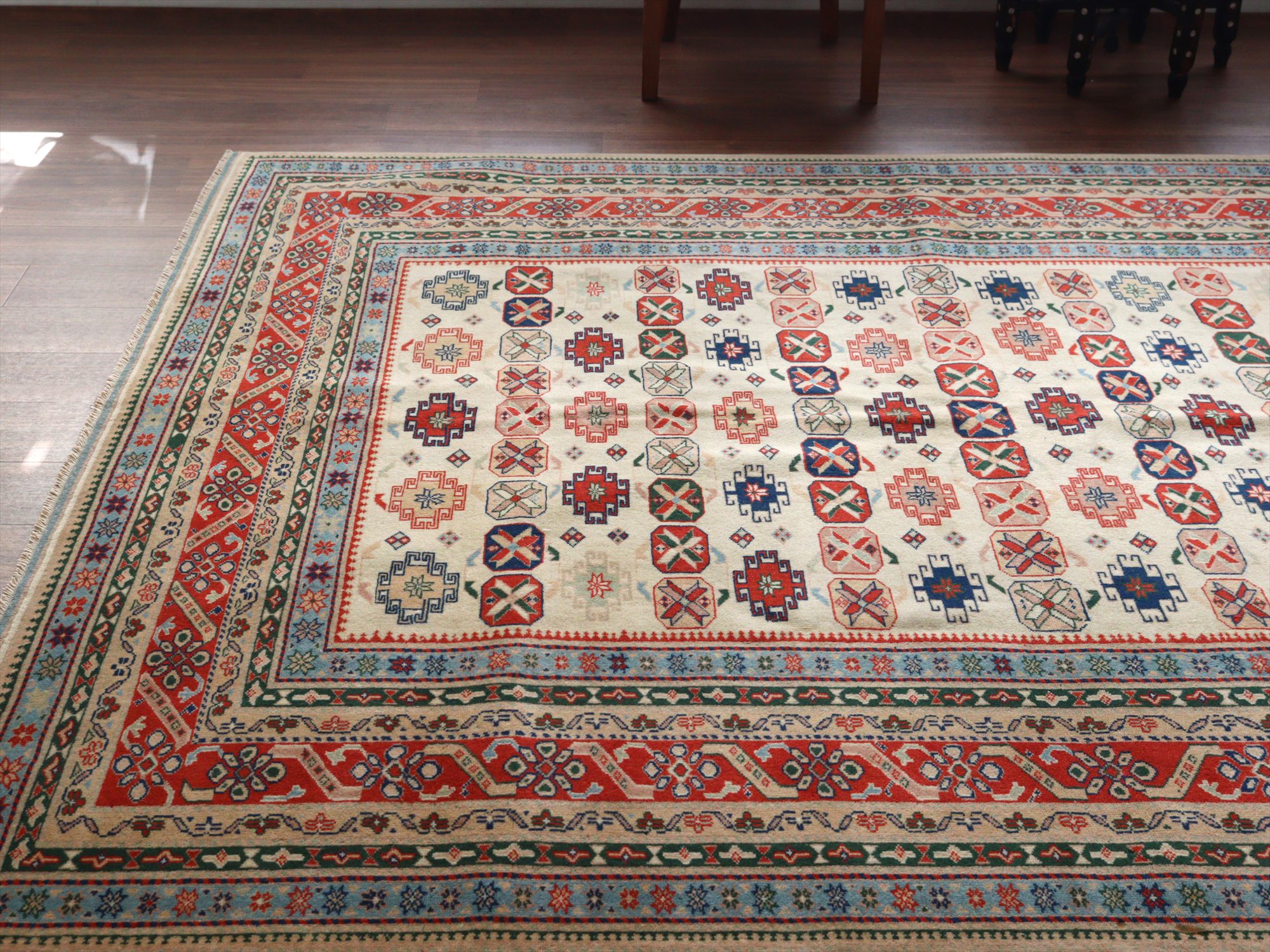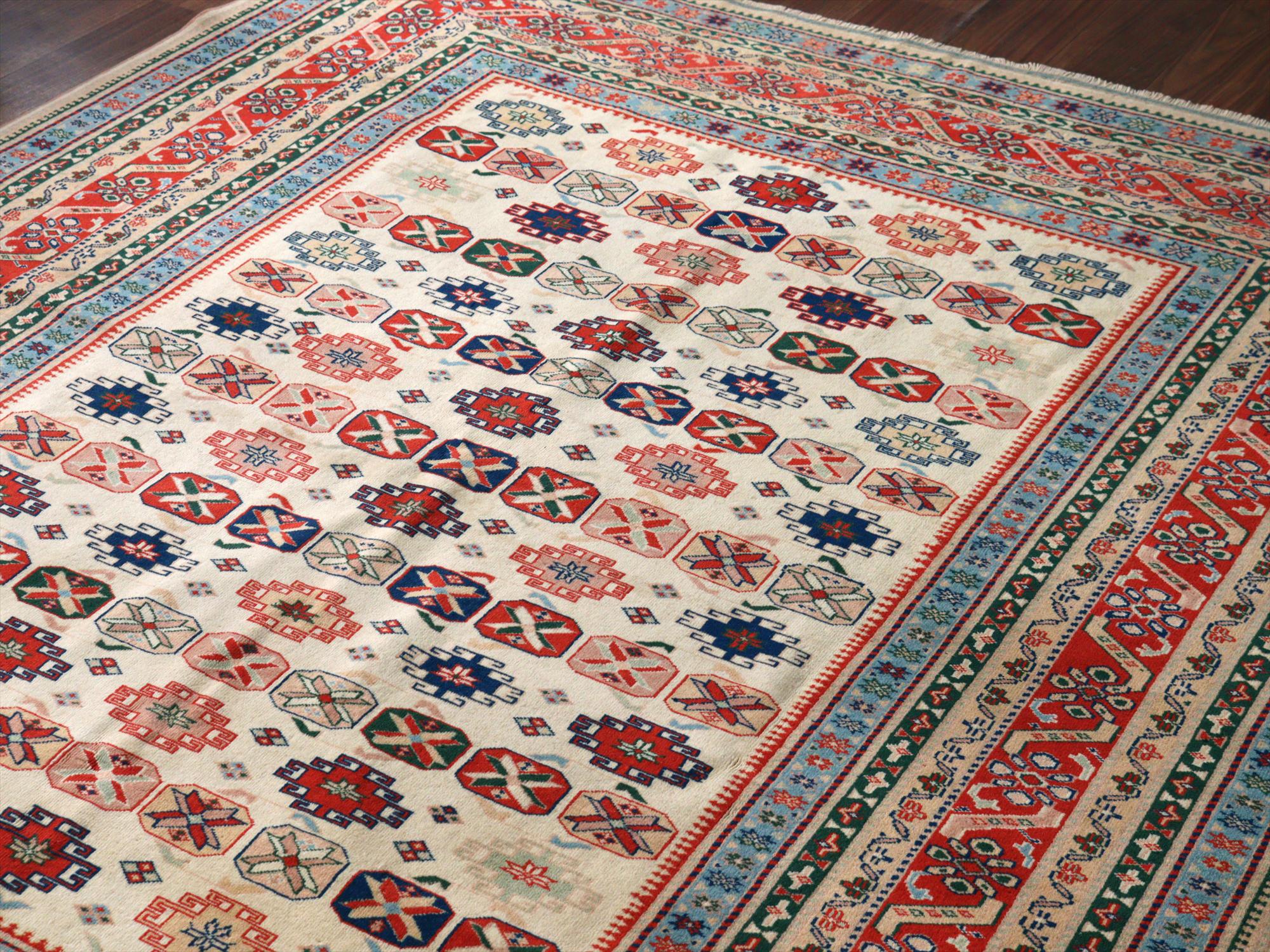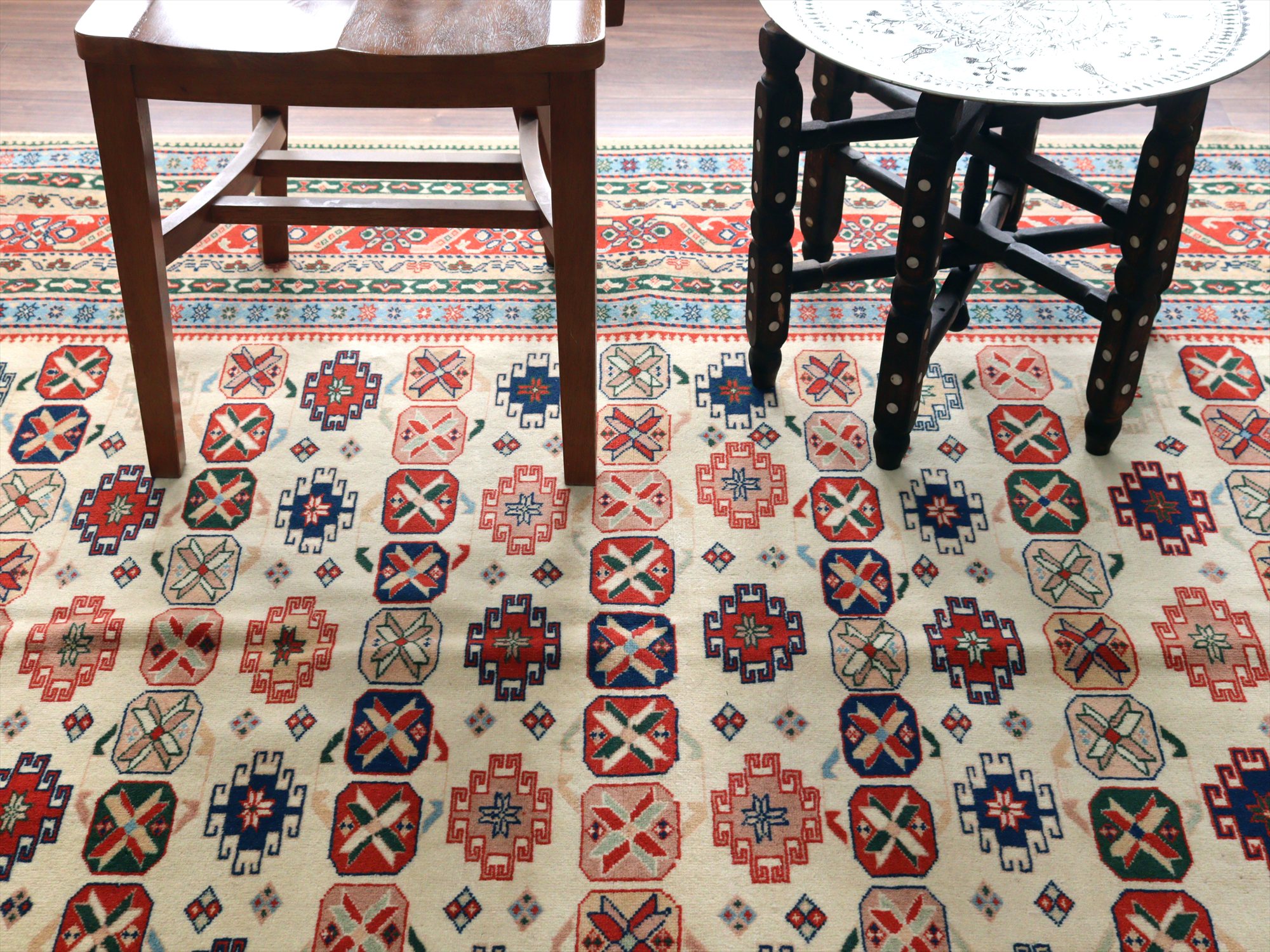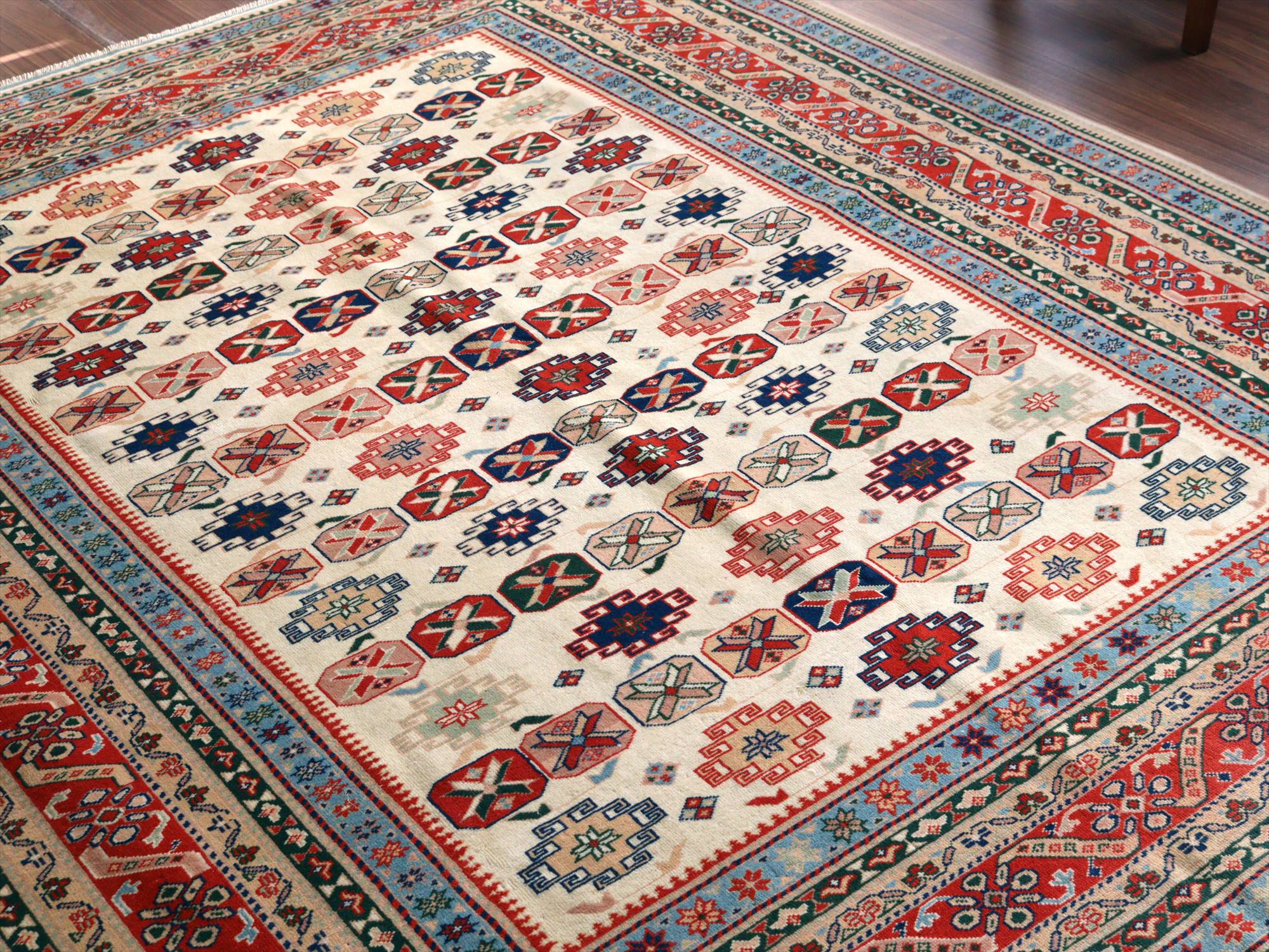 縦糸にはコットンが使われています。また、パイルの長さが比較的均一で整っていることから、もともと輸出向けに工房で織られたものと思われます。